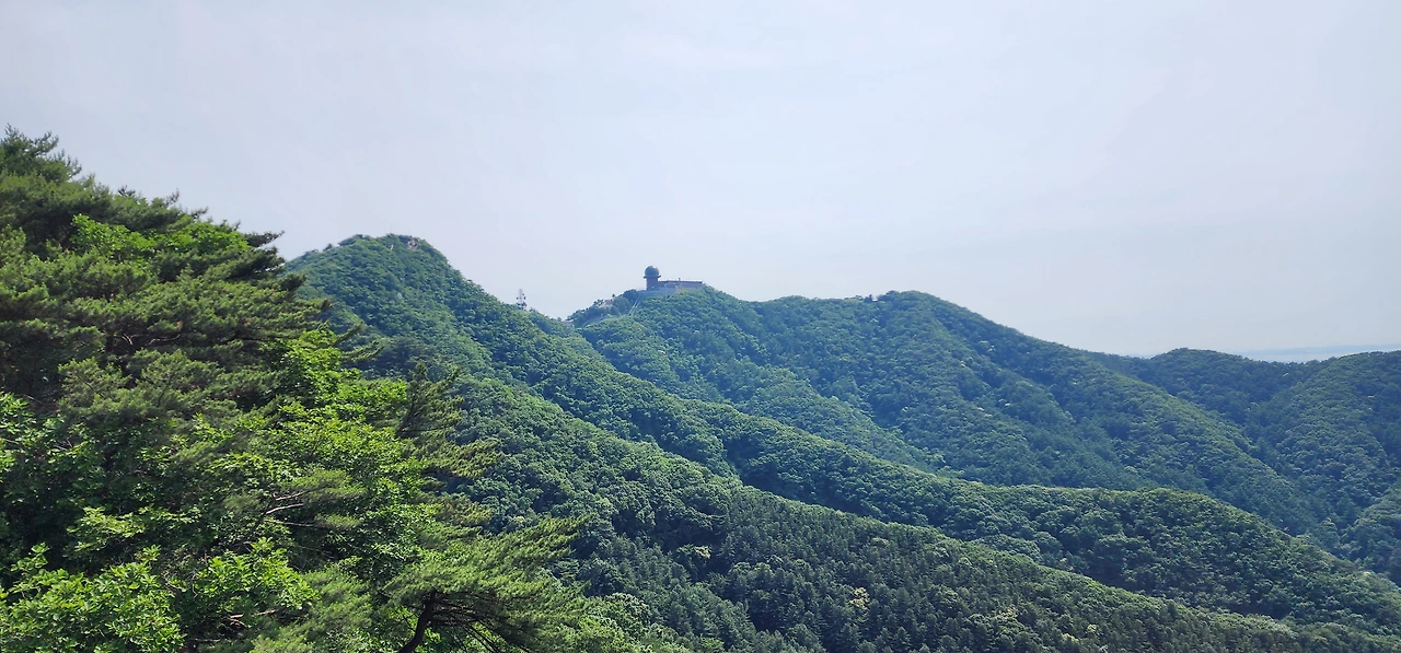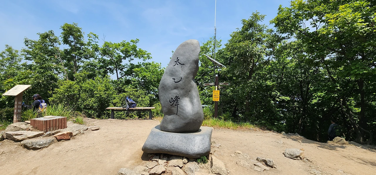 관모봉에서는 태을봉이 빤히 올려다 보인다. 평탄한 길을 걷다가 막바지에 조금 경사가 있다. 관모봉보다 좀 더 높은 태을봉인데 전망이 기가 막힌 관모봉과 달리 태을봉에선 아무것도 보이지 않는다. 사방이 숲으로 둘러싸여 있기 때문이다. 이제 길고 긴 능선길이 시작된다. 슬기봉을 향하여...