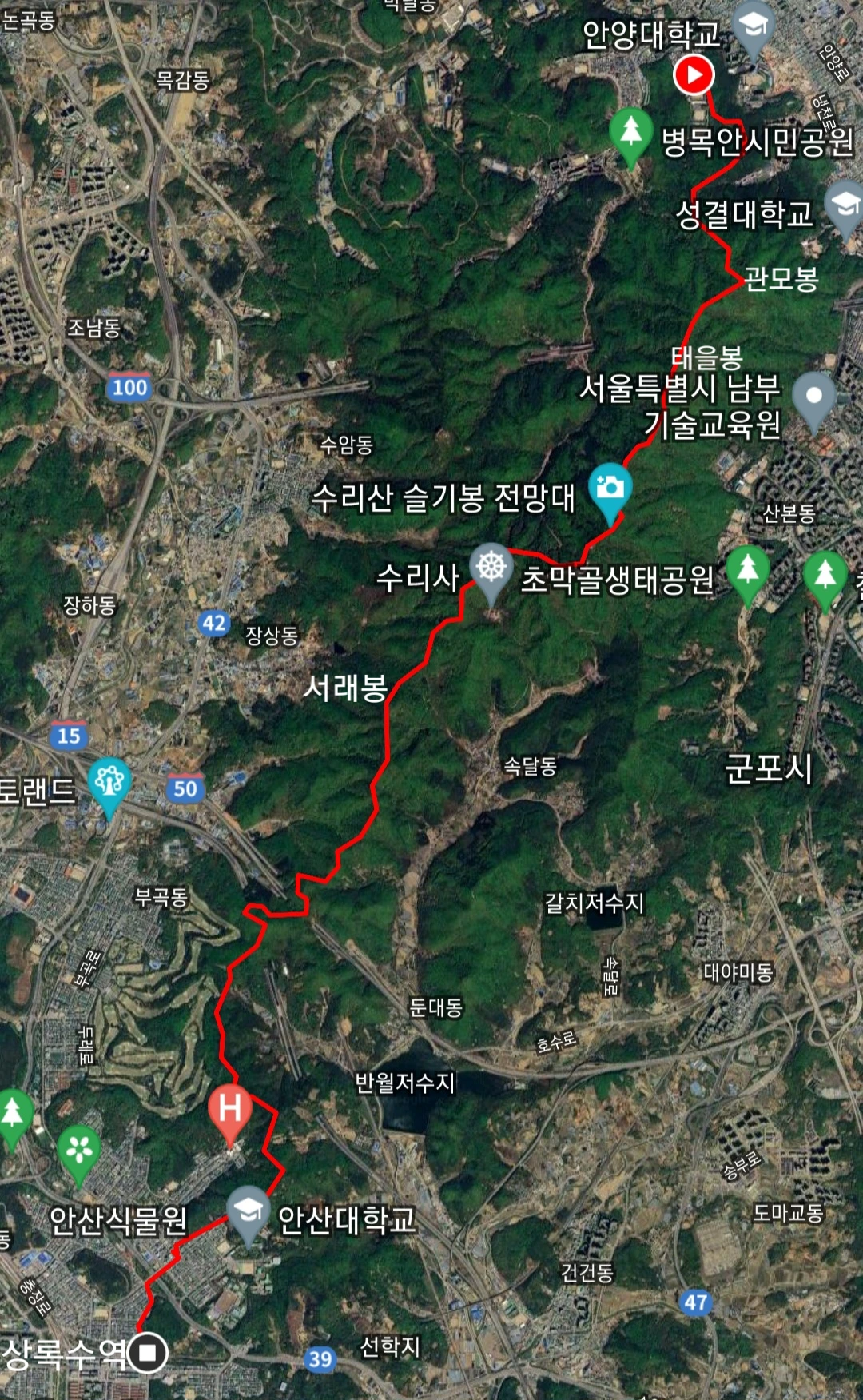 갑자기 번화한 거리에 들어섰고 치맥을 즐기는 사람들이 즐겁게 이야기하고 있었다. 나도 편의점에 가서 캔콜라를 사서 간절히 수분을 원하던 내 몸 안으로 폭포처럼 탄산음료를 넣어주었다. 상록수역까지 걸어가 전철을 타고 무사히 귀가했고... 수리산을 북에서 남으로 길게 걸었다. 걸을 수 있다니 얼마나 행복한지 모르겠다.