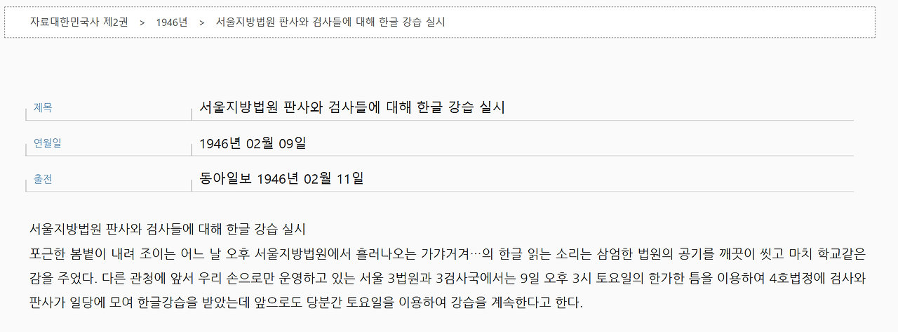 국사편찬위원회가 제공하는 <자료대한민국사>를 읽다가 눈에 띄는 기사를 발견했다. '서울지방법원 판사와 검사들에 대해 한글 강습 실시'라는 제목이었다. 판사와 검사들이 한글을 배우다니! 요즘 관념으론 도무지 상상할 수 없는 일이지만 그땐 그랬던 모양이다. 35년간의 일제 통치 아래서 행정, 사법은 일본어로 행해졌다. 국어는 일본어였다. 일제 말기에는 아예 조선어 말살 정책까지 시행됐으니 우리말은 죽어가고 있었다. 당연히 일제강점기에 판사의 판결문, 검사의 공소장은 일본어로 쓰였다. 판검사들이 한글을 알아야 할 이유가 없었다. 아니, 한글을 배울 기회가 없었는지도 모른다.