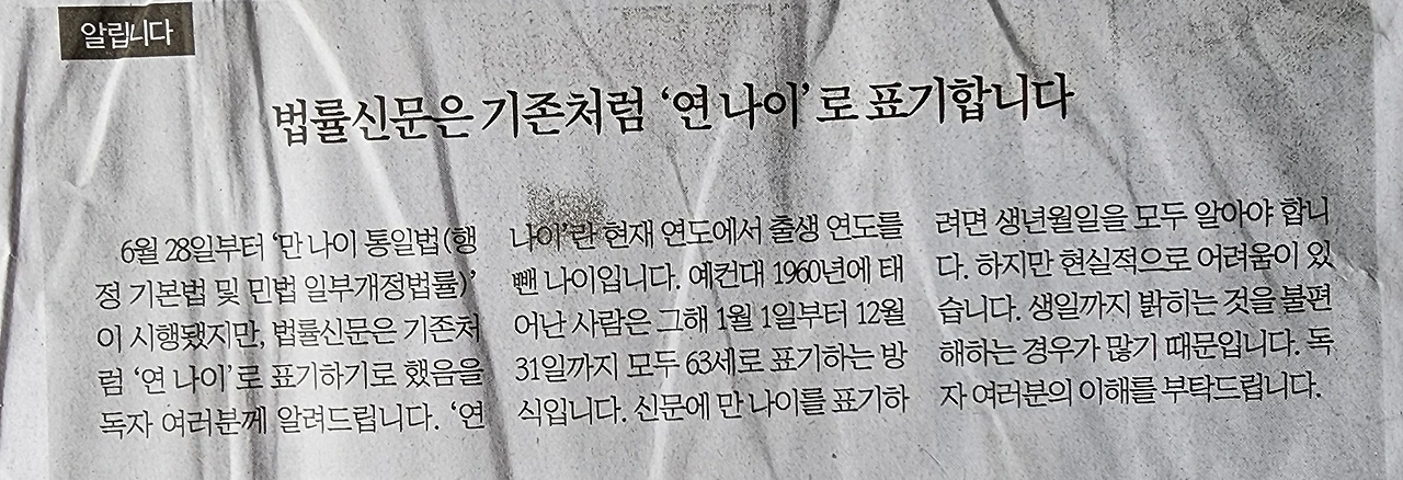법률 분야 전문지로 오랜 전통을 자랑하는 법률신문이 있다. 이 신문 7월 3일자 <알립니다> 난에 법률신문은 기존처럼 '연 나이'로 표기합니다라는 제목의 알림이 떴다. 6월 28일부터 '만 나이 통일법(행정기본법 및 민법)'이 시행되었지만 법률신문은 종전대로 연 나이를 쓰겠다는 내용이었다.