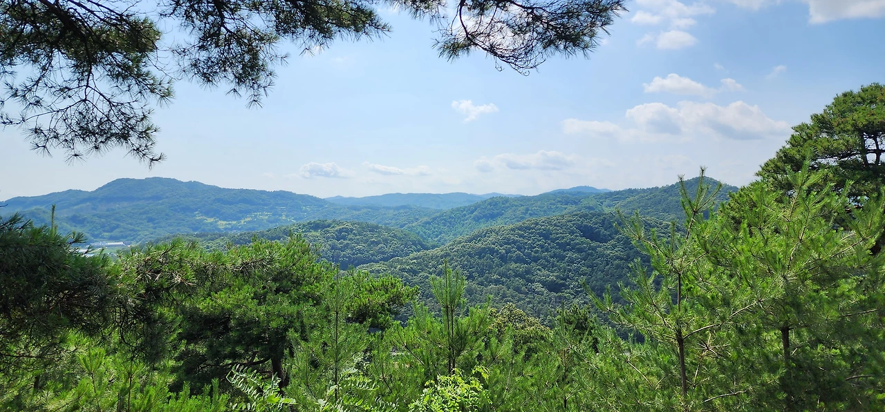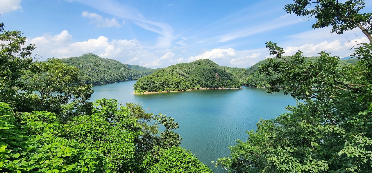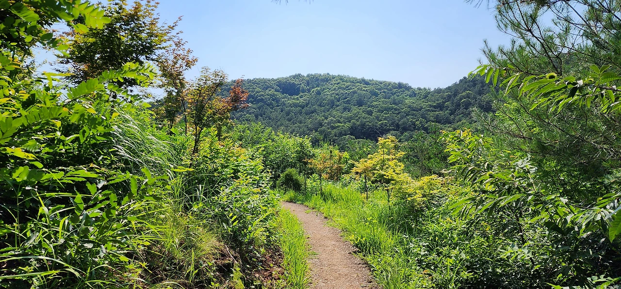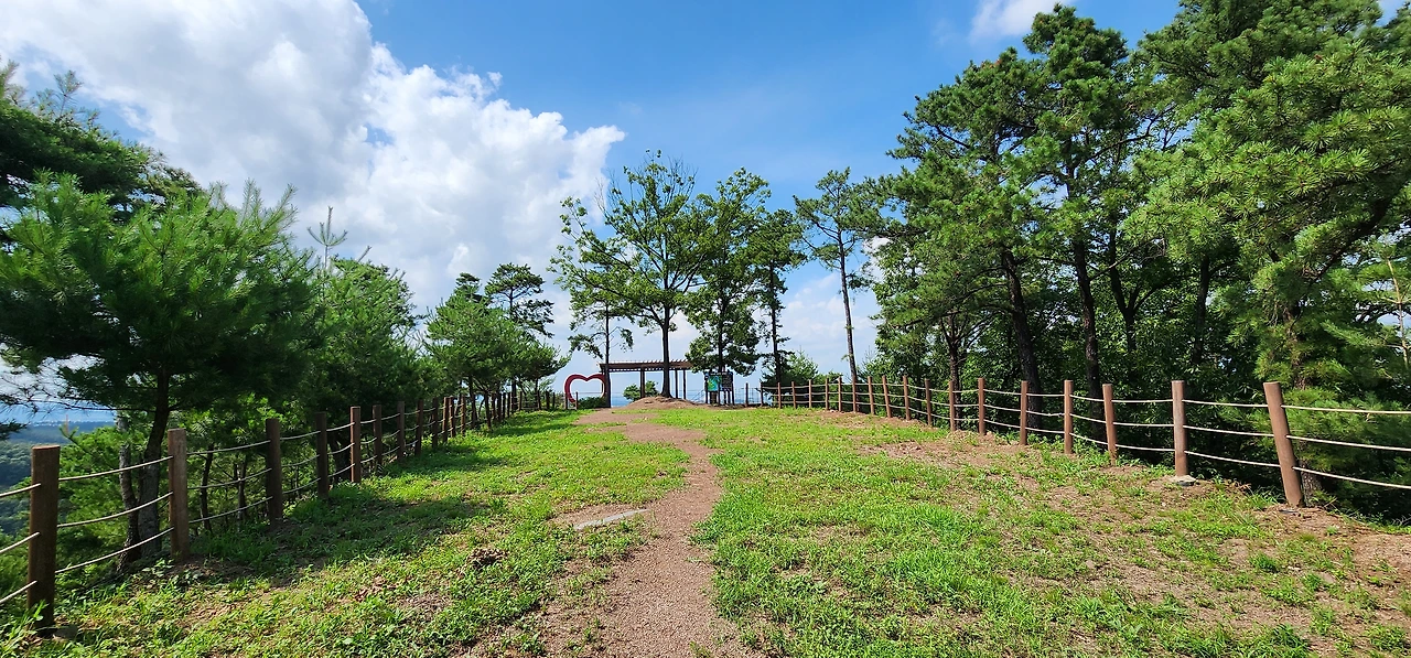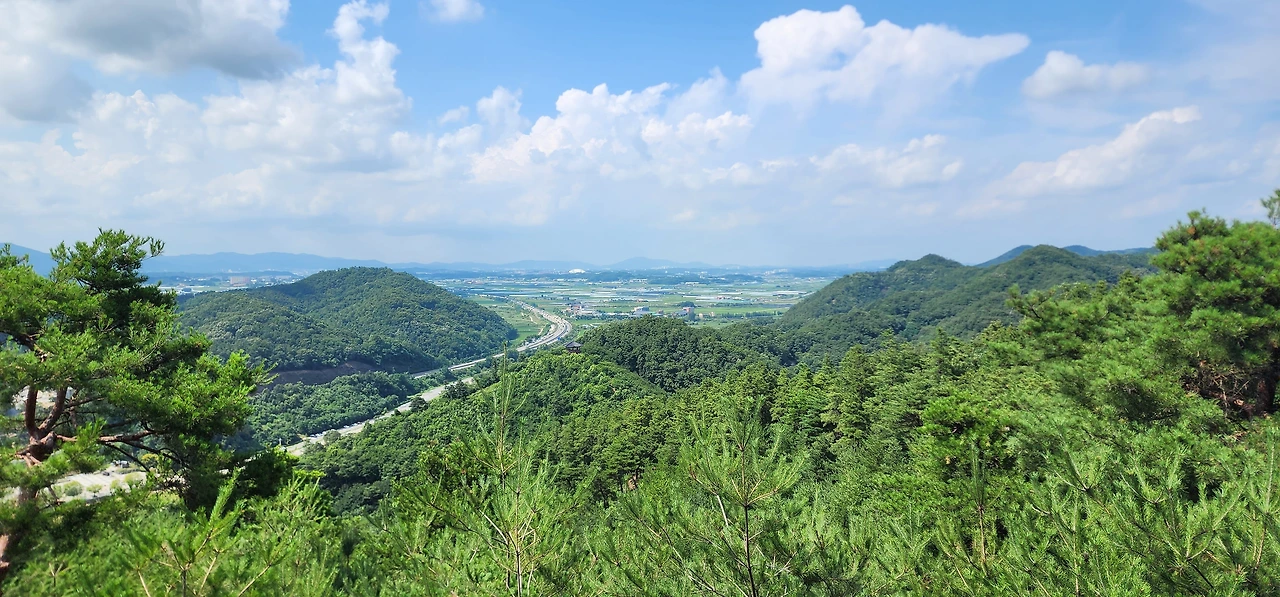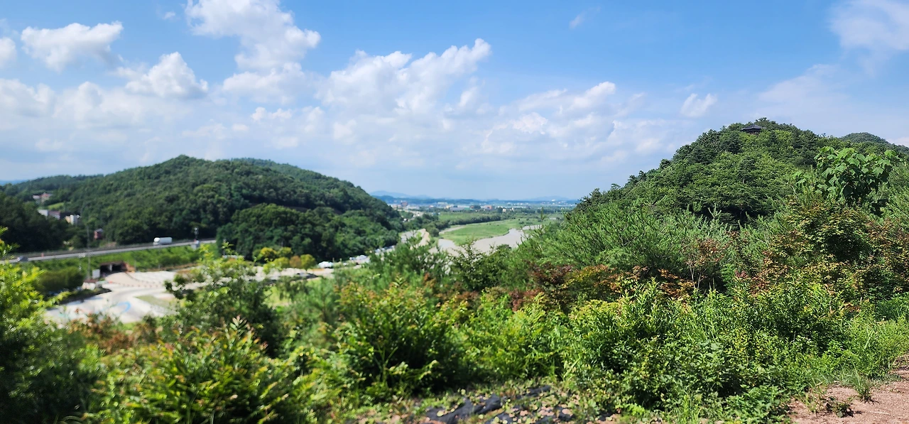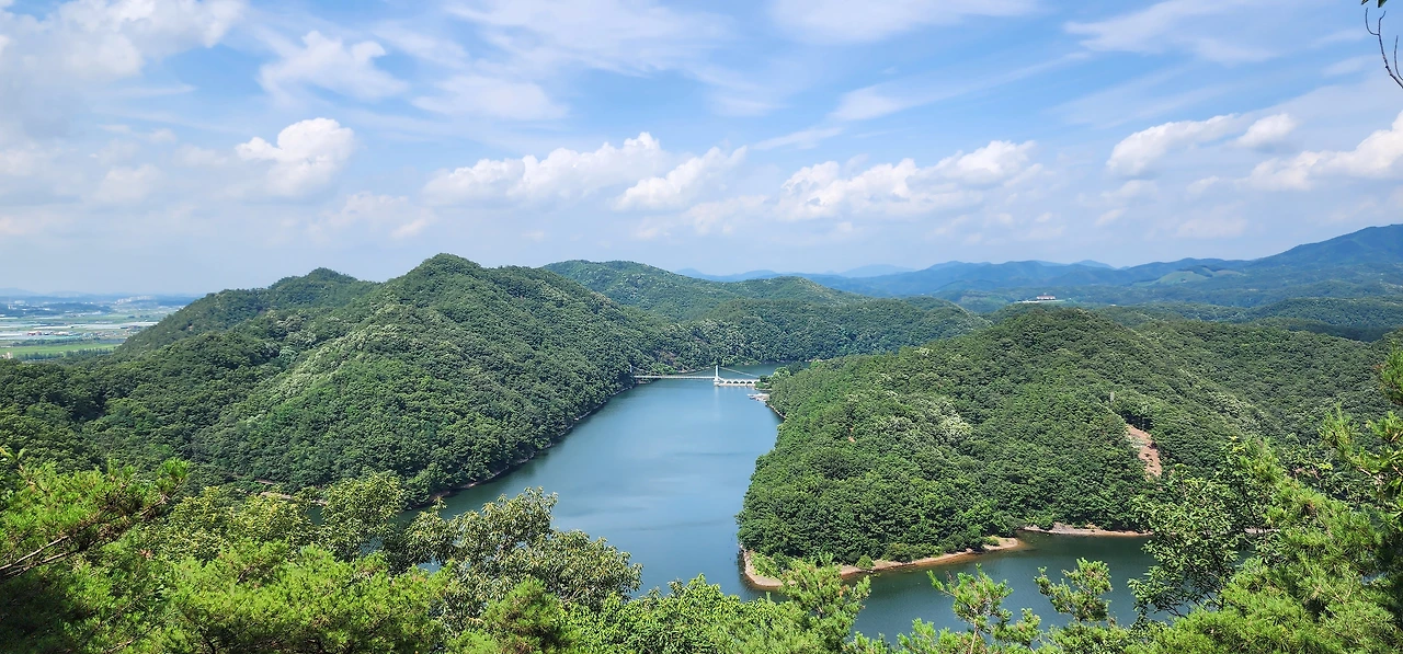 농다리를 건너면 그리 높지 않은 산이 있는데 산 아래에는 거대한 호수가 있다. 초평호다. 산 정상의 미르전망대를 오르기 시작했는데 길이 얼마나 아기자기한지 힘든 줄을 모른다. 돌이 없이 흙뿐이라 걷기가 편하다. 미르전망대에 오르니 멀리 진천읍내가 보이고 바로 산 아래로는 중부고속도로 위로 차들이 맹렬히 달린다. 동쪽으로 산속에 초평호가 자리하고 있고...