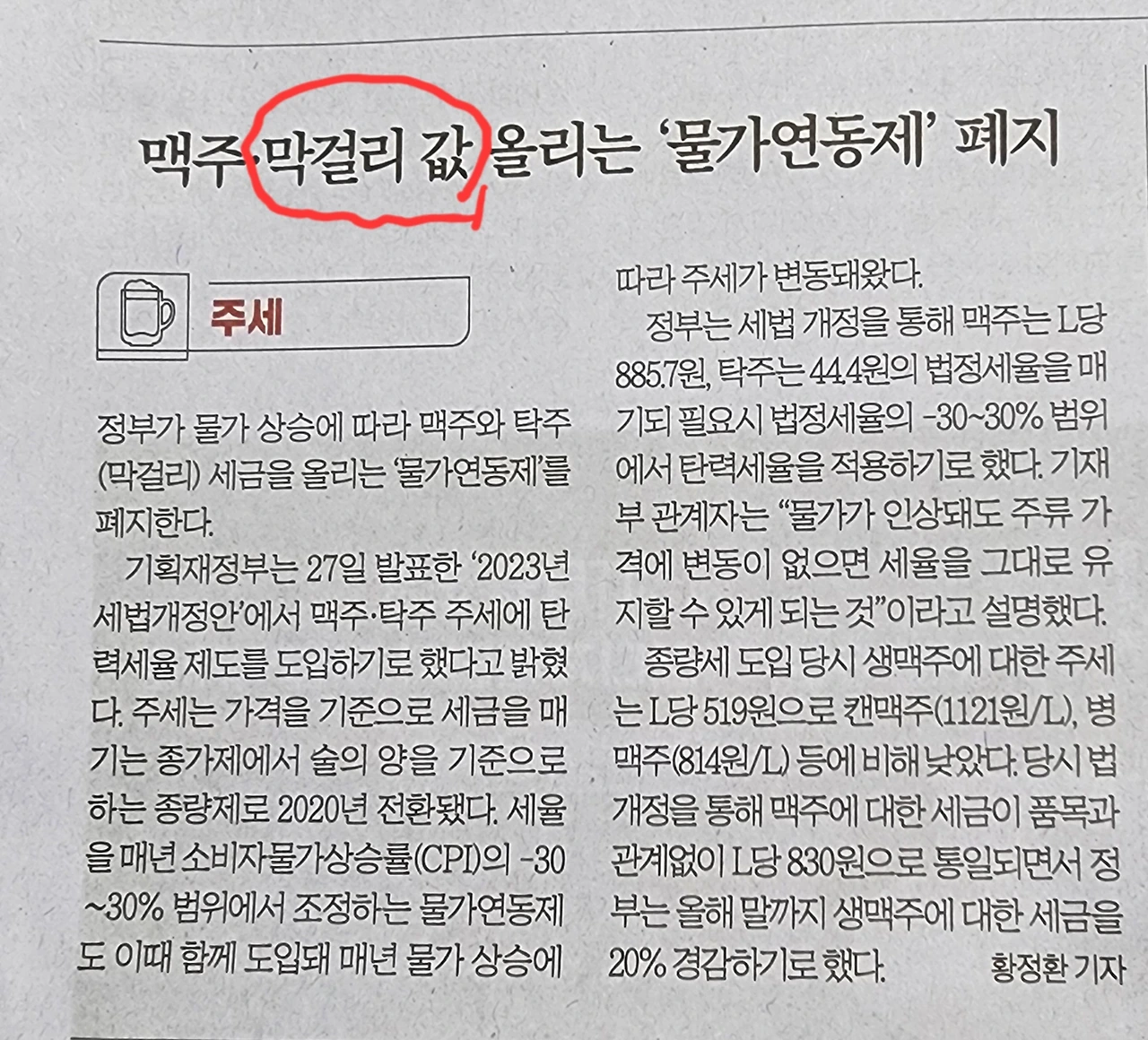 한 신문의 제목이 아주 신선하다. '맥주.막걸리 값 올리는 '물가연동제' 폐지'라는 제목이 그렇다. 늘 신문의 기사 제목에서 채솟값, 원윳값, 우윳값 따위를 보다가 막걸리 값을 보니 반갑고 신통하기까지 하다. 물건에 '값'을 붙이면 그건 두 개의 명사지 한 명사가 아니다. 그리고 사이시옷은 한 명사 안에 들어가지 두 명사 사이에 들어가는 게 아니다. 그럼에도 불구하고 채솟값, 원윳값 등을 늘 신문에서 봐왔는데 막걸리 값을 보니 이제야 제대로 되는구나 싶다.