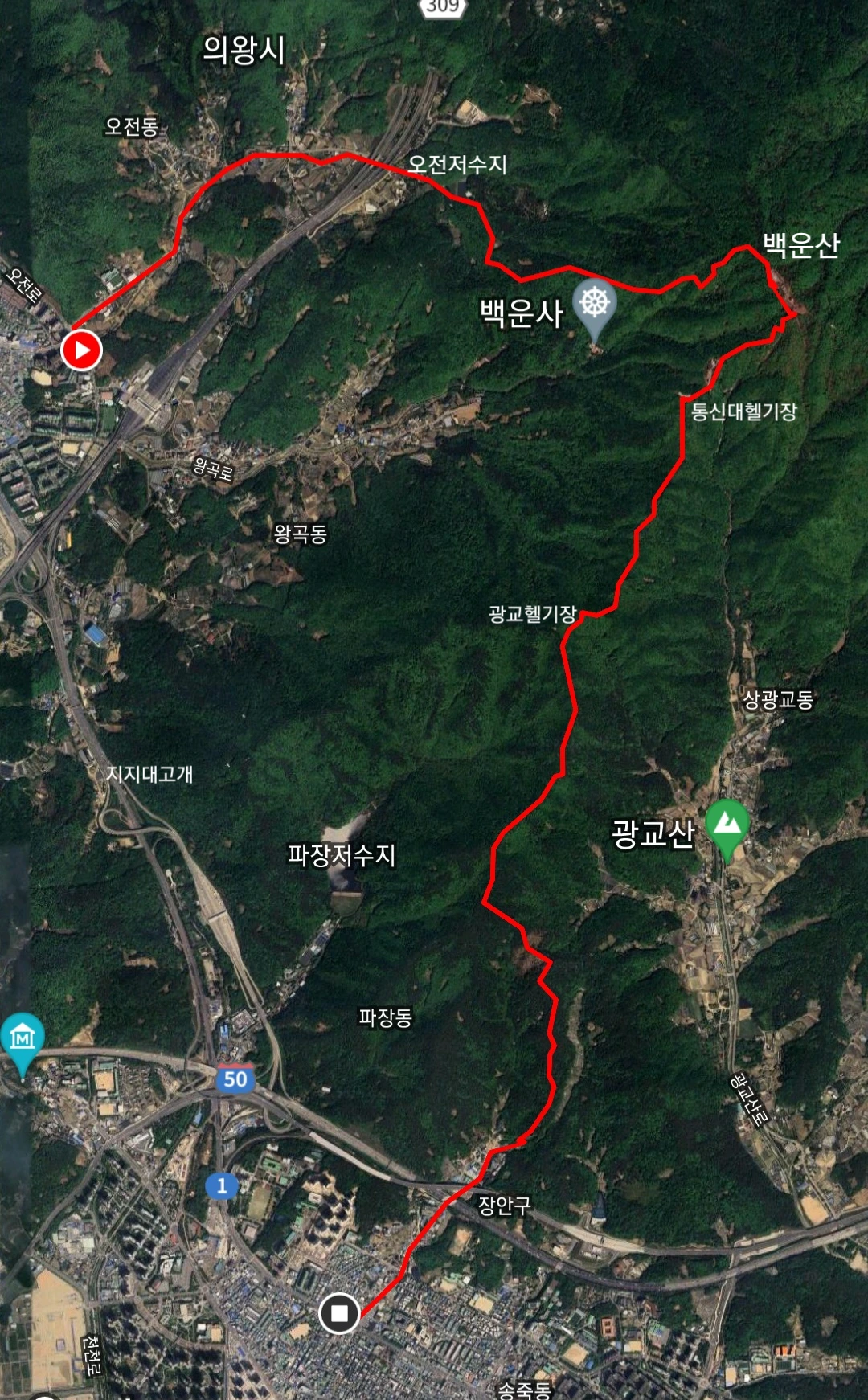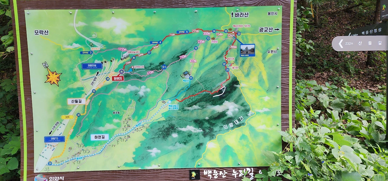 일주일만에 다시 백운산을 찾았다. 지난주에는 반딧불이화장실에서부터 걷기 시작해 상광교 버스 종점에서 통신대헬기장 쪽으로 향했다가 도로 공사로 등산로가 폐쇄돼 다시 버스 종점으로 와 계곡을 따라 절터약수터를 지나고 광교산 능선에 올라 백운산 정상에 다다랐고 하산은 백운사로 내려왔다. 오늘은 의왕시 오전동에서 출발해 오전저수지를 지나 백운산 정상을 향했다.