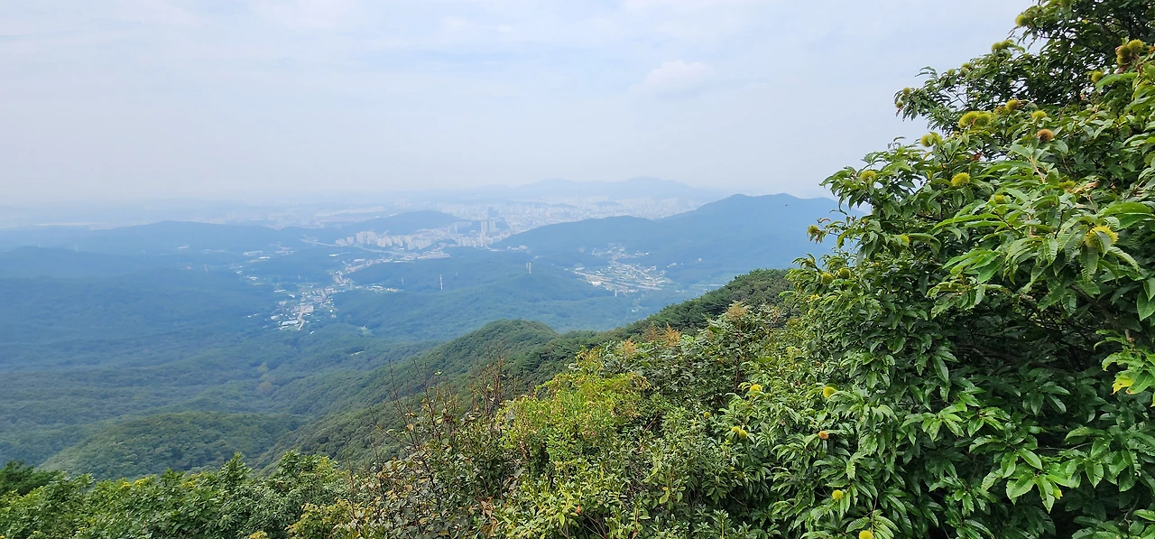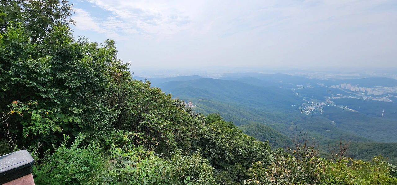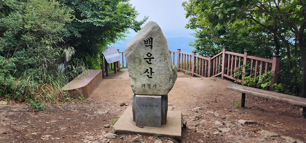 길을 오르다 네 방향으로 갈라지는 지점에 이르러 벤치에 쉬고 있는데 마침 산악자전거 일행이 도착했다. 그들은 각자의 장비 이야기에 시간 가는 줄 모르는 것 같았다. 옆에서 들어보니 별 장비가 다 있다. 자전거에 위치추적기를 다는 건 보통인 듯싶었다. 도둑이 훔쳐 가도 꼼짝 마라다. 자전거팀은 하산을 하고 나는 정상을 향했다. 그리 경사가 심하지 않은 편이었으나 막판에 계단이 많아 애를 먹었다. 계단은 장점도 있고 단점도 있다. 장점은 노면이 울퉁불퉁하지 않다는 점, 단점은 단조롭고 힘이 든다는 것이다. 악전고투 끝에 백운산 정상에 올랐다. 이곳에서 서쪽을 내려다보는 전망은 참 시원하다. 다만 오늘은 지난번보다는 날이 좀 흐렸다.