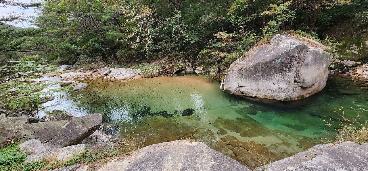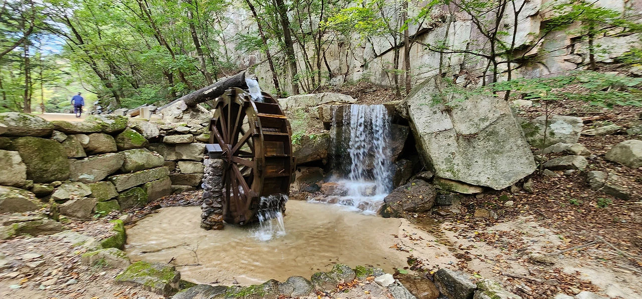 태조왕건 드라말 오픈세트장을 지나 기묘하게 생긴 지름틀바위도 보고 옛날에 집들이 있었던 조령원터도 지났다. 주막도 한 채 남아 있었고 높은 곳에서 떨어지는 폭포도 눈앞에서 봤다. 교귀정은 옛날 경상감사들이 임무 교대하면서 그곳에서 인수인계를 했단다. 산불됴심비는 한글로 씐 조선시대 비석이었다. 과거시험 보러 옛 선비들이 한양을 향해 걷던 길을 걸었다. 일행들이 기다릴 거 같아 제2관문까지만 갔다가 아쉽지만 돌아섰다.
