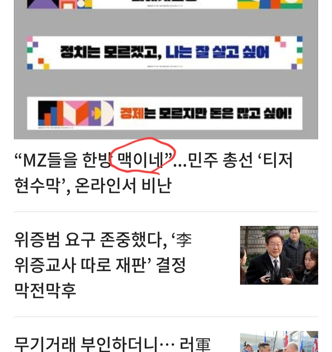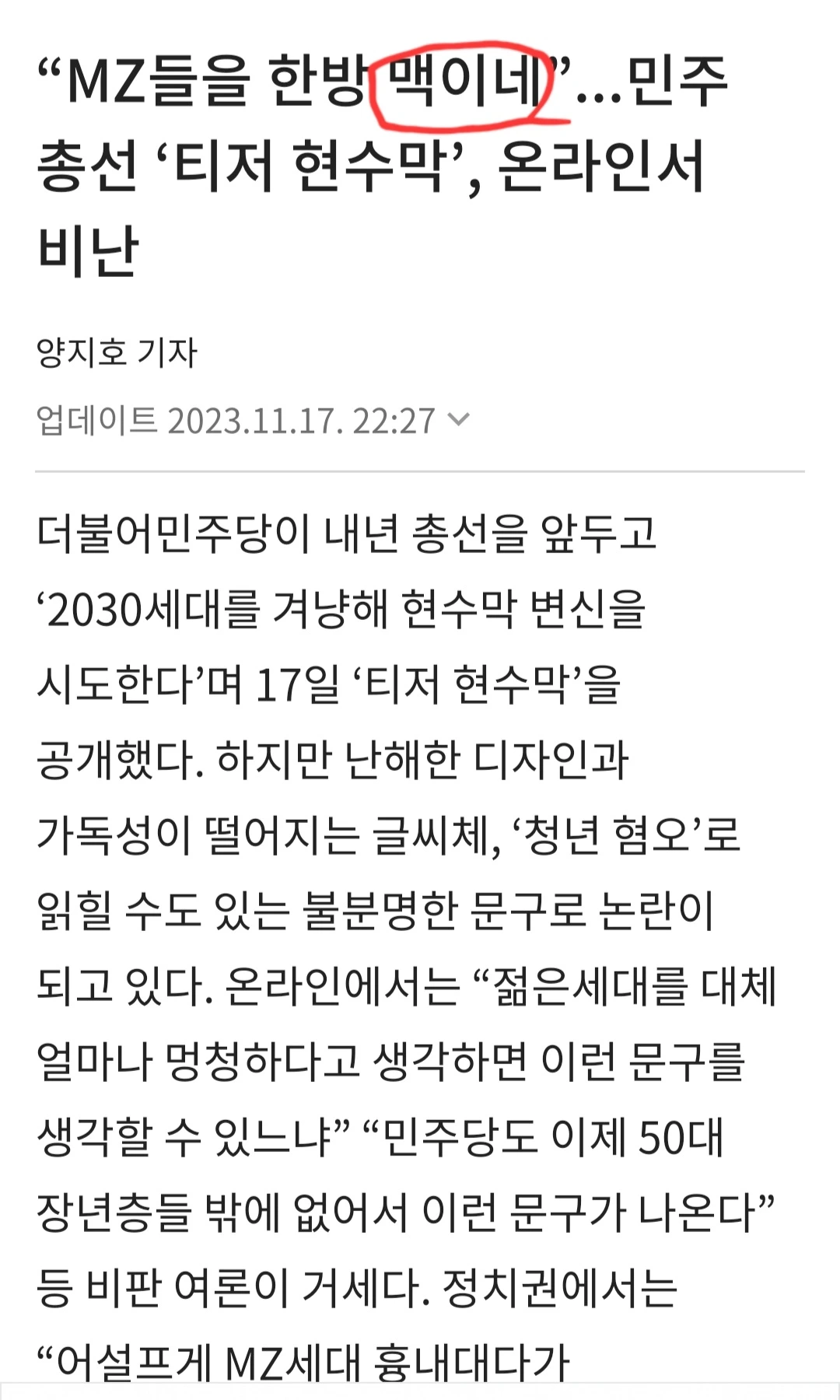 원문이 '맥이네'였고 단지 고대로 인용했을 뿐이라고 변명할지 모르겠다. 원문이 정말 '맥이네'였는지 모르겠지만 그랬다 해도 바로잡아 내보내는 게 언론의 본분이 아닐까. 원문이 '멕이네'였는데 신문이 '맥이네'라 잘못 썼을지도 모르겠다. 너무 부주의하다. 신문이 독자를 당혹케 한다.