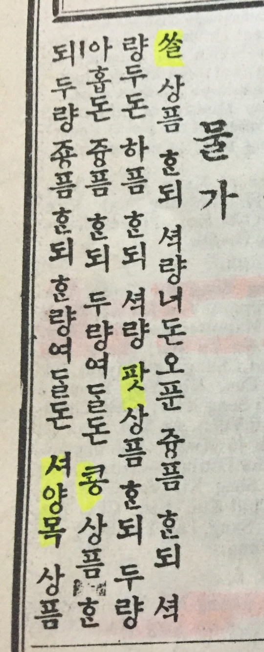 1896년 4월 7일이 독립신문의 창간호가 발행된 날이다. 이 날 신문 4면 중 3면은 광고와 정보가 주로 실려 있다. '물건'이란 말이 자주 쓰이고 있고 '물가'는 아예 섹션 이름으로 쓰고 있다. 오늘날의 용법과 똑같다.