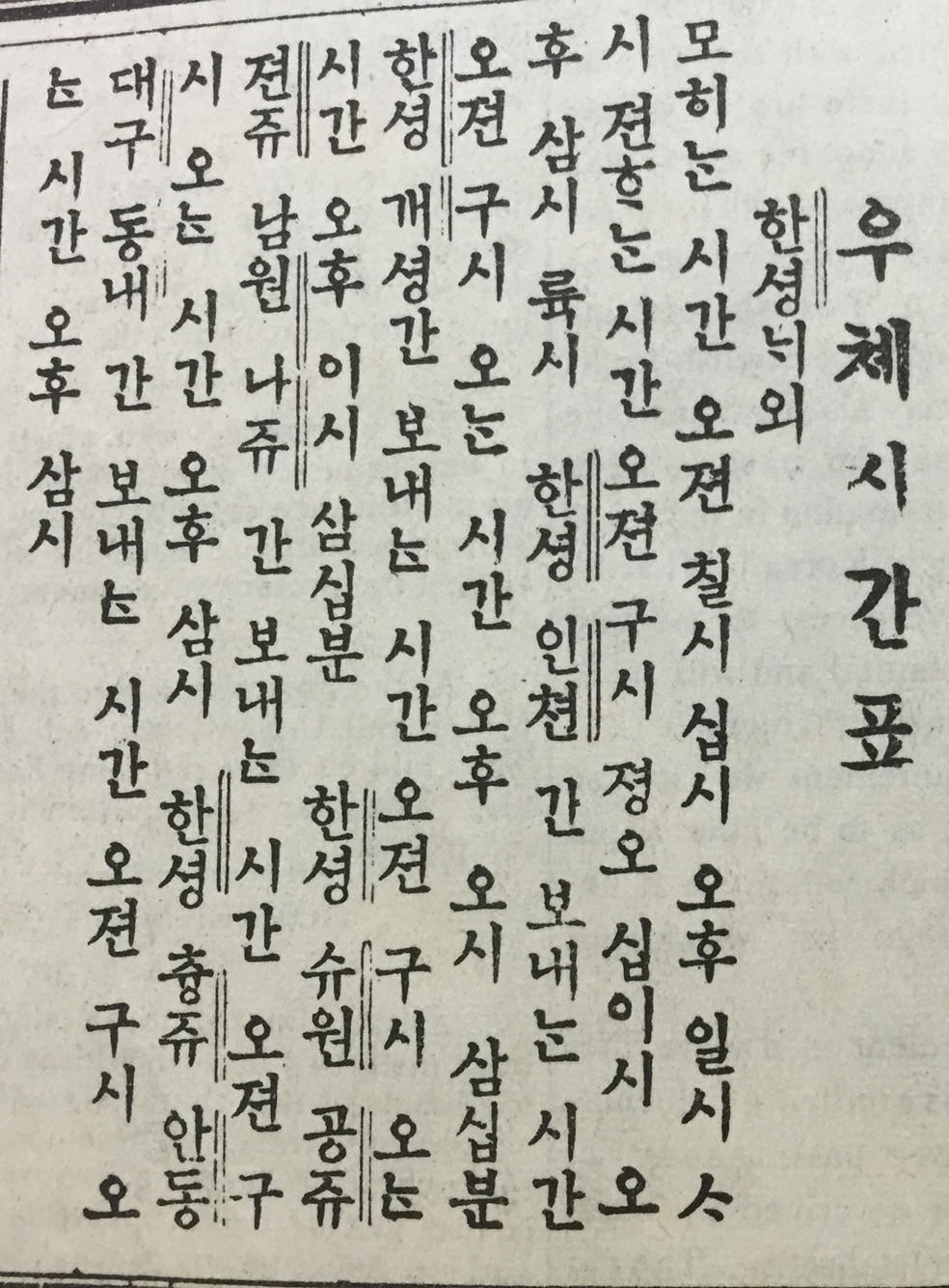 시간 읽는 법이 지금과 다르다. 독립신문 3면에 매일 나오는 '우쳬시간표'에 '오젼 칠시 십시 오후 일시 사시' 같이 적었다. 그런데 '우쳬시간표'에만 시를 읽을 때에 한자어인 '일, 이, 삼, ...'으로 읽었지 본문 기사에서는 '다삿 시', '열두 시'와 같이 순우리말로 읽었다. 왜 두 가지 방식이 공존했는지 이유가 분명치 않다.