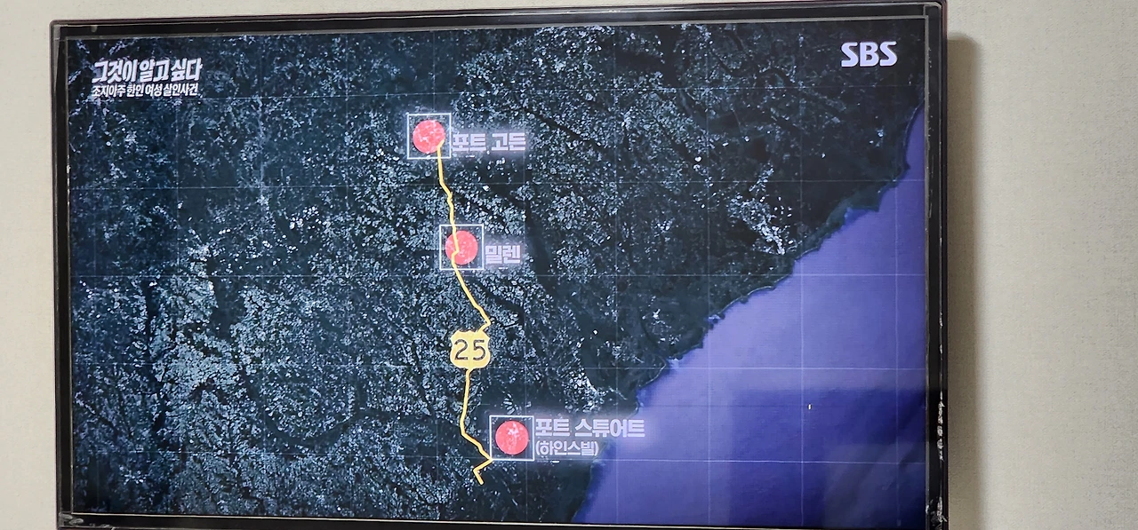 그런데 어젯밤 '그것이 알고 싶다'를 보면서 SBS답지 않은 실수를 발견하고 쓴웃음을 짓지 않을 수 없었다. 나는 보통 사람보다 지리에 예민한 편이다. 지리 정보가 내겐 매우 중요하다. '밸런타인데이의 악몽-조지아주 한인 여성 살인사건'을 보다가 이런 설명을 접했다. 20대 한인 여성의 시신이 쓰레기통에 버려진 곳은 포트 스튜어트와 포트 고든 사이의 25번 고속도로상 밀렌에서였다고 하는 설명이 지도와 함께 제시됐다. 포트 스튜어트도 미군의 거대한 기지이고 포트 고든도 마찬가지다. 두 군 기지를 잇는 고속도로변 어딘가에 시신이 유기되었다는 것이다.