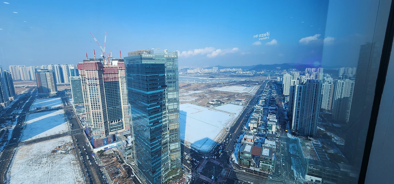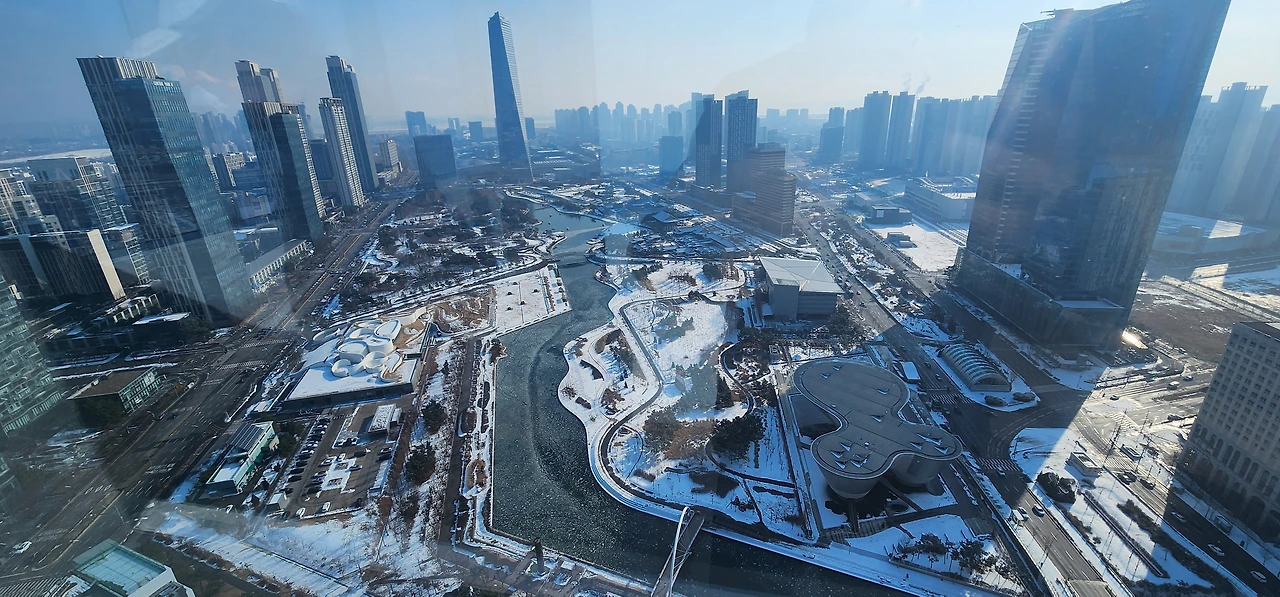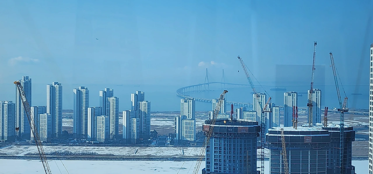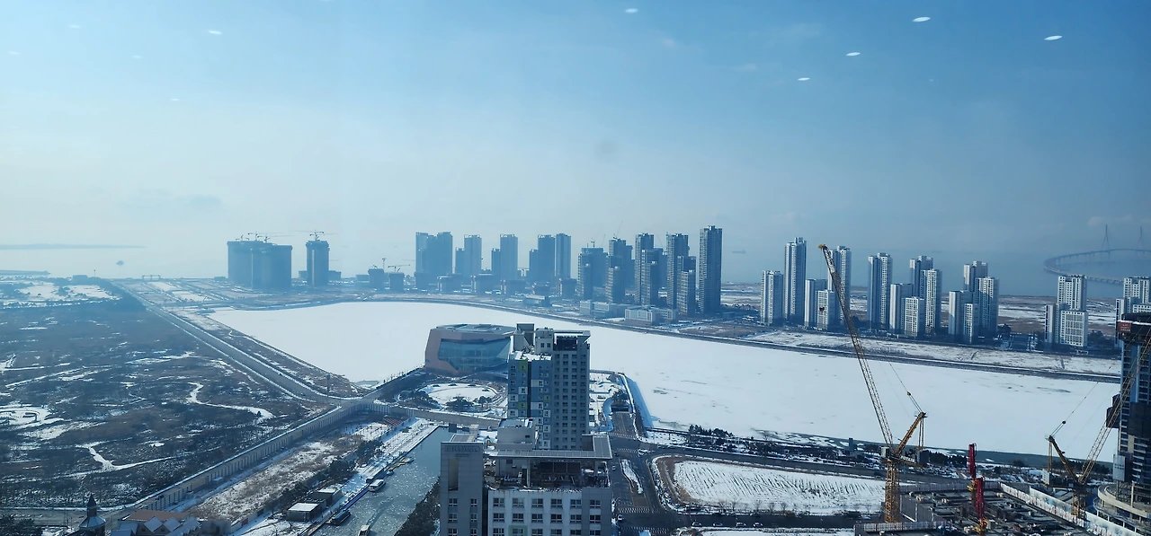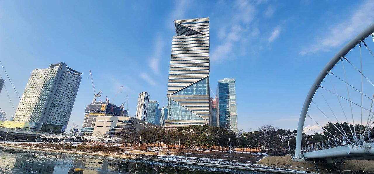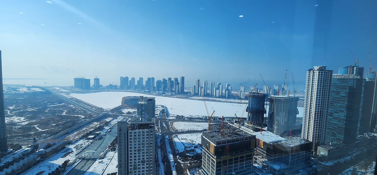 이어서 G타워에 갔으나 1시부터 문을 연다 해서 나왔다. 거대한 랜드마크씨티3호수변공원 한 바퀴를 돌았다. 아직 채 다듬어지지 않았다. G타워로 돌아와 엘리베이터를 타고 33층 높이의 전망대에 올랐다. 사방팔방이 다 내려다 보였다. 장관이었다. 센트럴파크는 바로 앞에 있었고 저 멀리 구송도와 청량산도 보이고 영종도로 넘어가는 인천대교도 보였다.