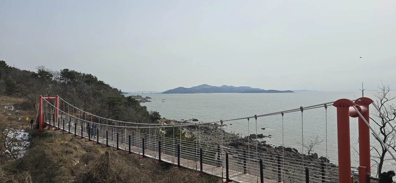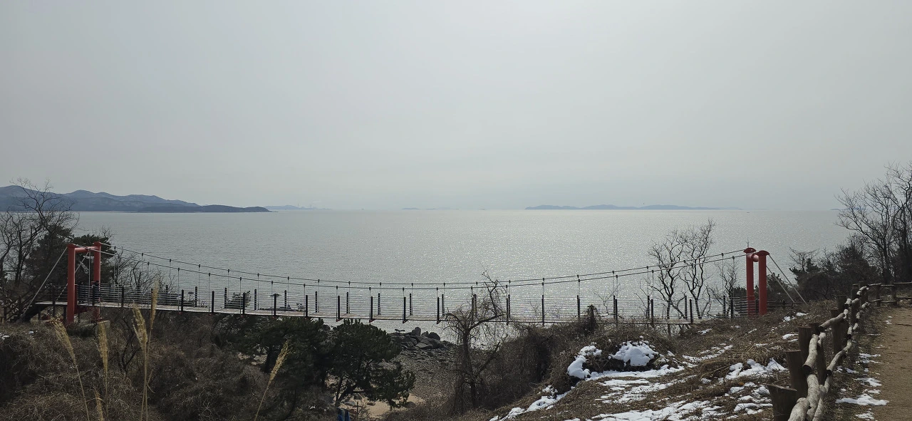 호젓한 산길을 걷다 보면 출렁다리를 만난다. 산속에 출렁다리가 놓여 있는 것이다. 좀 더 가다 보면 등산로는 끝나고 백사장이 나타나는데 그곳이 선녀바위해수욕장이다. 용유도의 해수욕장은 거기까지다. 그 이후론 걷기가 좀 불편하다. 좁은 차도에 보도가 따로 없어 위태위태하기 때문이다. 지도상으로는 용유도해변이라 표시돼 있지만 군사지역인지 도무지 해변에 접근할 수 없다. 덕교삼거리를 지나면 마시안이다. 그런데 재미있다. 도로명은 분명 마시란로이다. 그러나 전통 지명은 마시안인 모양이다. 하지만 걷다 보면 거대한 카페가 나타나는데 카페 이름이 마시랑카페다. 마시안, 마시란, 마시랑... 뭐가 맞나. 다 맞다고 하는 수밖에. '마실+안'에서 '마시란', '마시안', '마시랑'이 파생돼 나오지 않았나 추측해 보았다.
