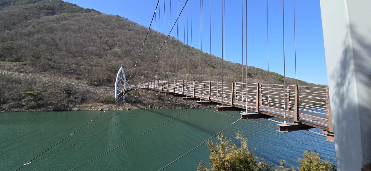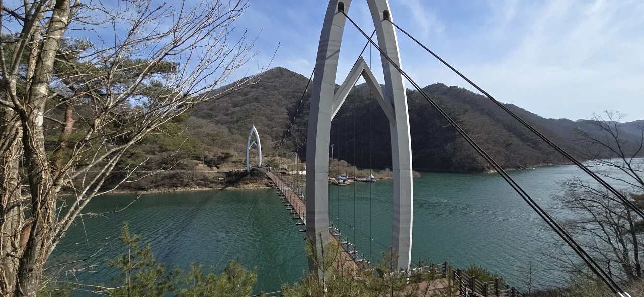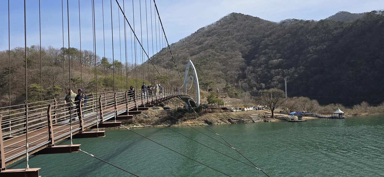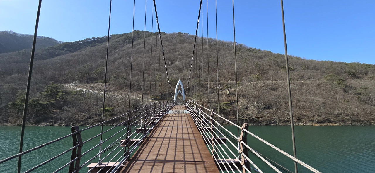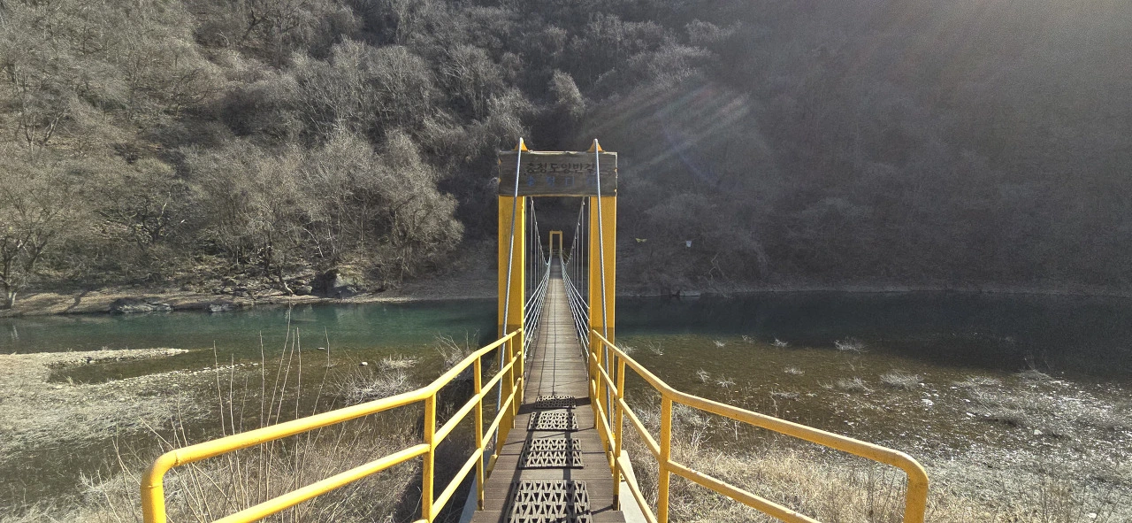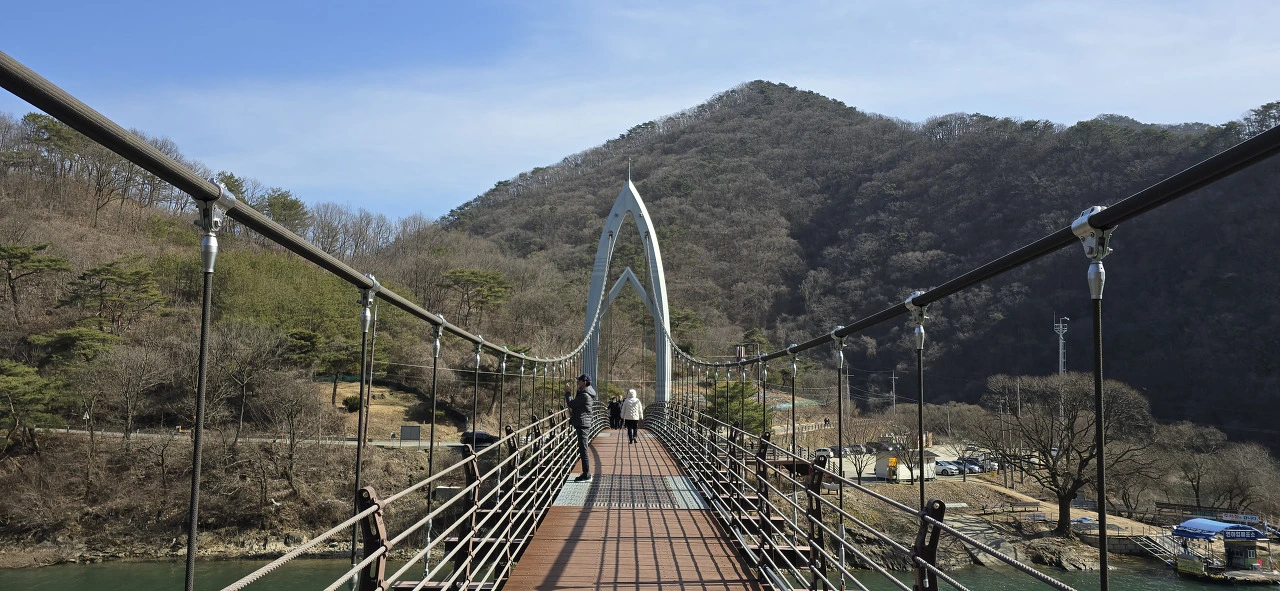 산막이옛길은 괴산댐 호수 주변의 산길 산책로다. 입구에서 산막이마을까지가 약 3km이고 거기서 1.2km 더 가면 출렁다리가 나오는데 연하협구름다리다. 산막이마을에서 연하협구름다리까지는 길이 좁아져서 편안하게 산책하기는 쉽지 않다. 연하협구름다리는 굉장히 긴 편도 아니지만 그렇다고 짧지도 않다. 구름다리를 건너면 큰 주차장이 있다. 좀 아쉬운 건 구름다리 건너서 카페나 식당이 없다는 것이다. 그런 곳은 이미 지나온 산막이마을에 죄다 모여 있다.