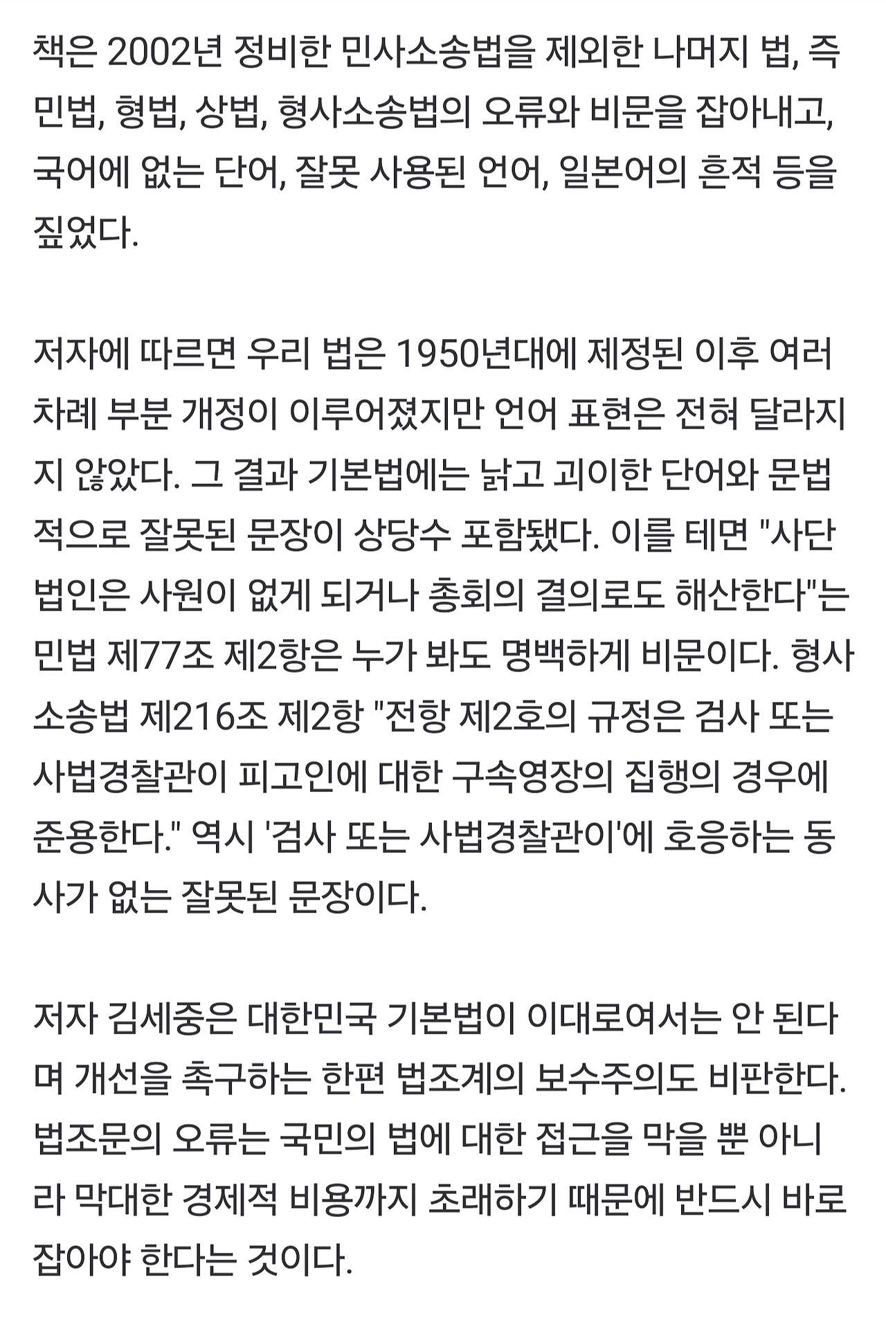 1960년대 이후 대한민국은 눈부신 발전을 거듭했고 2020년대인 지금 대한민국은 선진국의 대열에 들어섰다. 이를 부정할 사람이 있나. 위대한 성취다. 그런데 놀랍고 기막힌 일이 있다. 1950년대 혼란스럽던 시절 일본 법을 참고해 만든 민법, 형법, 형사소송법 등 나라의 기본법이 지금도 그때 그대로라는 사실이다. 문법에 안 맞는 문장이 수두룩하고 지금은 쓰지 않는 단어들이 비일비재한데 지금까지 그냥 그대로다. 법조계의 보수성을 극명하게 보여준다. 그 결과 요즘 법률을 공부하는, 2000년대 이후에 태어난 사람들은 법조문을 도무지 이해할 수 없어 힘들어하고 고통에 허덕이고 있다.