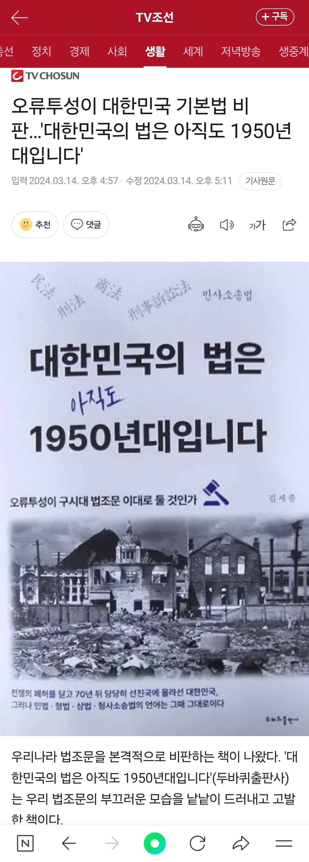 300명 국회의원 중에 거의 1/5 가까이가 법조인이건만 입법권을 가진 국회는 이런 참담한 현실을 외면해 왔다. 더 이상 이래서는 안 된다. 온갖 사회 분야가 선진화를 이룩했는데 법조문만은 1950년대 상태 그대로라니 이게 있을 수 있는 일인가. 다른 언론사들도 차차 이 문제에 관심을 가지고 사회적 관심을 불러일으키리라 믿는다. TV조선이 첫걸음을 내딛었다. 대한민국의 기본법은 현대화되어야 한다. 기나긴 장정이 막 시작되었다.