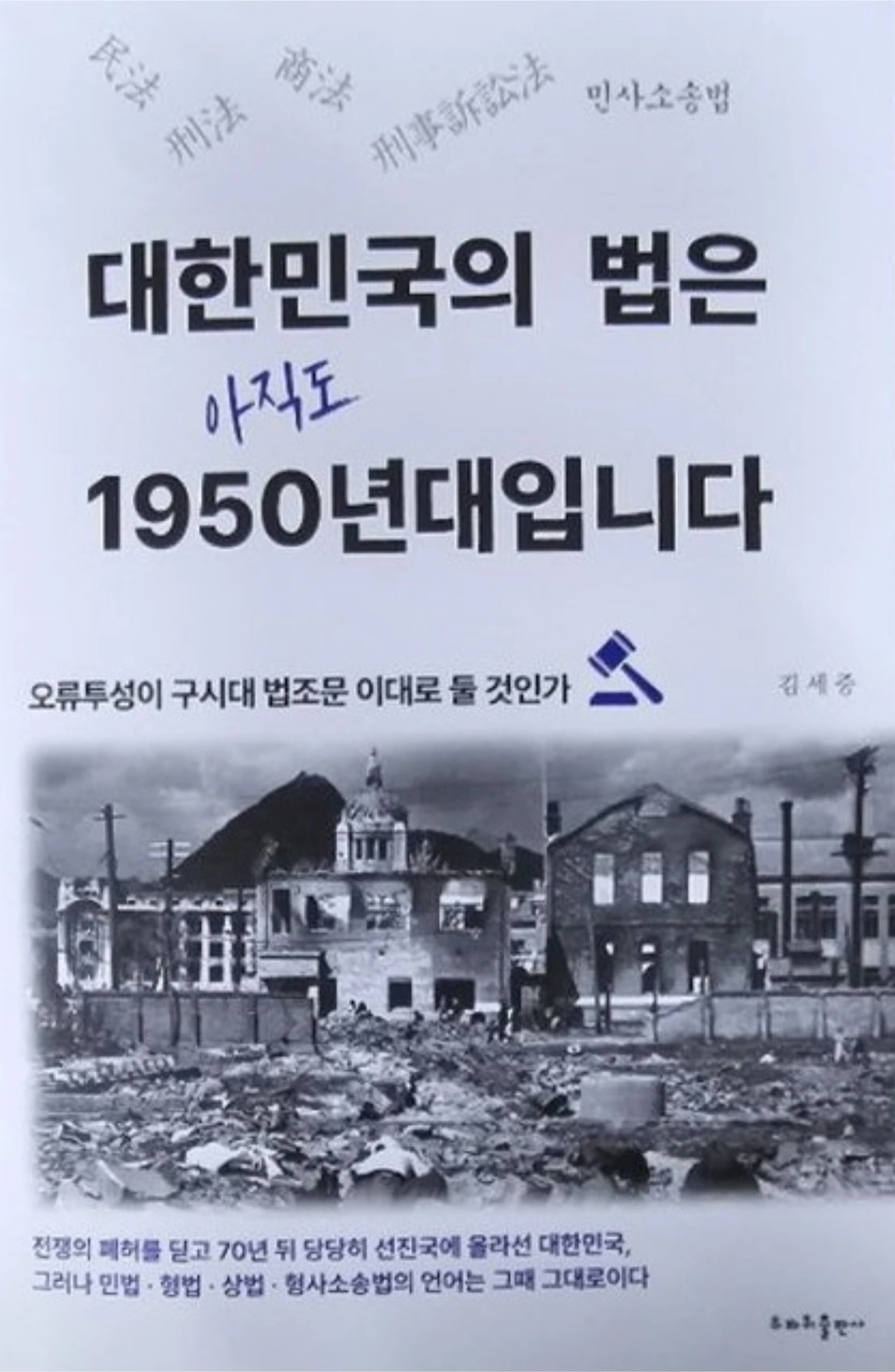제목도 눈길을 끌지만 부제인 '오류투성이 구시대 법조문 이대로 둘 것인가'와 6.25 후 광화문 앞 거리 모습인 표지 사진도 괜찮았던 것 같다. 기자의 눈길을 끌만하지 않았을까 싶다. 뒤 표지에 저명 인사들의 지지 발언을 실은 것도 신뢰감을 주었을 것 같다. 어떻든 작은 발걸음을 내딛었다. 이 책의 내용이 널리 알려져서 오류투성이 법조문이 바로잡히고 그래서 엉터리 법조문 때문에 법학을 공부하면서 영문도 모른 채 끙끙 앓고 있는 법률 후속 세대와 나홀로 소송하느라 법조문을 뒤적이는 일반인의 고통을 덜어주게 되기를 바란다. 사회 거의 모든 분야가 선진국 수준에 이르렀는데 법조문만 낡디낡은 볼썽사나운 모습이라니 있을 수 없다고 생각한다.