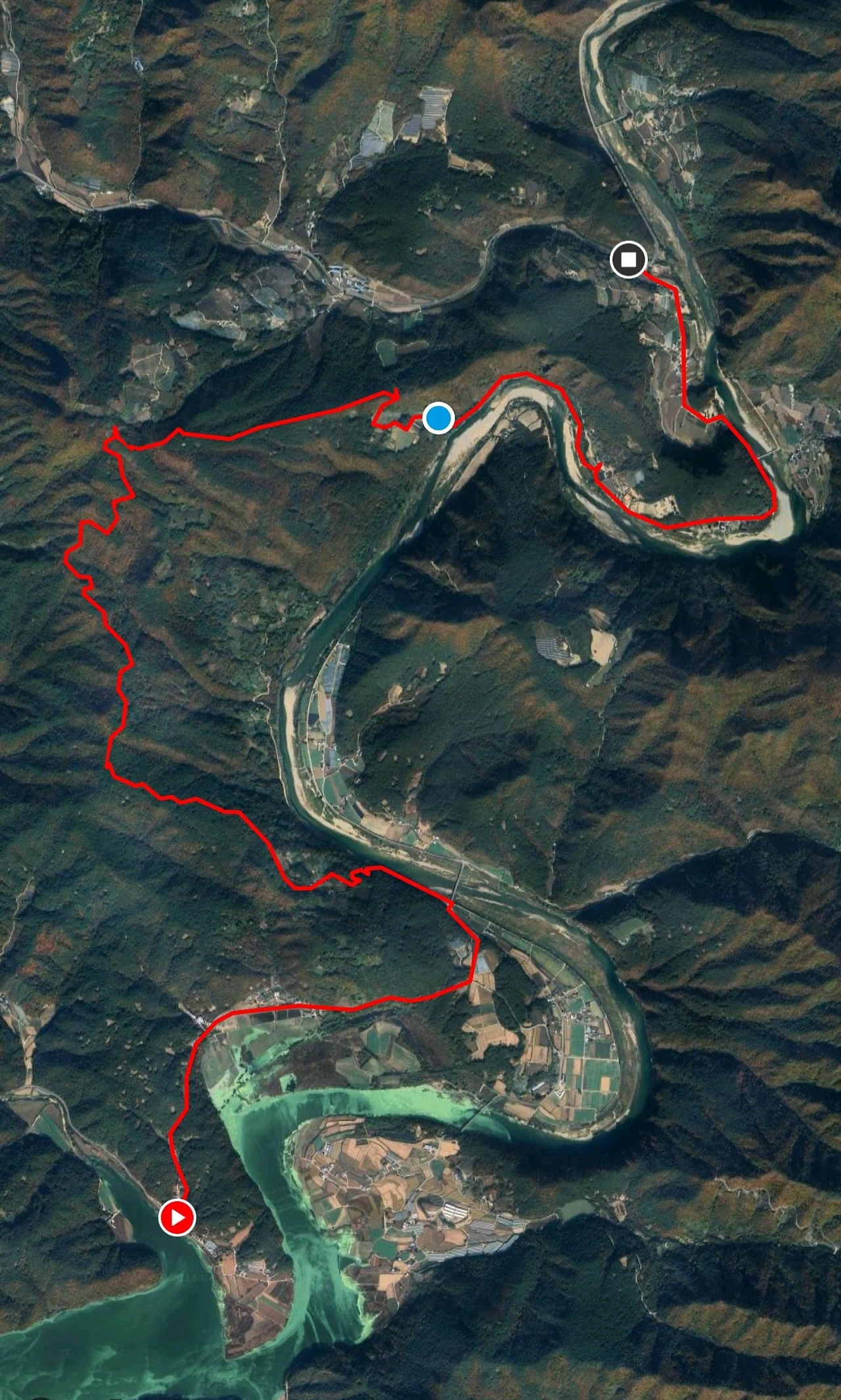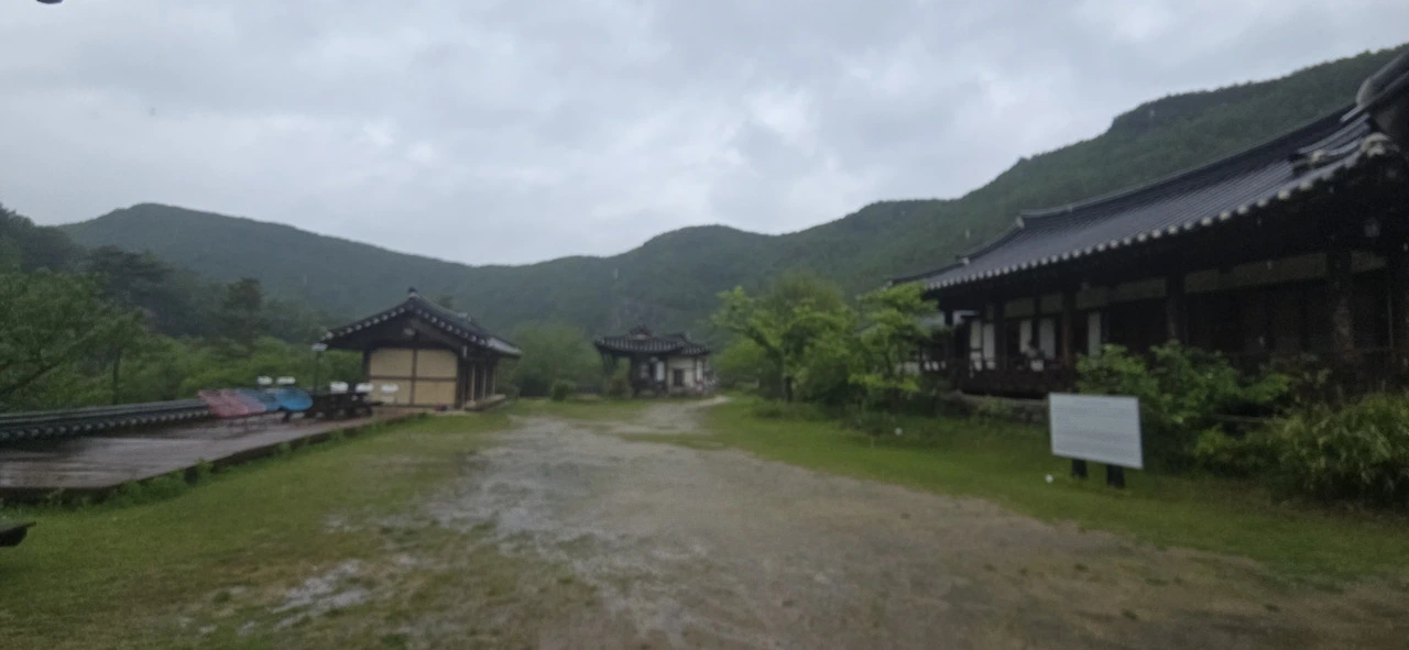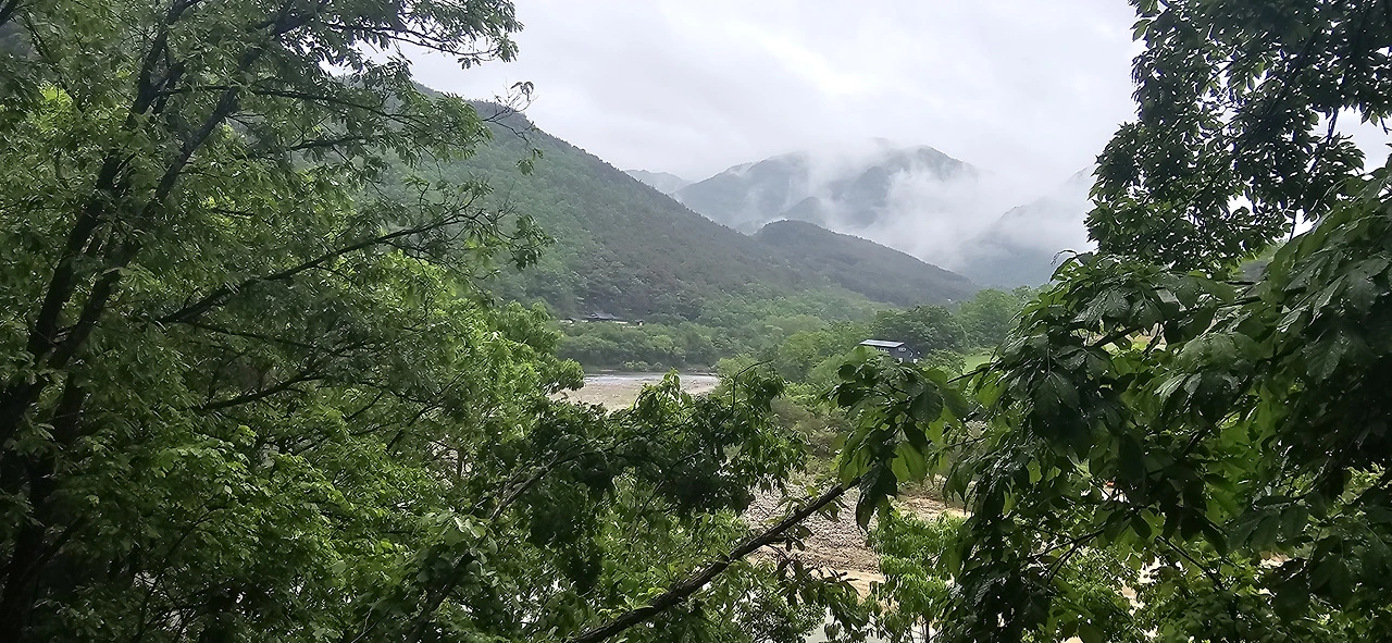 경로를 기록하기 위해 스포츠트래커와 램블러 앱을 켰다. 그리고 터벅터벅 걸었다. 비가 주룩주룩 내리기에 비옷을 꺼내 입고서... 차들도 거의 다니지 않았다. 사람도 물론 보이지 않는다. 도산면 토계리에서 걷기 시작해 얼마 지나지 않아 그 깊은 산중에 현대식 디자인의 멋진 건물이 나타났다. 이육사문학관이었다. 갈 길이 머니 들어가볼 순 없었다. 마을이 나타났다. 이곳은 도산면 원천리다. 원천리는 나의 넷째 고모님의 시댁 마을이다. 나도 십여 년 전에 고모네를 방문한 적이 있다. 당시에는 고모부도 살아 계셨는데 원천리 그 마을에 와보고 무릉도원이 바로 이런 곳이구나 싶었다. 그만큼 절경이었다. 깎아지른 듯한 절벽이 낙동강 건너에 병풍처럼 서 있어 이곳이 선경이 아닌가 싶을 정도로 감탄했었다. 이번에 그 마을에 들어가보지 못하고 지나쳤다.