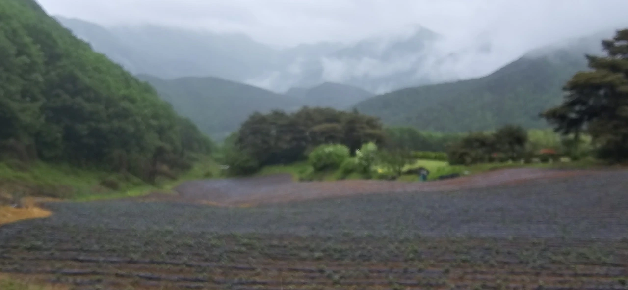 건지산 정상은 비켜서 예던길은 나 있었고 어느 지점부터는 줄기차게 내리막이었다. 물론 인적은 없었다. 퇴계선생이 걸었을 땐 어땠을까. 별로 다르진 않았겠지만 야생동물은 좀 더 많았지 않았을까 싶다. 퇴계선생은 아마 도산서원에서부터 걸었을 것이고 그렇다면 내가 걸은 거리보다 더 길었을 것이고 아마 하루 종일 걸었어야 할지 모른다. 내리막을 한참 걷다가 포장도로를 만났다. 그곳은 네거리였다. 어디로 갈까 하다가 내려오던 길에서 오른쪽으로 꼬부라졌다. 고개를 내려오다가 엄청난 절경을 맞이했다. 그 산중에 드넓은 밭이 있었고 건너편은 낙동강 건너 다른 산이었다. 한 폐가에서 비를 피해 잠시 쉬었다. 과연 농암종택 가는 길은 있을까 염려했는데 다행히 가파른 경사면에 계단이 나 있었다. 계단을 내려오니 넓은 길이 나타났고... 저 멀리 숲속으로 아스라히 농암종택으로 보이는 기와집이 몇 채 보였다. 학소대를 지나니 곧 농암종택이었다.