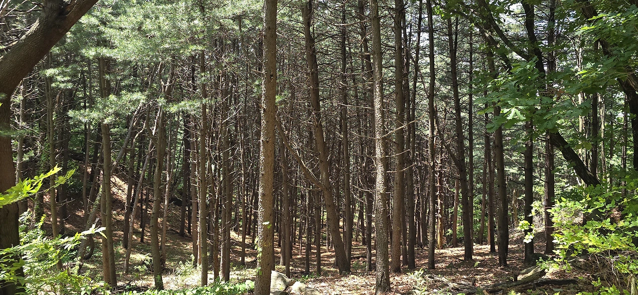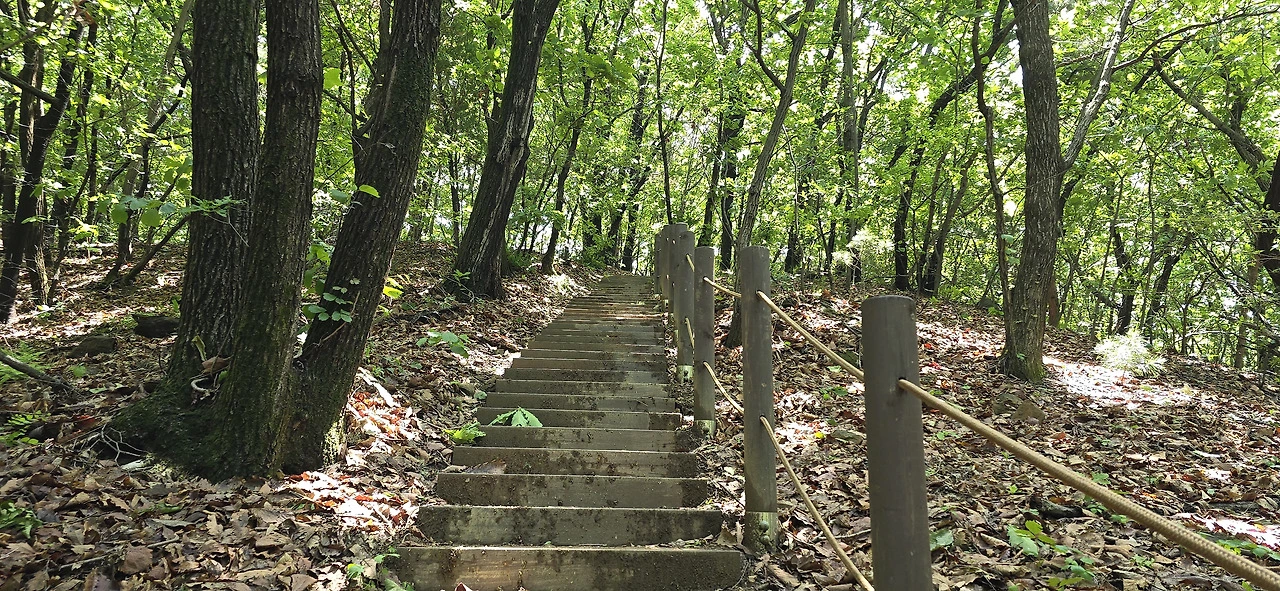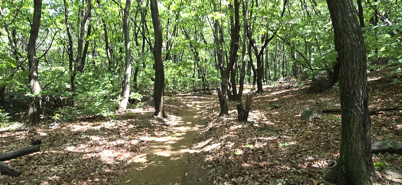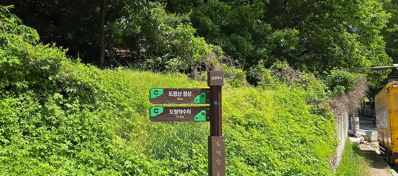1호선을 타고 석계역에서 내려 1155번 버스를 탔다. 석계역에서 종점인 청학리까진 40분 넘게 걸렸던 것 같다. 깊은 산중에 도회지가 있었고 그곳이 별내면이었다. 버스 종점에서 내려 별내중학교 뒤로 가니 도정산 등산로 입구 표지판이 나타났다. 비닐하우스가 골을 따라 차곡차곡 들어서 있었고 오이 수확이 한창이었다. 드디어 본격적인 등산로가 시작됐다. 하지만 경사가 완만해 등산로라기보다는 산책로에 가까웠다.