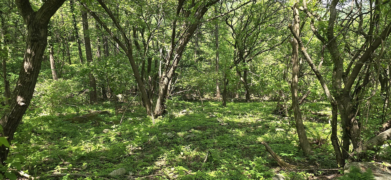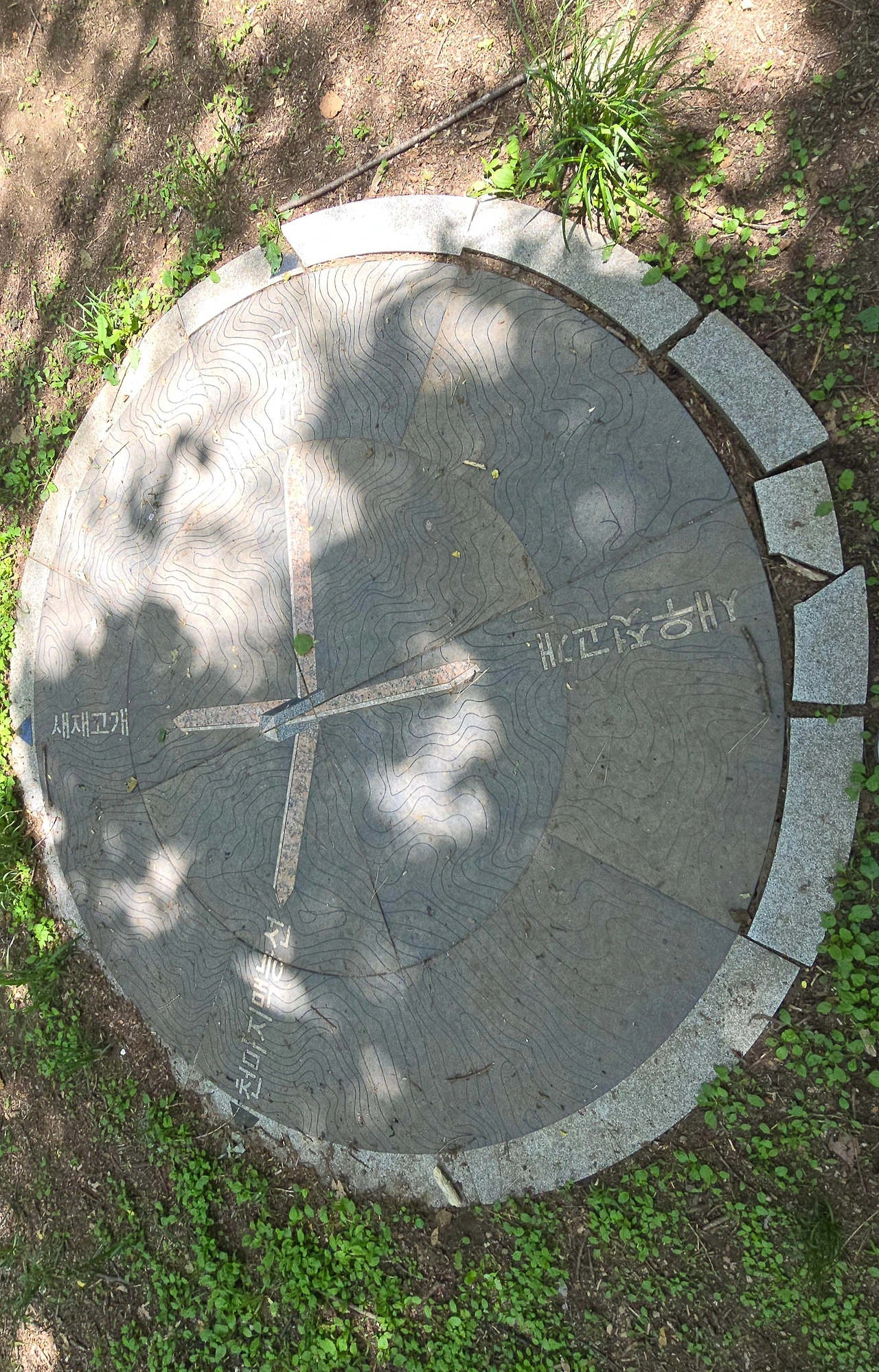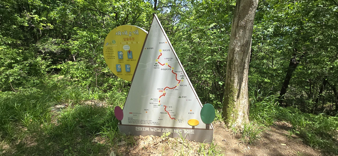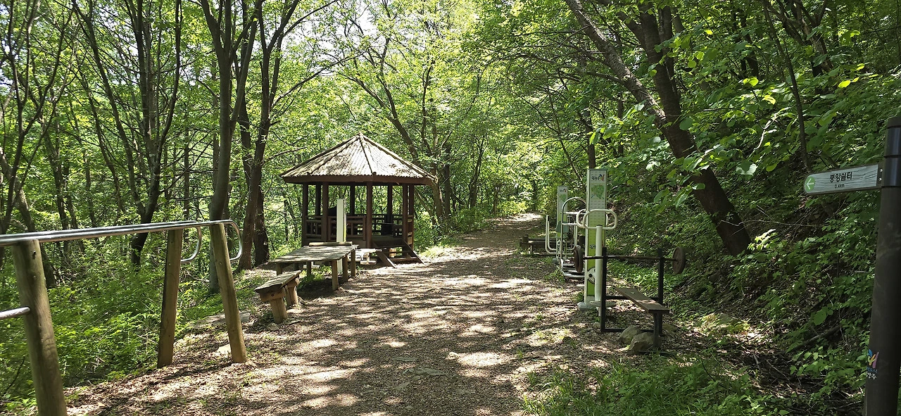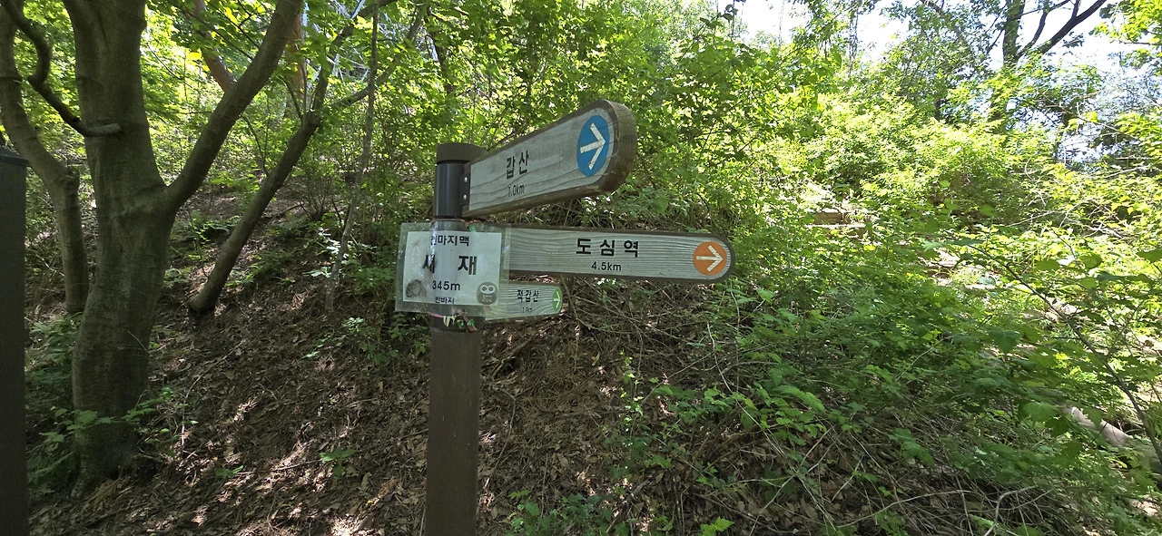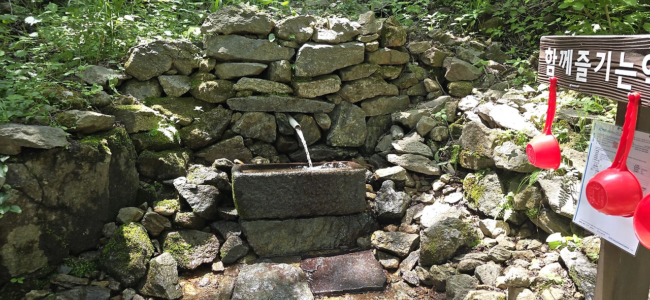 드디어 새재고개에 이르렀다. 그곳은 네거리였다. 예봉산, 도곡리, 갑산, 시우리에서 온 길이 그곳에서 만났다. 벤치도 몇 놓여 있었고 둥근 돌 원판에 네 방향이 표시되어 있었다. 천마지맥의 한 지점이 바로 새재고개인 것이다. 예봉산, 갑산 방향을 피해 시우리쪽으로 향했다. 깊은 산중이었지만 길이 꽤나 넓었다. 차도 지날 수 있을 만큼... 얼마 가지 않아 샘물이 콸콸 솟아나고 있었고 운동기구들이 있었다. 작은 정자도 있었고... 그리고 갈래길이 나 있었다. 처음에 아무 생각 없이 넓은 길로 계속 가다가 스마트폰으로 램블러앱을 열어 보았는데 넓은 길로 계속 가면 운길산, 예봉산 방향이었다. 그건 원래 의도한 길이 아니어서 되돌아와 갈림길에서 좁은 길로 들어섰다. 시우리로 내려가는 길이었다.