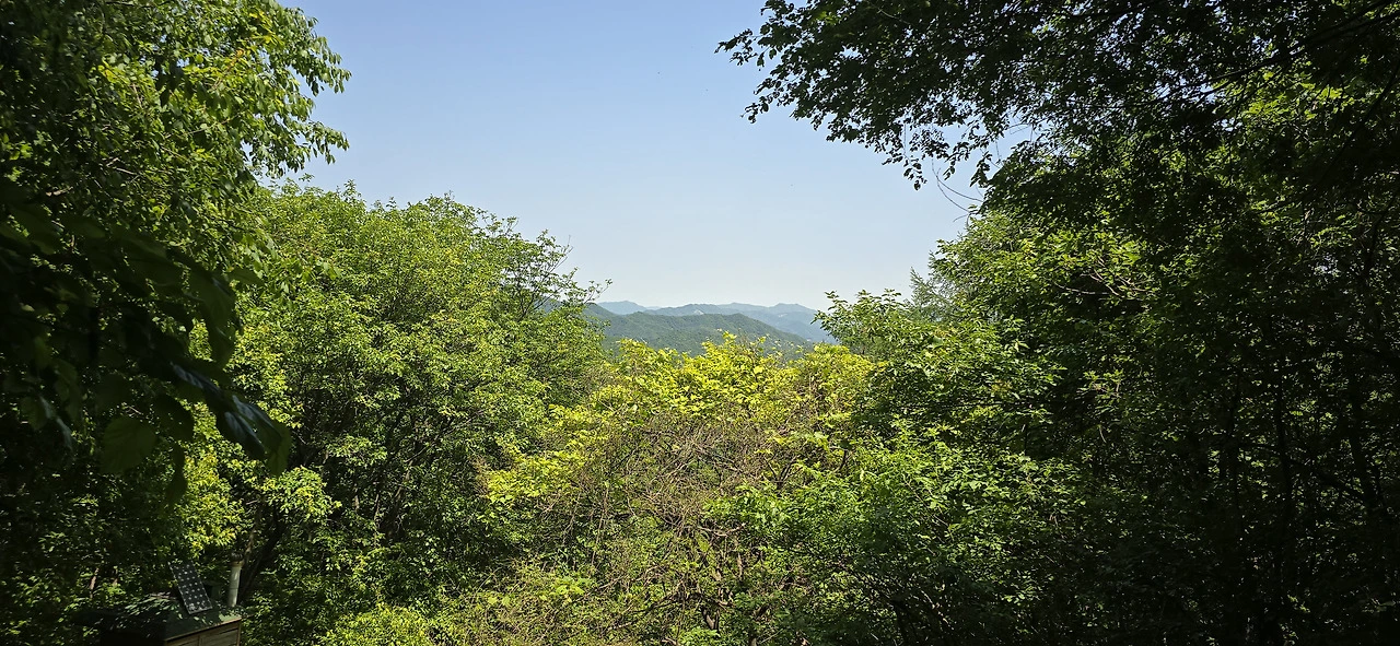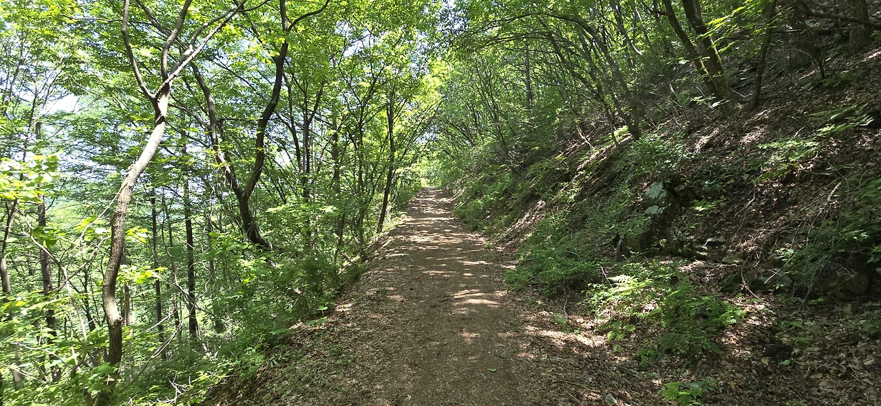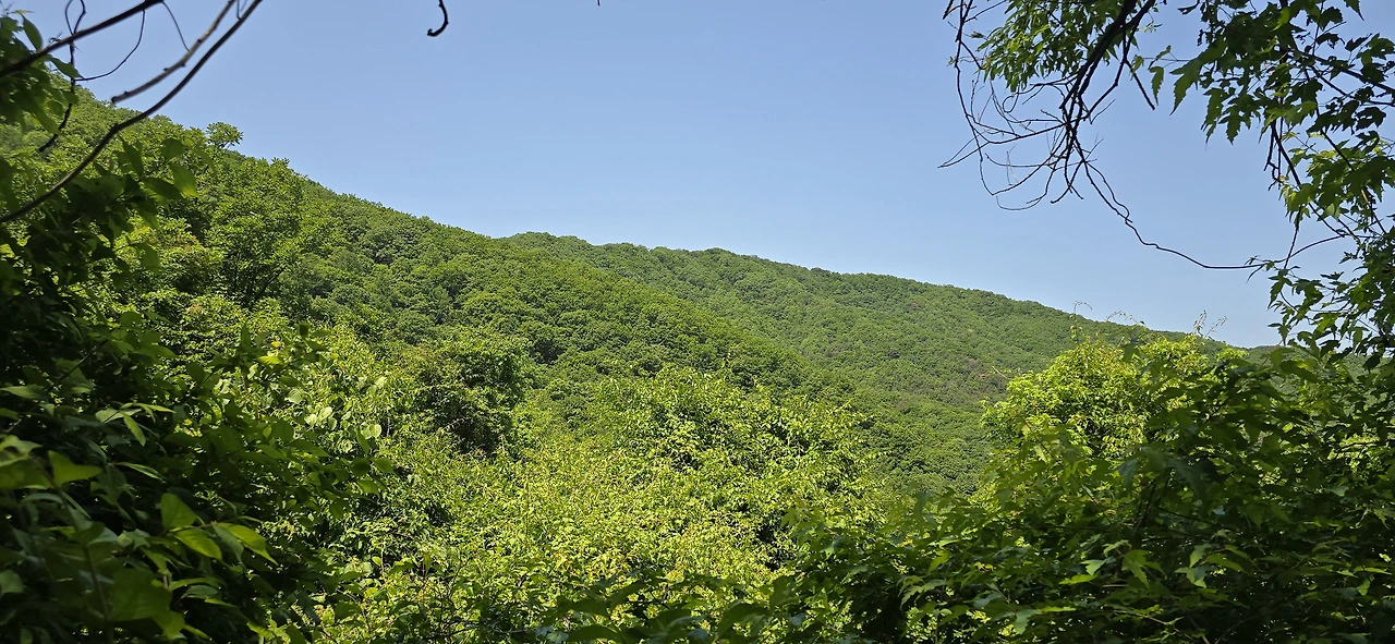 부근에 고속도로는 없었지만 대신 좁은 길을 이따금씩 지나가는 차들이 신경 쓰였다. 차가 더 이상 다닐 수 없는 데까지 가는 데 거의 한 시간이 걸렸다. 성균관대의 남양주 교육 학술림 부근에 이르자 비로소 차량 통행이 불가능했다. 그 후로는 울창한 숲속으로 이따금 등산객만 마주칠 뿐이었다. 단, 반갑지 않은 무엇을 만났으니 그 깊은 산속에 산악자전거가 맹렬히 내려오는 게 아닌가. 그러나 한 사람뿐이어서 다행이었다.