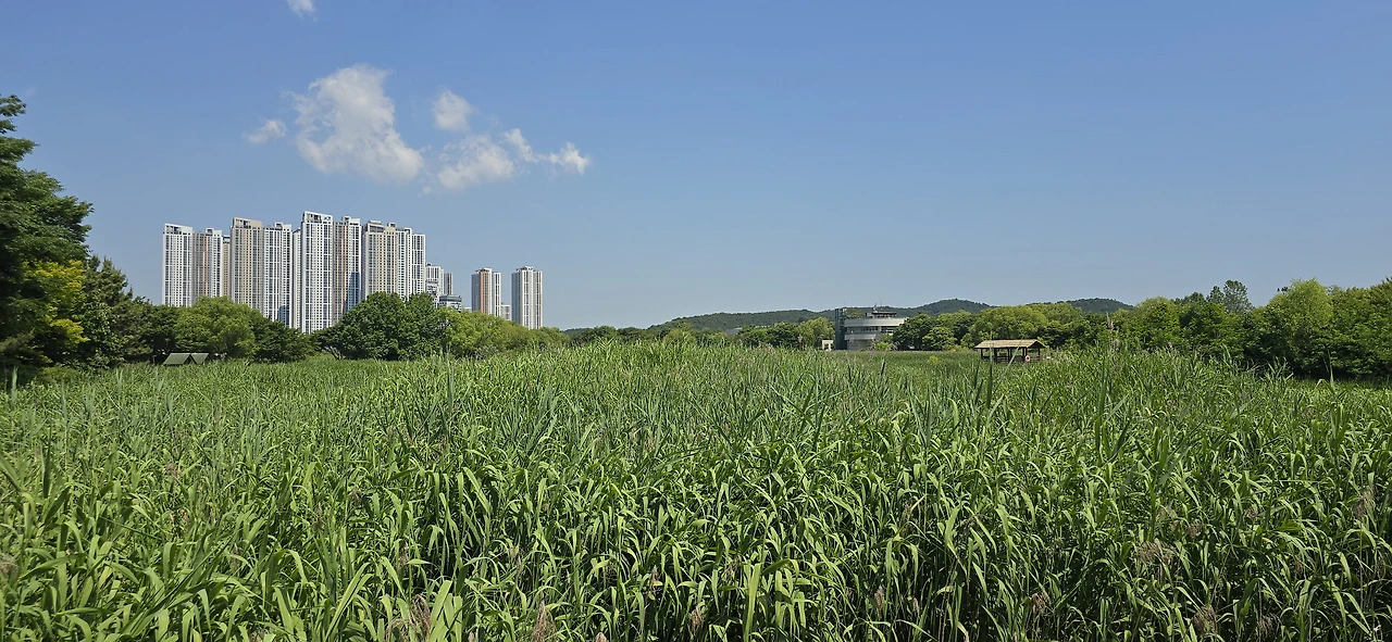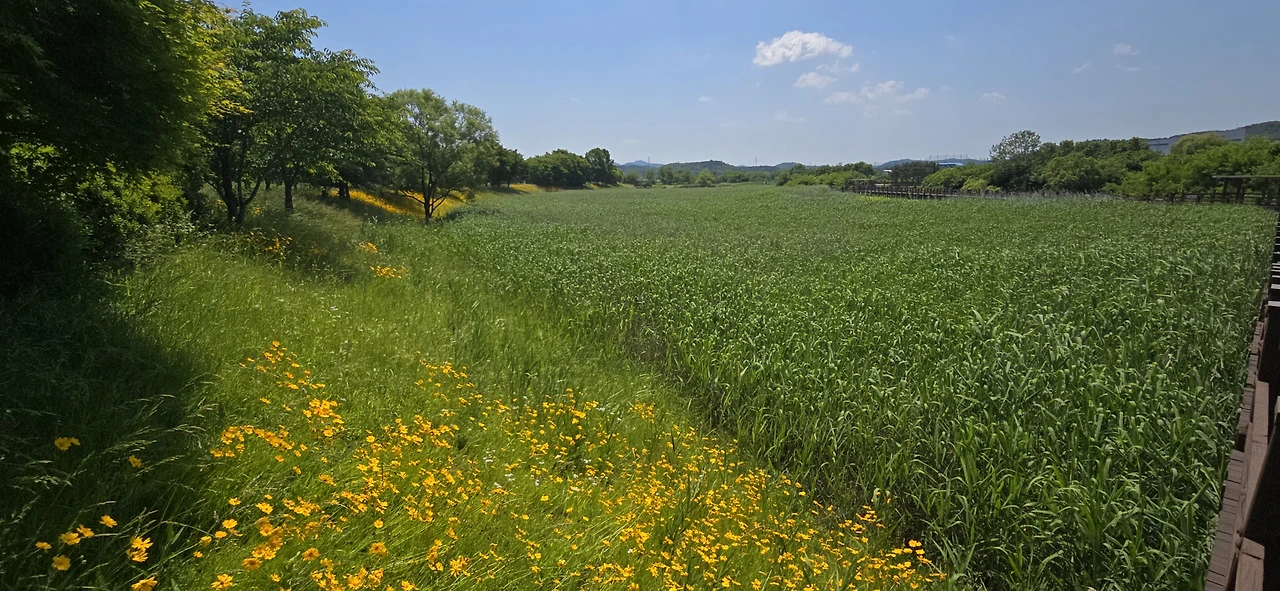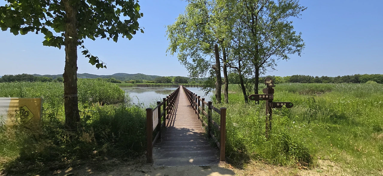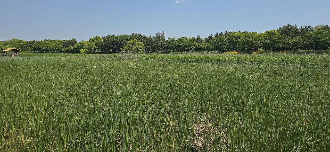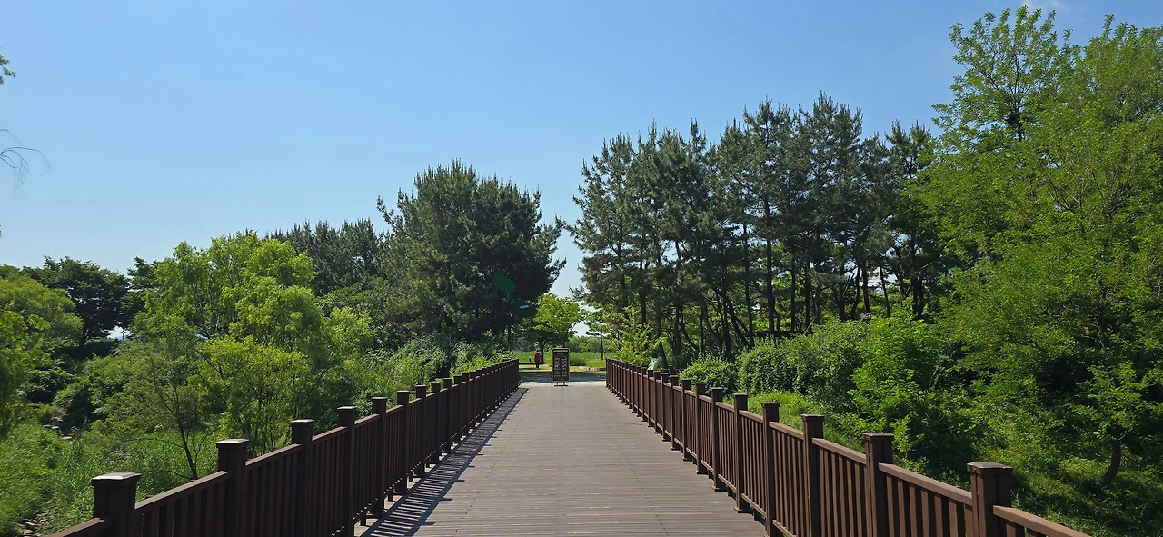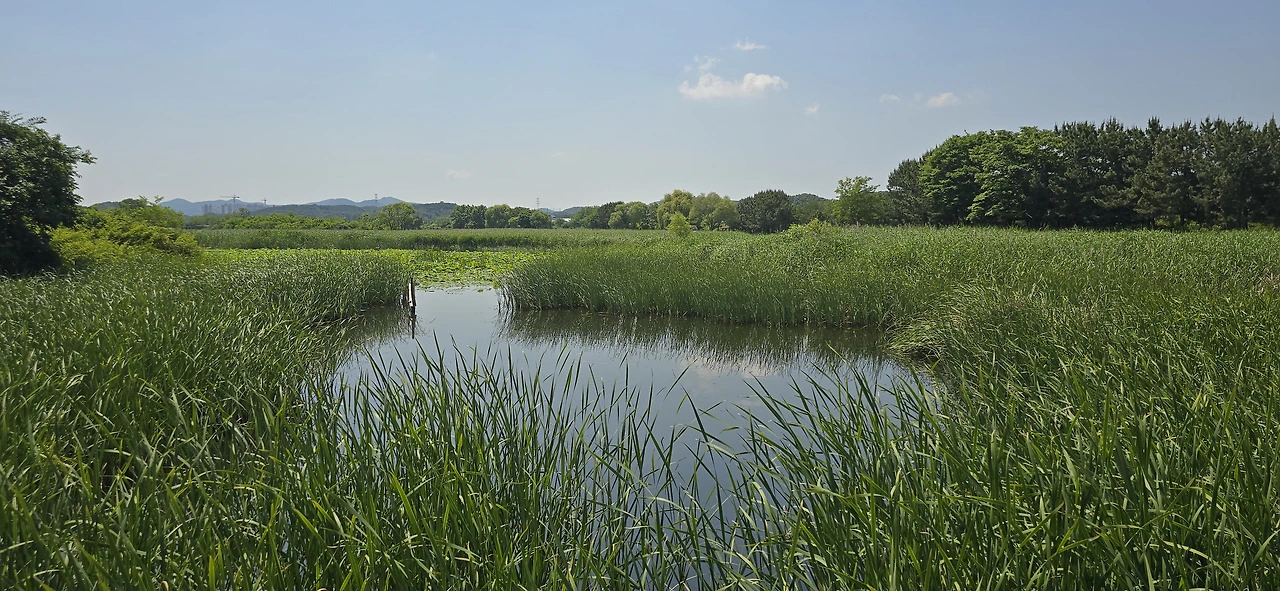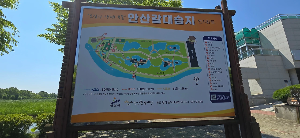 한 시간가량 버스를 타고 있으니 안산 시내를 통과해 갈대습지공원 입구에 닿았다. 자연을 온전히 보전하고 있는 습지공원 주위에 수십 층 현대식 아파트가 하늘을 찌르고 있었다. 극과 극이다. 천변을 따라 걷다 보니 공원 입구가 나타났고 직선 도로를 따라가다 보니 드디어 공원 초입이었다. 다리를 건너면서부터 습지공원 안이었다. 안내 지도를 둘러보고 대강의 방향을 잡았다. 지도에 1코스, 2코스, 3코스가 색깔로 구분돼 표시되어 있었지만 그거 무시하고 길이란 길은 최대한 다 다녀보기로 한다.