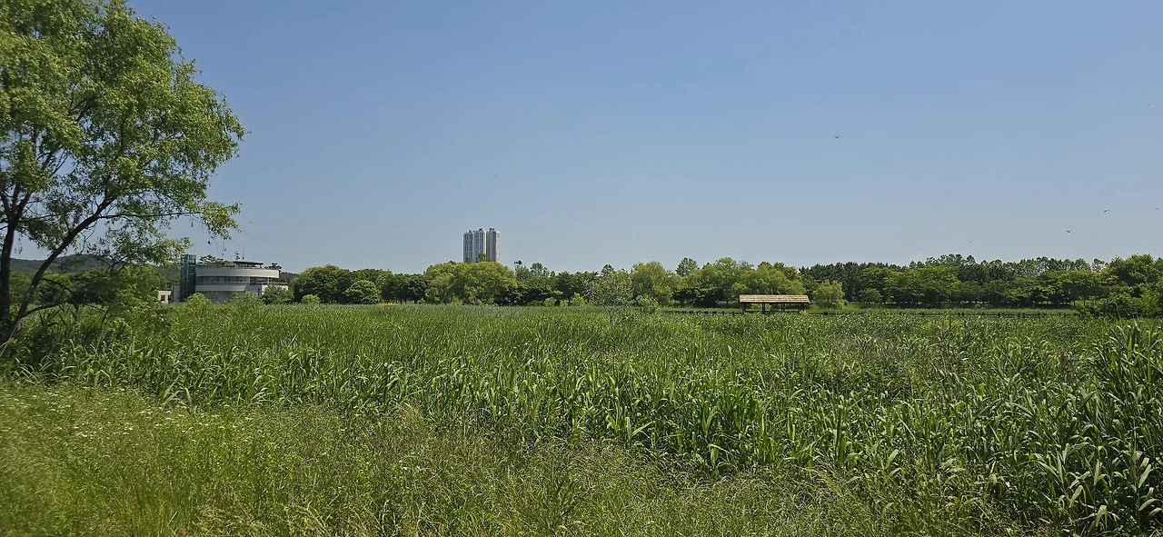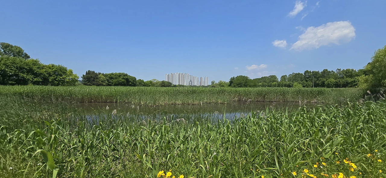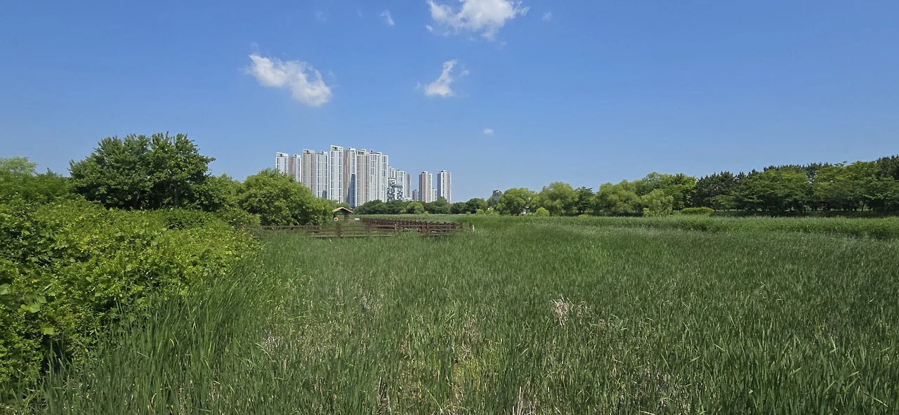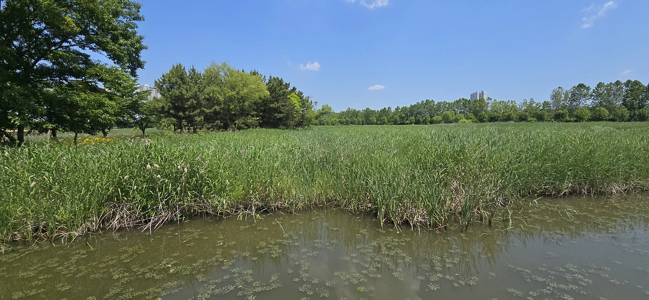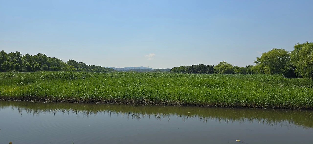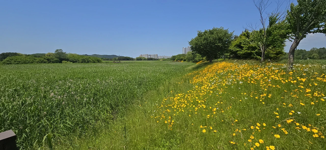 한 시간가량 버스를 타고 있으니 안산 시내를 통과해 갈대습지공원 입구에 닿았다. 자연을 온전히 보전하고 있는 습지공원 주위에 수십 층 현대식 아파트가 하늘을 찌르고 있었다. 극과 극이다. 천변을 따라 걷다 보니 공원 입구가 나타났고 직선 도로를 따라가다 보니 드디어 공원 초입이었다. 다리를 건너면서부터 습지공원 안이었다. 안내 지도를 둘러보고 대강의 방향을 잡았다. 지도에 1코스, 2코스, 3코스가 색깔로 구분돼 표시되어 있었지만 그거 무시하고 길이란 길은 최대한 다 다녀보기로 한다.
