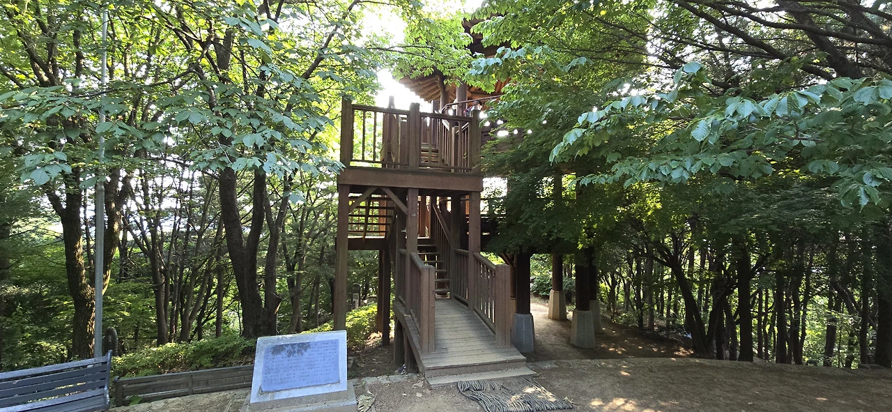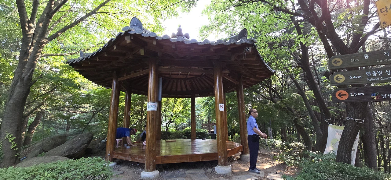산속에 꼬불꼬불 난 한적한 길을 걷다 보면 어느새 현충원 둘레길에 이른다. 그곳에선 수많은 산책객과 만날 수 있다. 길은 꽤나 넓고 표지판도 군데군데 세워져 있다. 숲속 길이 실핏줄이라면 이 둘레길은 굵은 동맥과도 같다. 드디어 서달산 정상에 이르렀다. 해발 179m다. 이곳에 동작대가 세워져 있다. 누각은 뱅글뱅글 계단을 돌아 올라야 한다.