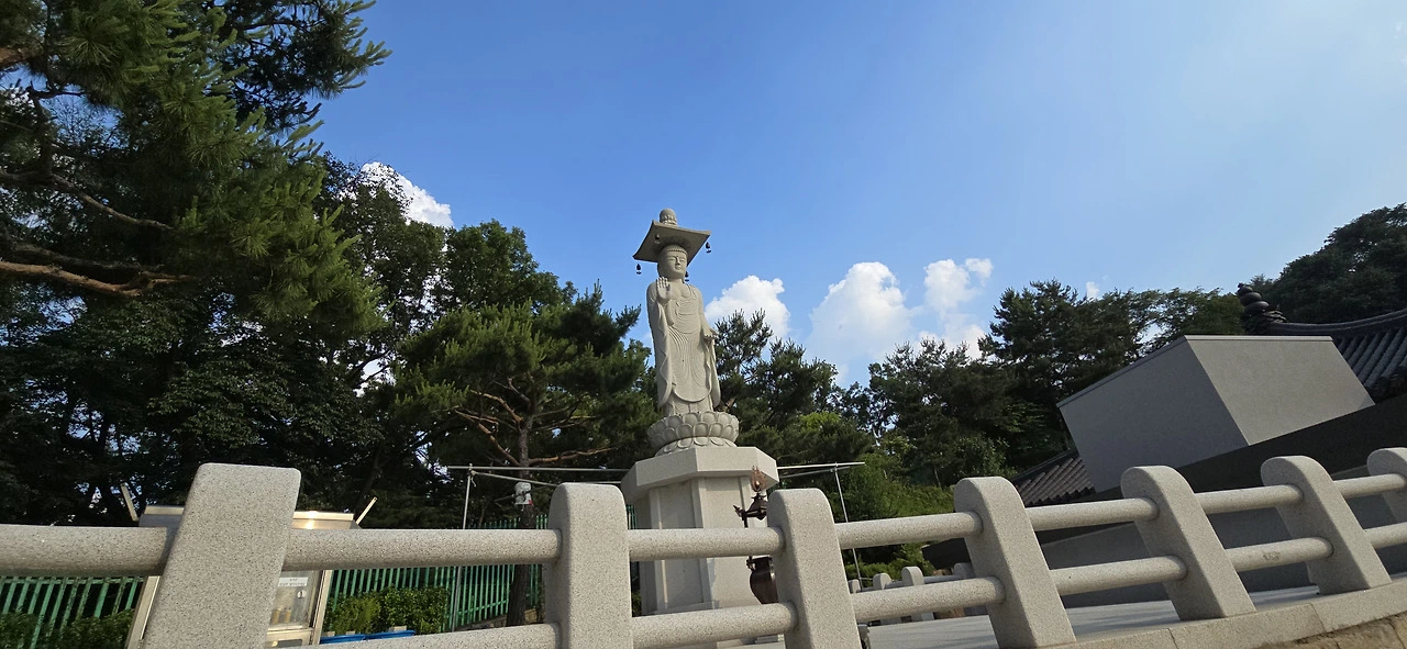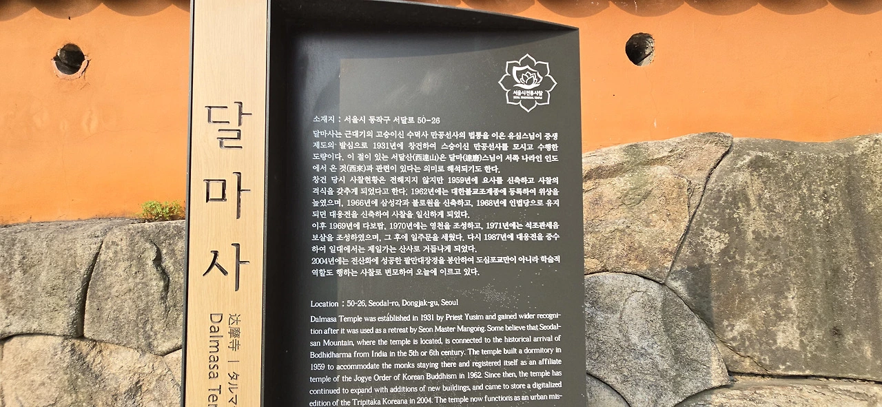 서달산 정상을 내려와 얼마 가지 않아 달마사 가는 길이 있고 그냥 지나치기 아까워 달마사에 들렀다. 꽤 웅장한 절이 산중에 자리하고 있다. 이 절의 현판은 한자보다는 한글이 더 많다. 주로 한글로 현판을 달았다. 다보탑 닮은 탑도 있고 거대한 석불도 서 있다. 이 절 주위에서 내려다보는 한강 경관에 감탄이 절로 나온다. 저 멀리 남산이 손에 잡힐 듯하다.