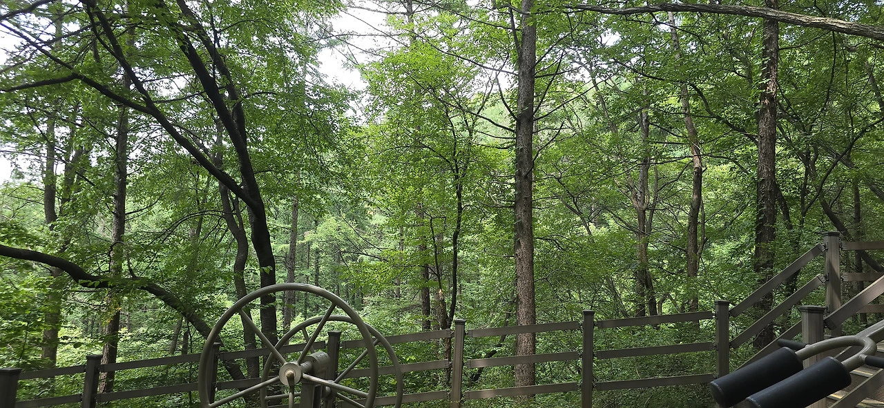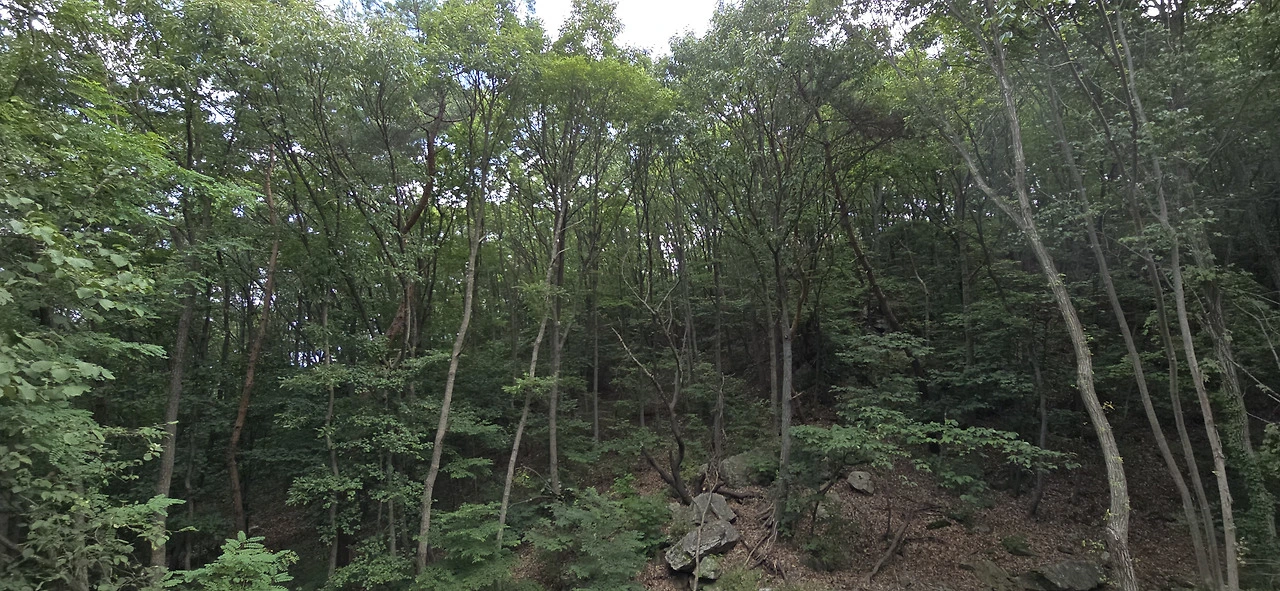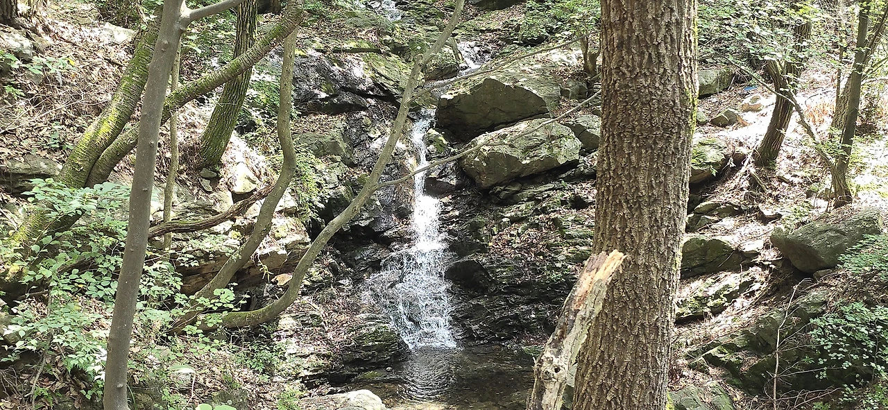 제법 숲속 길을 이리저리 휘젓고 다니다 다시 주등산로로 돌아왔다. 바라산 제1경, 제2경, 제3경, 제4경, 제5경 표지가 있는 곳으로 말이다. 와폭포라는 데도 그중 하나였는데 웅장하진 않아도 제법 폭포같아 보였다. 이렇게 해서 약 6시간에 걸쳐 12km 정도 바라산 숲속을 걸었다. 도중에 잠깐 아파트 단지 부근 도로를 걸을 때가 있었지만 나머진 모두 숲길이었다. 바라산 자연휴양림은 정말이지 서울에서 가까운 데 자리잡은 썩 훌륭한 휴양림이었다. 이번 여름에 멀리 피서를 떠나고 싶은 생각이 들지 않는다. 의왕에 울창한 수림이 있다.
