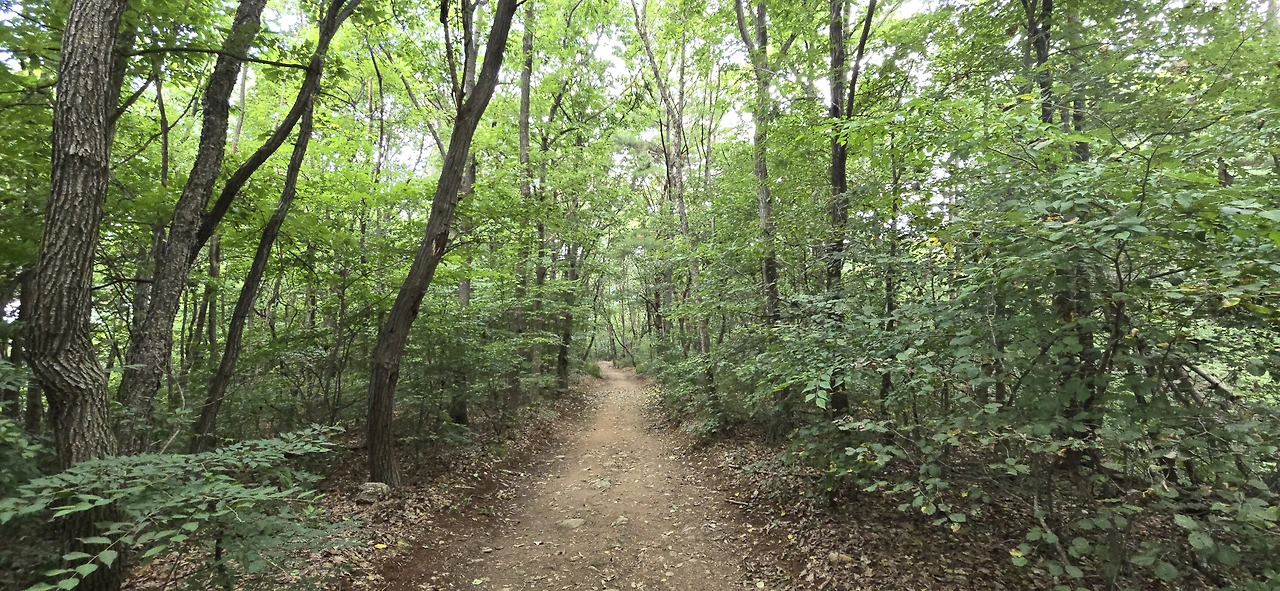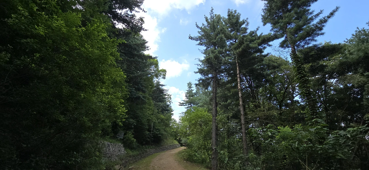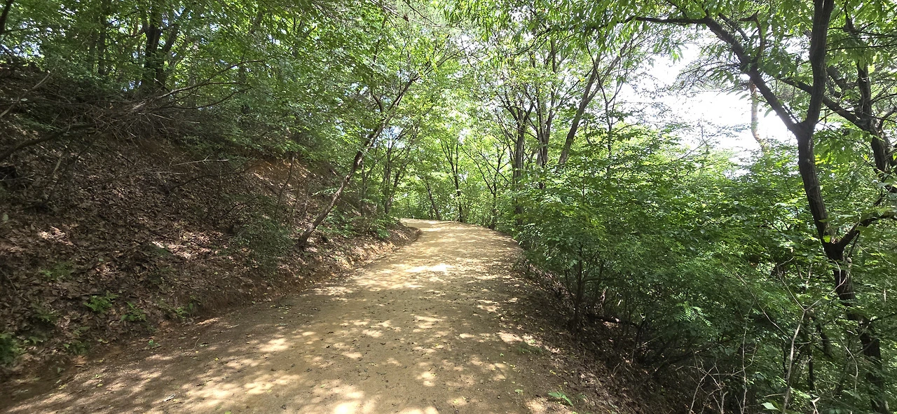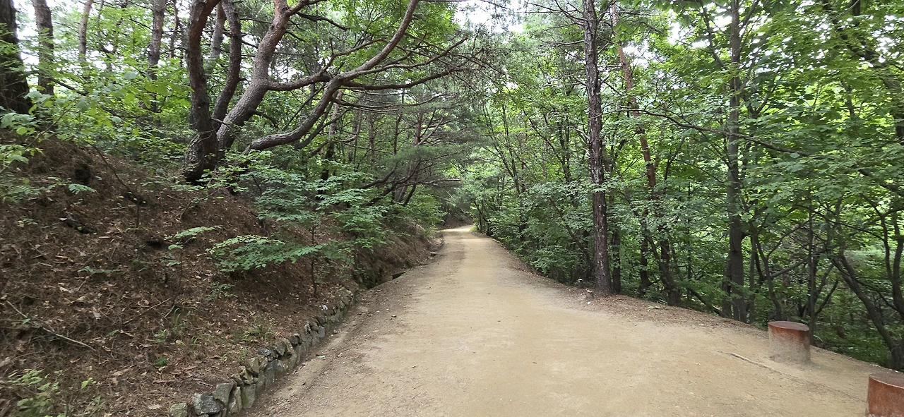 길은 계속해서 오르막이었고 포장이 돼 있었다. 그러다 마지막 주차장을 지나니 그곳부터는 비포장 임도였다. 구불구불 휘어진 임도에는 맨발로 걷는 사람이 참 많았다. 과연 곳곳에 '맨발'이라는 팻말이 붙어 있었다. 맨발로 걷기를 권장하는 표지였다. 주차장을 지났으니 차는 더 이상 보이지 않았고 이따금 걷는 사람만 눈에 띌 뿐이었다. 산속 깊은 곳이라 차 소리며 온갖 소음은 들리지 않았다. 가끔 비행기 지나는 소리가 하늘에서 들릴 뿐...