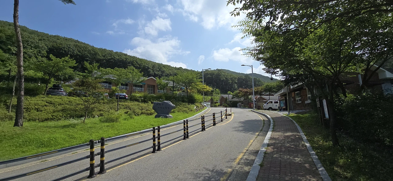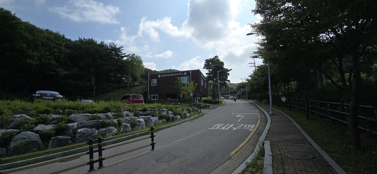 오르막 아스팔트길이 펼쳐져 있었다. 좀 이른 시간이어선지 차도 사람도 없이 조용했다. 곧 바라산 자연휴양림 매표소, 관리사무소 등이 나타났다. 그리고 여러 동의 숙소 건물이 서 있었다. 예약을 하면 이곳에서 숙박을 할 수 있나보다. 국립공원 깊숙한 곳에 들어온 느낌이었다. 바라산은 국립공원은 물론 아니고 도립공원조차 아닌데도 말이다.