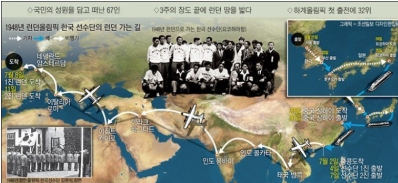 7개 종목 50명의 선수가 출전해서 동메달을 두 개 땄다. 역도와 복싱에서 각 하나씩 땄다. 메달을 못 따긴 했지만 마라톤의 최윤칠 선수는 놀라운 투혼을 보여줬다. 38km까지는 압도적 선두를 달렸단다. 38km에서 근육 경련이 일어나며 걷게 되었는데 걸으면서도 40km까지는 선두였다니 어찌 놀랍지 않나. 어떻든 조선선수단은 20일에 걸쳐 배, 기차, 비행기를 수 없이 갈아타고 런던에 도착해 올림픽에서 분투했다.