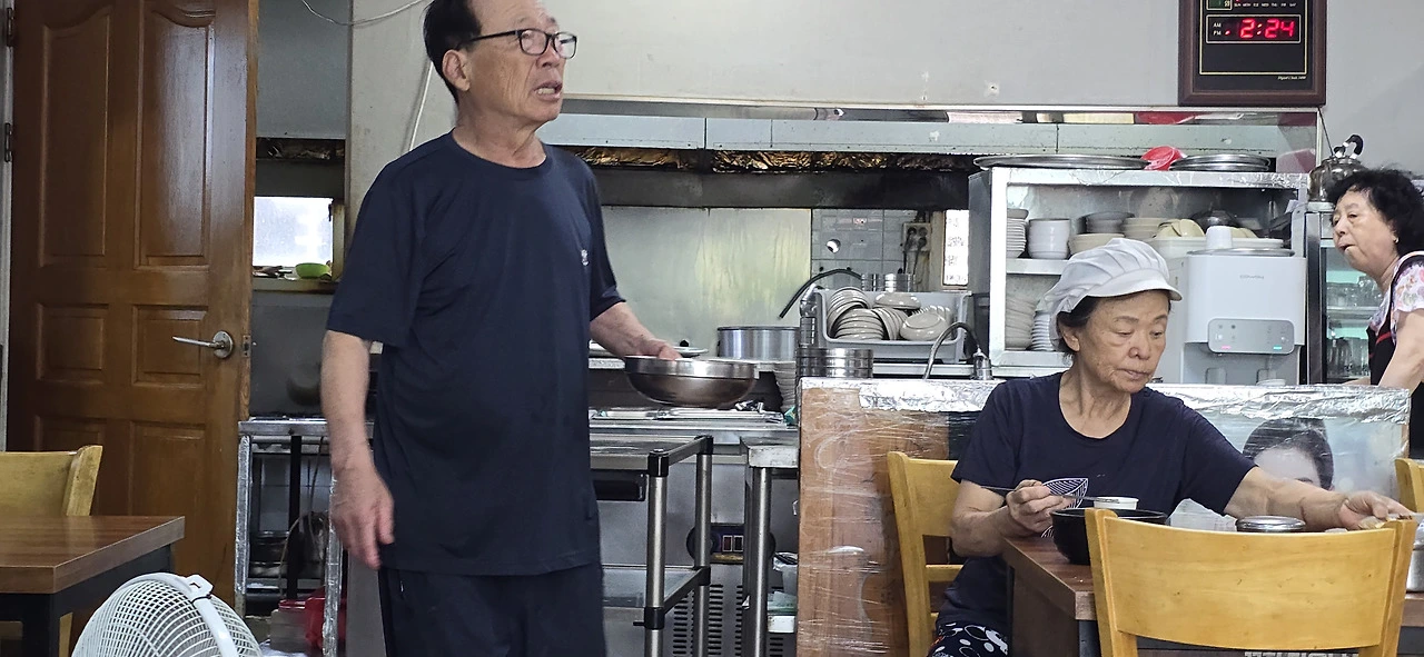 그곳에서 1~2km쯤 더 내려가서 미리 점찍어 둔 식당을 찾아갔다. 이리식당이다. <<머내여지도>>에 따르면 1977년에 문을 연 식당이란다. 머내에서 가장 오래된 식당인 것이다. 어언 47년이나 되었다. 식당 안에 들어서니 과연 그런 연륜과 딱 어울리는 정경이 펼쳐졌다. 2시가 넘었기에 손님은 별로 없었는데 할아버지 한 분과 할머니 두세 분이 일하고 계셨다. 딱 봐도 모두 70대가 넘으셨다. 이분들이 다 1977년부터 일하셨을까. 그건 아닐지도 모른다. 한두 분은 나중에 참여했을 수도. 그런데 벽 한쪽 구석에 어떤 한 남자 노인이 우두커니 앉아 있음을 곧 알아챘다. 식당 손님도 아니고 종업원도 아닌 그저 아는 사람이 그냥 거기서 지내는 게 아닌가 싶었다.