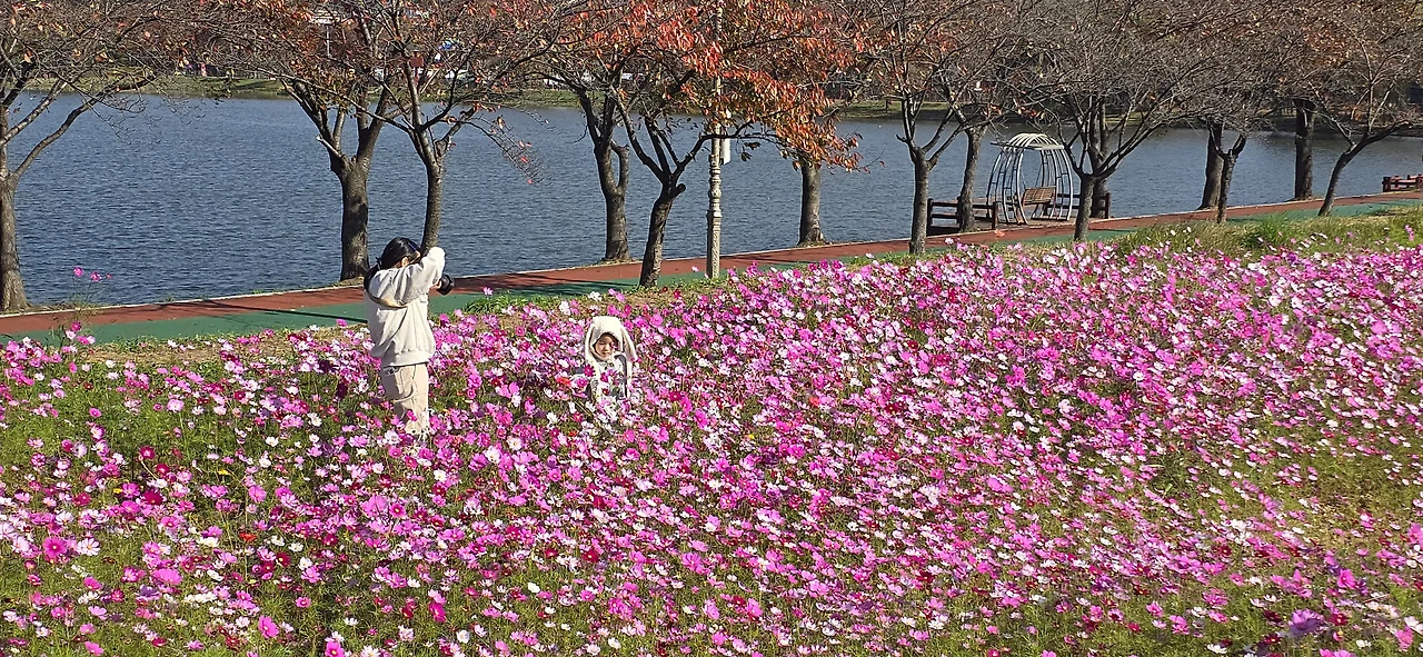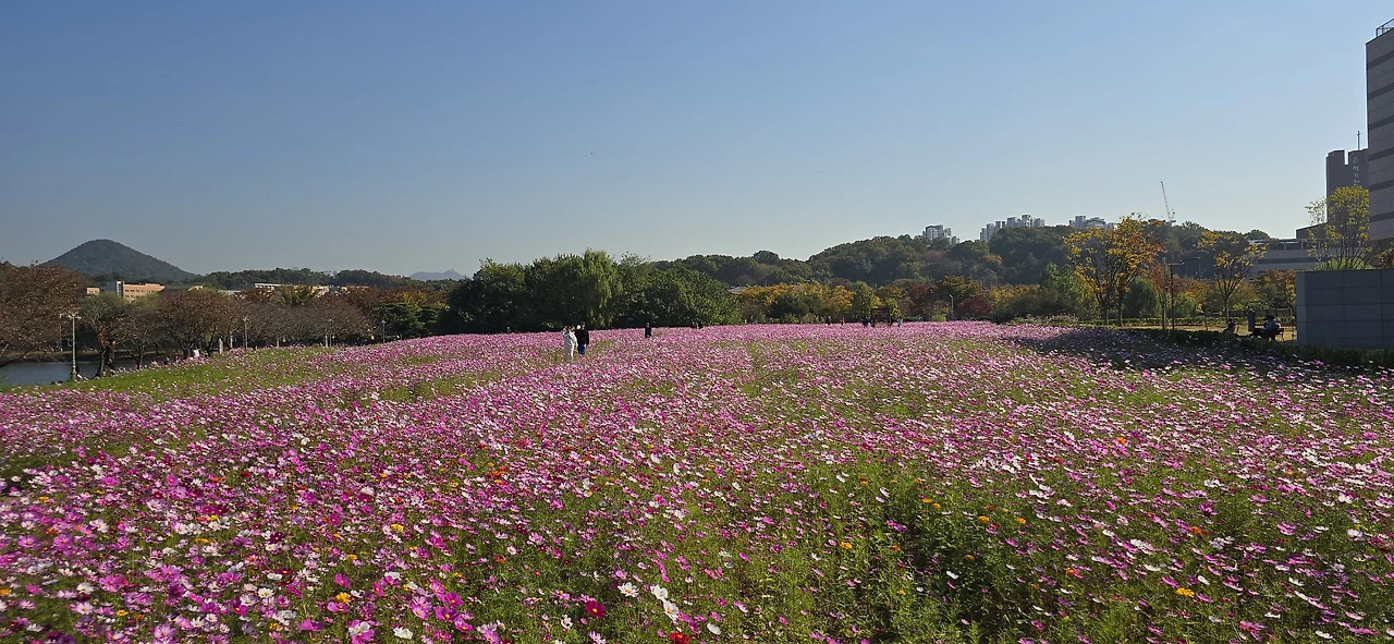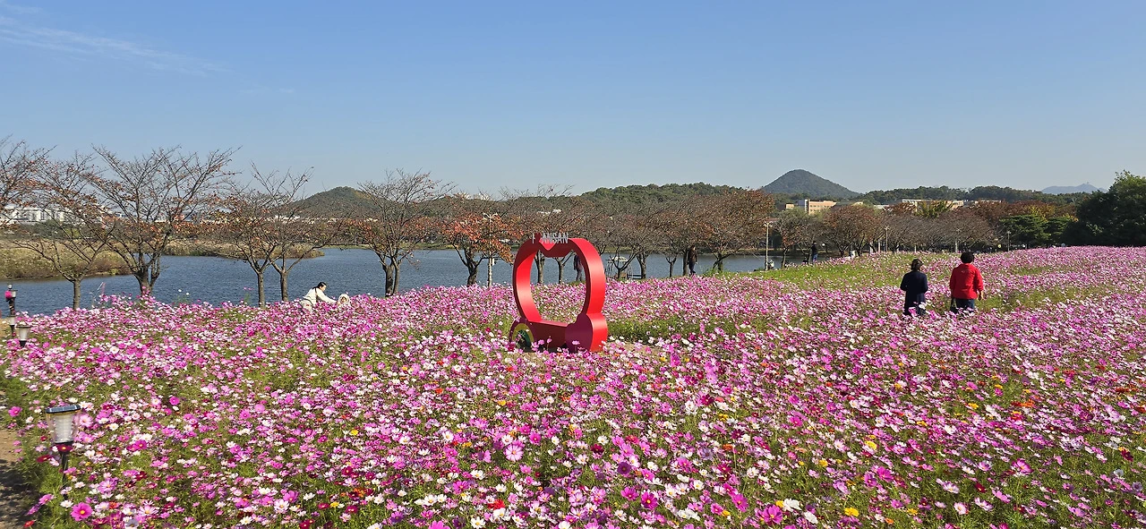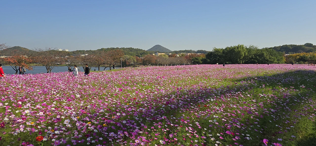 화랑유원지를 한 바퀴 돌면서 탄성을 금치 못했다. 안산을 떠나 일산에도 살아보았는데 안산 화랑유원지는 일산의 자랑인 호수공원 못지않다 싶었다. 화랑유원지에도 드넓은 호수가 있었던 것이다. 일전에 수원에 갔다가 만석공원의 호수를 보고 감탄한 적이 있었는데 화랑유원지의 호수는 그 이상이었다. 공원 안에 경기도미술관이 있는가 하면 남쪽 넓은 들에는 코스모스가 장관을 이루고 있었다. 그렇게 넓은 코스모스밭은 처음이었다.