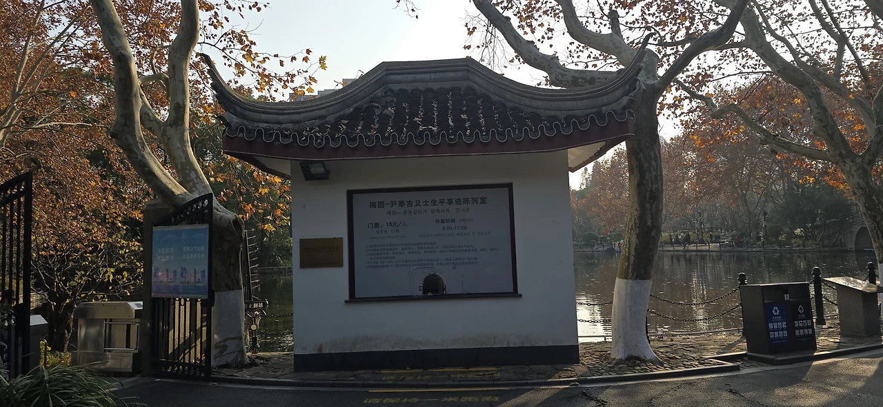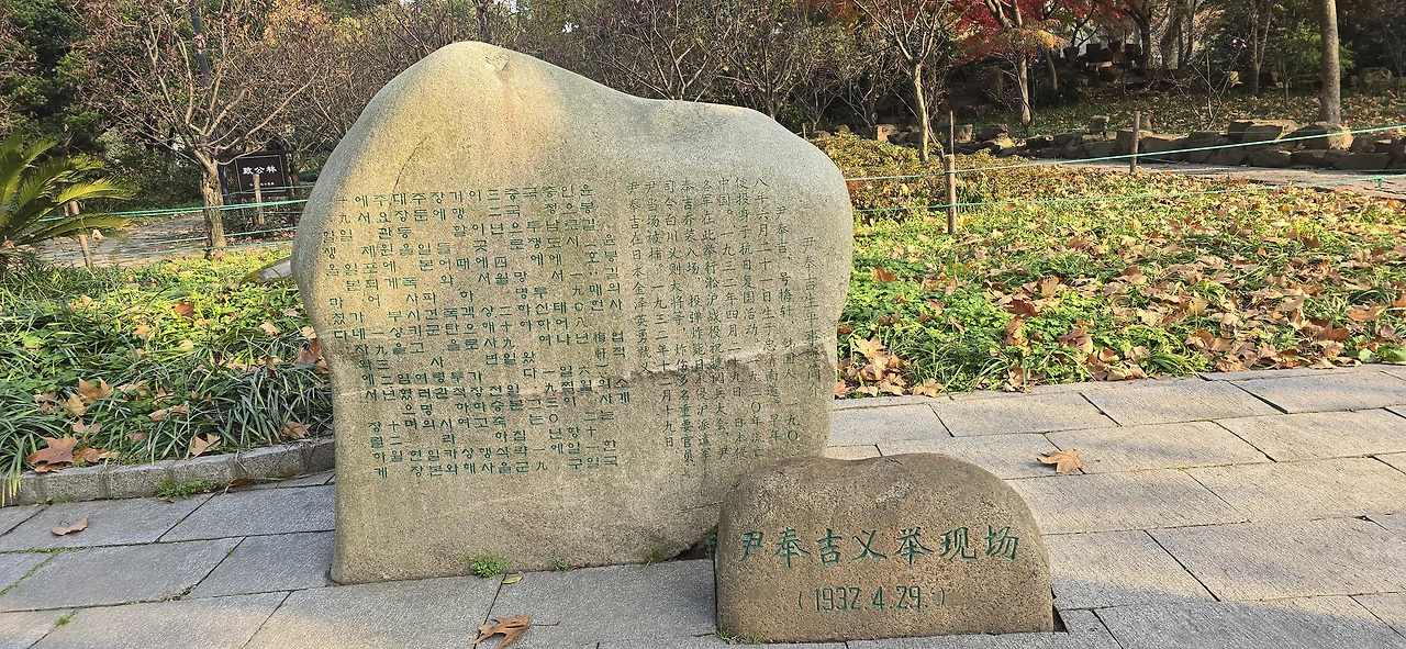 그래서인가. 알리페이로 입장권을 끊어서 들어가니 갑자기 고즈넉하다. 굳이 중국인들은 돈 내고 梅軒까지 오려고 하지 않는 것이다. 과연 자그마한 기념관 梅軒에 들어서니 사람이라곤 한국인 몇 명뿐이었다. 1층은 전시실이었고 2층에는 스크린에 윤 의사의 생애를 보여주는 영상물이 상영되고 있었다. 윤봉길 의사는 거사 당시 불과 스물네 살의 청년이었다. 이미 순국은 결심한 터, 일본 요인들을 폭살한 후 체포되어 약 8개월 뒤 일본 가나자와 육군형무소 공병작업장에서 결박당한 채 총탄에 맞아 장렬히 산화했다. 梅軒을 나와 좁은 길을 따라 걸었다. 아무도 없는 길을 말이다. 시끌벅적한 공원과 梅軒은 절연되어 있었다. 공원으로 나오기 위해서는 처음에 입장권을 사서 들어왔던 입구로 나가야 했다. 다시 시끄러운 공원으로 돌아왔다.