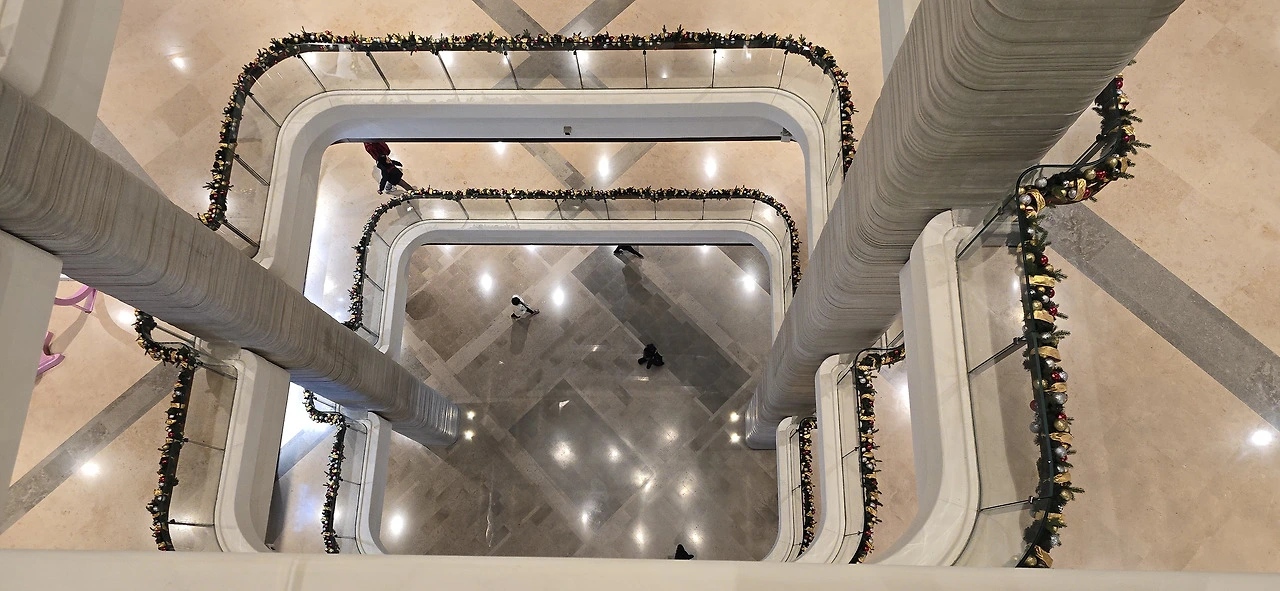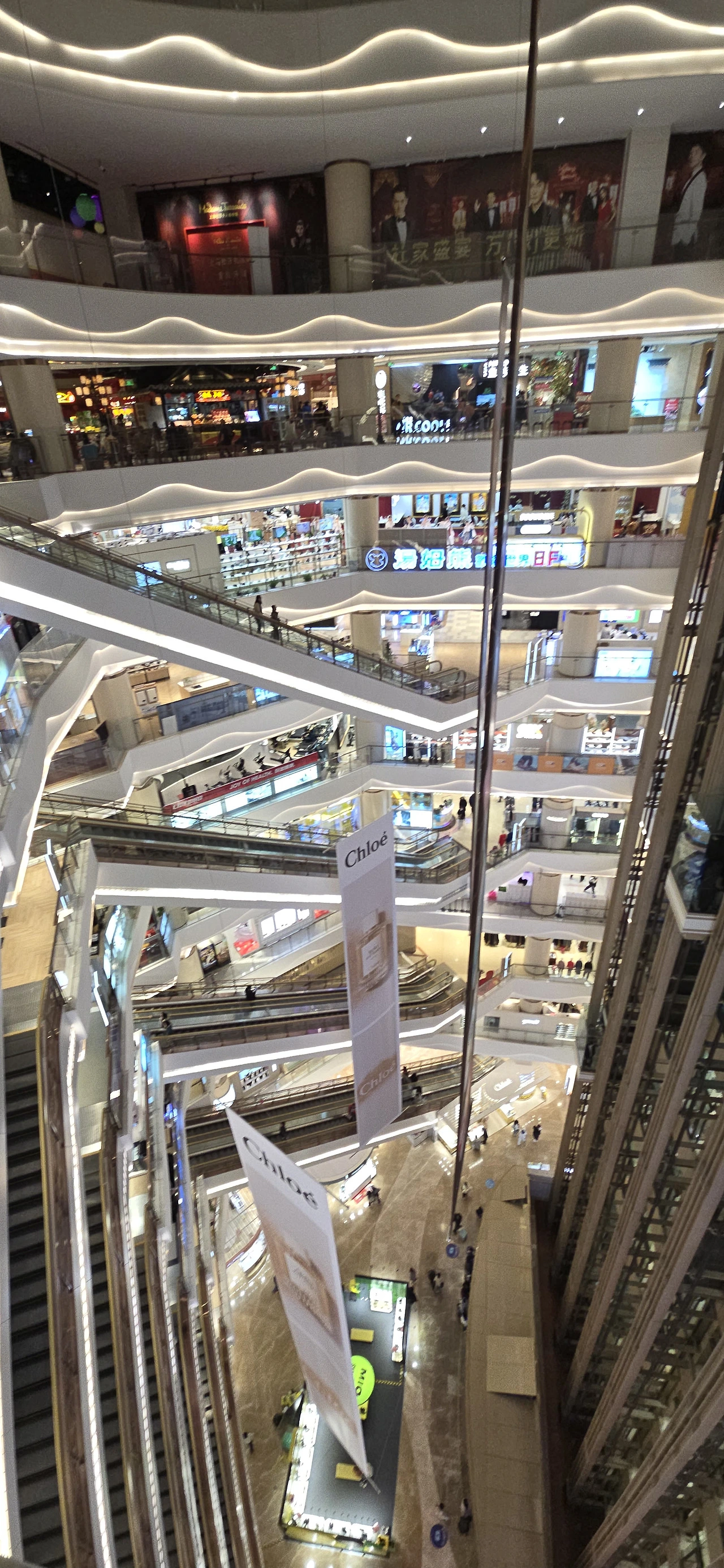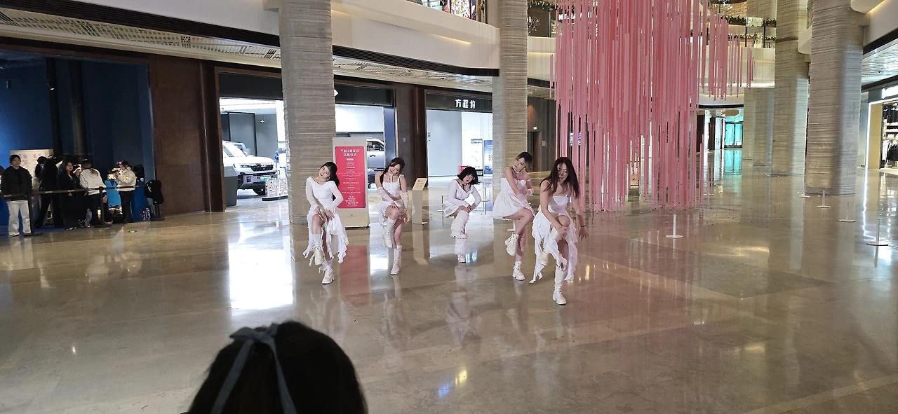 지하철을 타고 江宁路역에서 내렸다. 꽤 걸어야 大洋晶典·天安千树에 이를 거라고 생각했다. 그런데 아니었다. 10분도 못 걸어 유튜브에서 보았던 건물 大洋晶典이 나타나지 않는가. 사람들을 따라 안으로 들어갔다. 안은 커다란 쇼핑몰이었다. 1층은 탁 트여 있었고 본격적인 상점은 2층부터 있었다. 에스컬레이터를 타고 한 층 한 층 올라가기 시작했다. 끝 층에 고급스러워 보이는 식당이 있었고 옥상 야외에도 테이블이 있었다. 그런데 모습이 특이하다. 비닐 천막 같은 게 여럿 쳐져 있고 그 안에 손님들이 들어앉아 음식을 먹으며 이야기하고 있었다. 옥상으로 난 입구에 종업원들이 서 있었지만 들어서는 구경하러 들어가는 나를 제지하지 않았다. 옥상으로 나가서 아래를 굽어 보았다. 까마득히 아래로 강이 흐르고 있었다. 苏州河였다. 황푸강의 지류다. 강을 내려다보며 사진을 몇 장 찍고 나왔다. 1층으로 내려오니 드넓은 공간에 소녀들이 수십 명 앞에서 춤을 추고 있었다. 아이돌 지망생으로 보이는 소녀들은 아주 어렸다. 10대 초반이나 중반쯤으로 보였으니 말이다.
