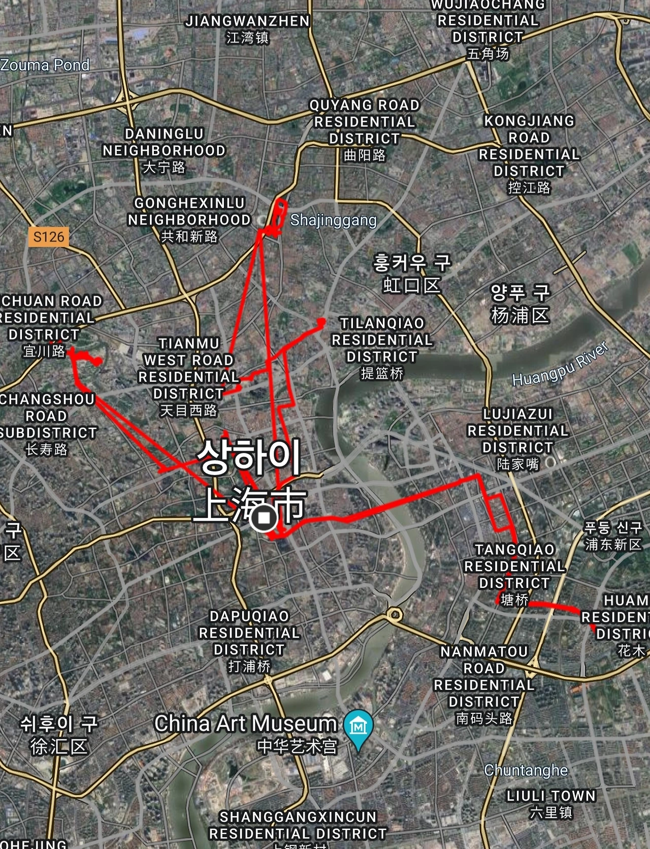 다시 江宁路역으로 돌아와 지하철을 타고 난징시루역에서 내렸다. 인민광장역으로 가기 위해 지하철을 환승해야 했다. 그런데 환승이 특이하다. 역 안에서 갈아타는 게 아니었다. 완전히 역을 빠져나온 다음에 새로 타야 했다. 그런데 역을 찾는 게 간단치 않았다. 방향 표시가 있긴 했으나 갑자기 길을 잃은 느낌이었다. 인파는 엄청나고 역 입구는 찾아지지 않고 잠시 당황했으나 다행히 곧 입구를 찾을 수 있었다. 한 정거장을 타고 가 인민광장역에서 내렸다. 그곳에서 어마어마한 인파에 압도당했다. 세 노선이 만나는 인민광장역은 참으로 사람이 많았다. 출구도 또한 이만저만 많지 않다. 20호 출구로 나왔는데 유독 그 출구만은 희한하게 사람이 적었다. 버스투어를 하고 싶었다. 이제 하룻밤만 자면 서울로 돌아간다. 사흘 동안 부지런히 상하이 시내를 돌아다녔는데 편안하게 2층 버스에 앉아서 시내를 굽어보고 싶었다. 그러나 뜻은 이뤄지지 않았다. 버스투어 정류장으로 보이는 곳에 서서 QR코드를 찍었으나 정보가 안 뜬다. 뭐가 문제인지 모르겠다. 근처의 다른 곳으로 가서 버스투어 2층버스가 오나 보았으나 역시 안 온다. 결국 버스투어를 포기했다. 대신 일반 버스를 타기로 했다. 버스 노선을 알지도 못한다. 아무 버스나 타기로 했다. 451路 버스가 오길래 냉큼 탔다. 그 버스는 푸둥 지구로 가는 버스였다. 황푸강은 지하터널로 건넜다. 황푸강 지하에 자동차가 다니는 터널이 뚫려 있는 것이다. 퇴근 시간이어서 그런가 터널을 빠져나와 푸둥 지구 일부 구간에서 심한 교통 정체가 있었다. 그 곳을 빠져나온 후로는 버스는 맹렬히 달렸다. 어디가 어딘지 모르지만 어둠 속에 시가지는 이어지고 있었다. 버스는 거의 난폭운전에 가깝게 달렸는데 더 이상 가서는 안 되겠다 싶어 한 정거장에서 내렸다. 그리고 반대편으로 가서 버스를 타고 시내로 들어가야겠다고 생각하고 길을 건너려 하는데 신호등 있는 횡단보도가 왜 이리 먼가. 그뿐이 아니다. 아까 내린 곳 바로 맞은편에 반대쪽 버스정류장이 있어야 마땅하건만 그렇지 않다. 훨씬 더 먼 곳까지 가야 버스정류장이 있었으니 말이다. 다행히 451路 버스가 오래지 않아 왔고 그걸 타고 반대 방향으로 향했다. 역시 황푸강 지하터널을 지났고 시내 한복판인 大世界에 오니 정체가 엄청났다. 인민광장에서 내렸다.