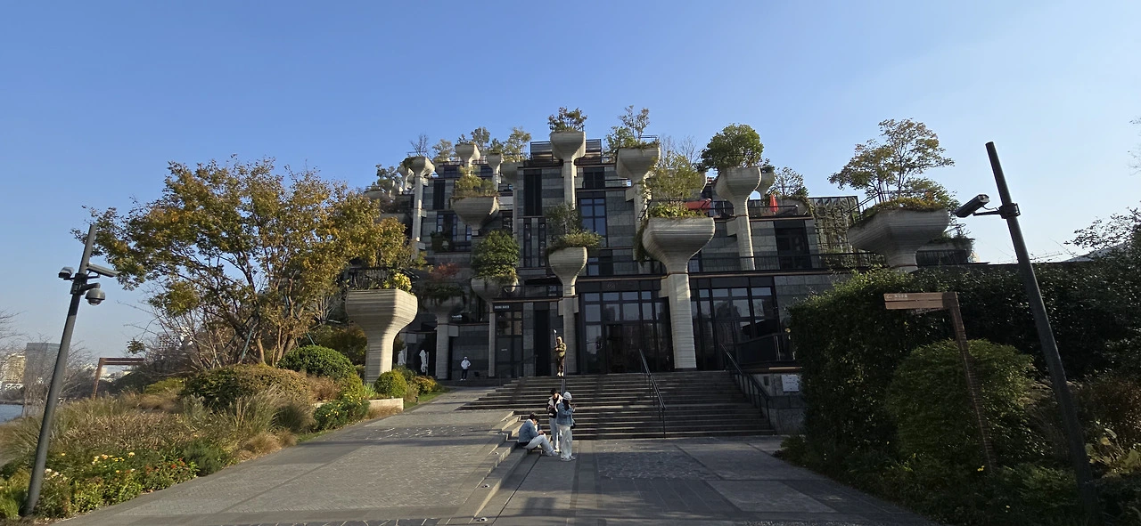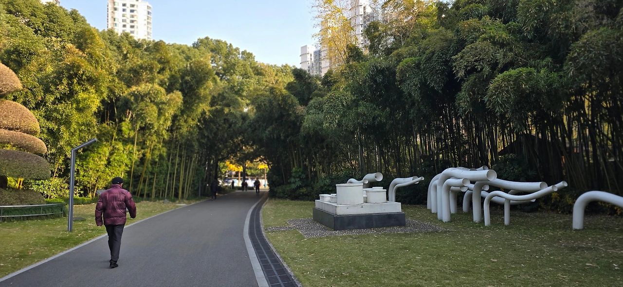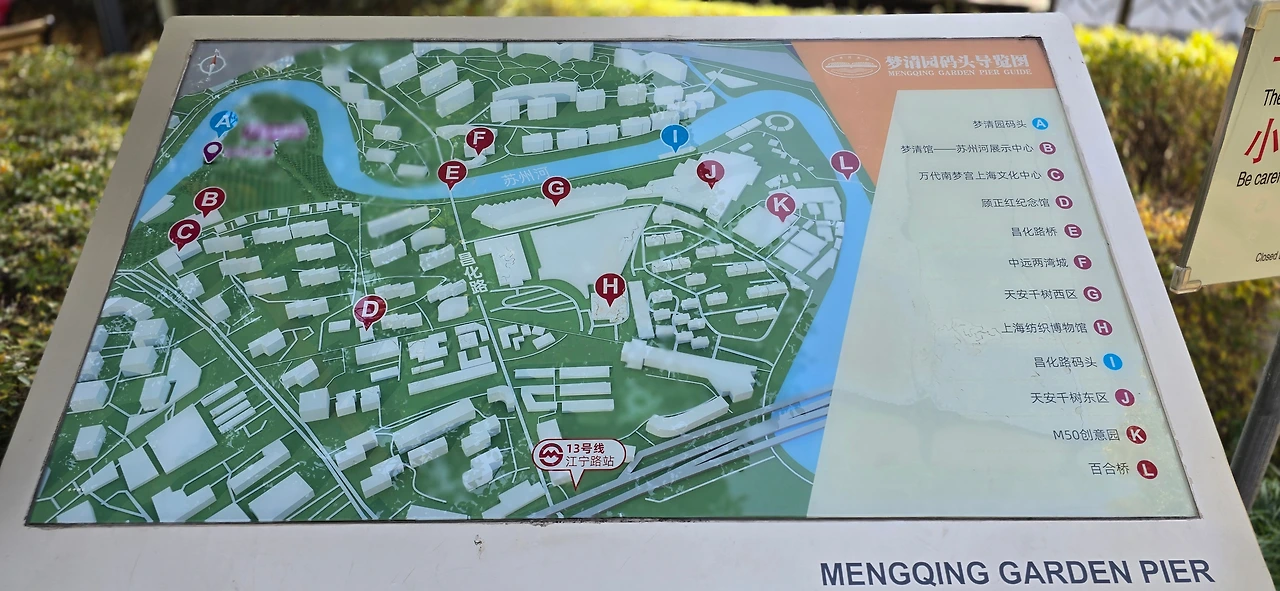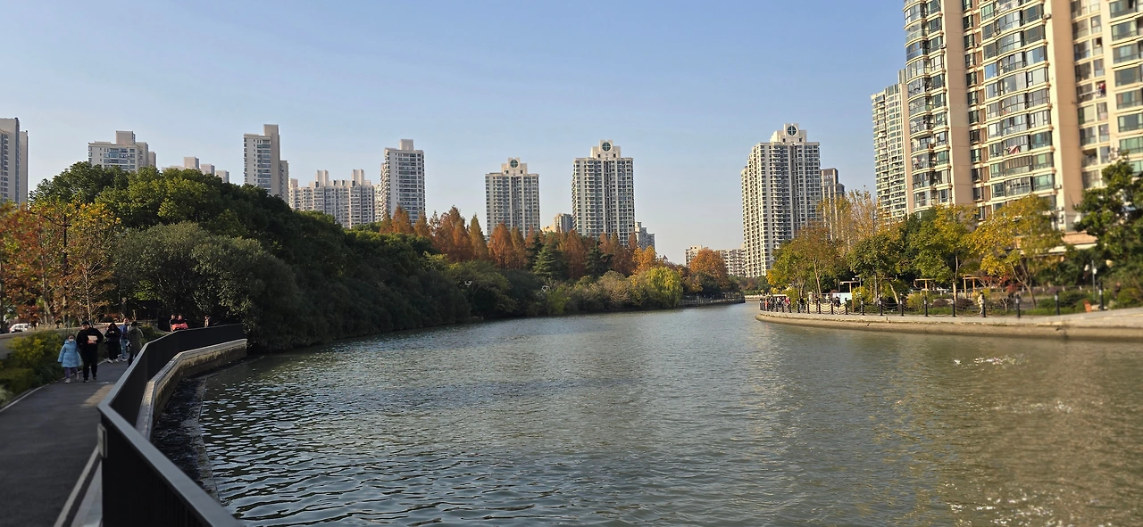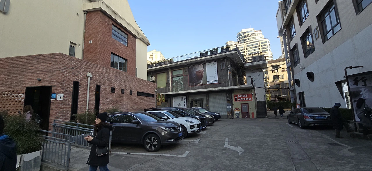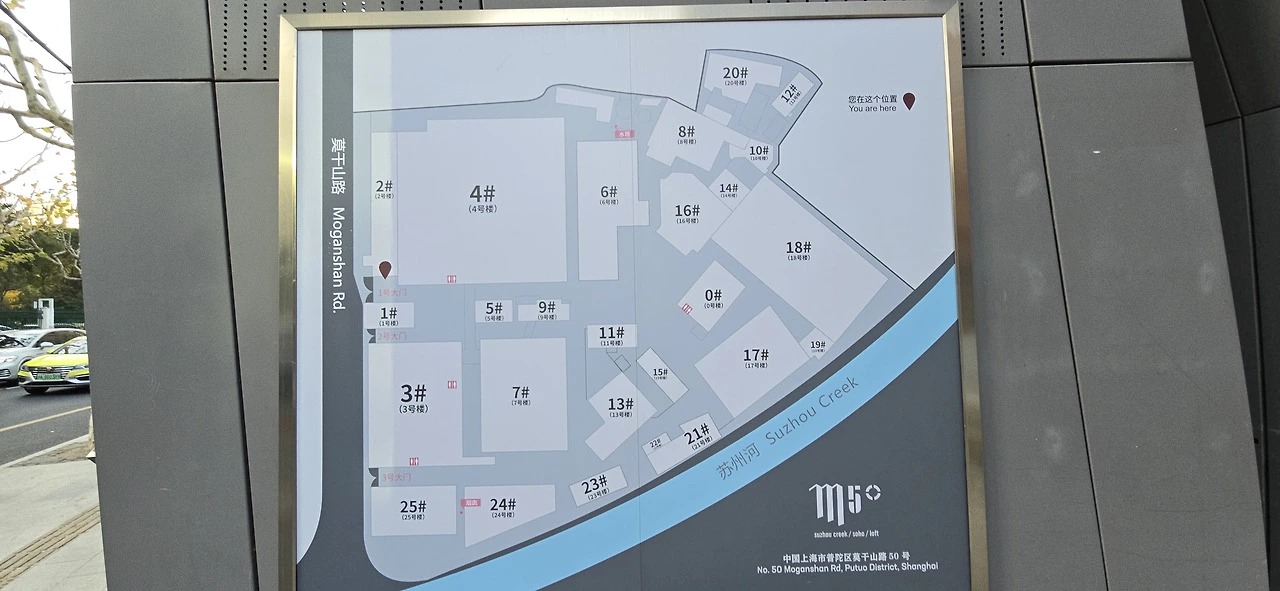 大洋晶典 안은 별로 특징적인 것이 없었다. 여느 쇼핑몰과 그리 다르지 않았다. 大洋晶典을 나왔다. 大洋晶典·天安千树는 밖에서 보아야 진가가 드러난다. 건물 외양의 디자인이 가히 환상적이다. 千树는 천 그루의 나무란 뜻 아닌가. 건물 외벽에 나무를 심을 수 있는 툭 튀어나온 시설물을 둔 뒤 나무를 심었다. 그게 천 개인 모양이다. 아니 정확히 천 개는 아닐지 모른다. 어쨌든 그런 외부 디자인을 한 건축물을 지구상에서 좀체 찾기 어려울지 모른다. 어떤 건축가의 아이디어인지 참으로 경탄스러웠다. 大洋晶典·天安千树 밖에 난 길을 굽이굽이 돌아 주차장 입구의 외벽의 그림을 감상했다. 이 벽화 또한 유튜브에서 보았던 것이다. 상하이의 옛 모습을 단편적으로 그려 놓았다. 大洋晶典·天安千树는 두 덩어리였다. 大洋晶典이 있는 쪽은 완성되어 있었고 다른 한 덩어리는 한창 공사 중이었다. 신축인지 보수 공사인지는 알 수 없었다. 길을 건넜다. 건너편은 큰 가구 상가였다. 침대며 주방용품 등이 상점마다 전시되어 있었다. 거기서 梦百合이라는 브랜드를 보았다. 아! 세계바둑대회를 개최한 회사가 바로 여기였구나! 가구 상가를 나와 苏州河에 놓인 다리를 건넜다. 苏州河 북쪽 강변에 있는 산책로를 걷기 위해서였다. 그러나 산책로로 가는 입구를 찾지 못했다. 막혀 있었다. 결국 다시 다리를 건너서 제자리로 돌아온 뒤 苏州河 남쪽 강변 산책로를 걸었다. 방향은 둘이다. 동쪽으로 가면 上海M50创意园이 나오고 서쪽으로 가면 큰 공원이 있다. 苏州河梦清园环保主题公园이었다. 梦清园环保主题公园으로 방향을 잡았다. 애초 계획에 없었던 곳이지만 그냥 가보기로 했다. 꽤나 넓은 공원이었고 수목이 우거지고 여러 가지 시설이 많았다. 강변에 있는 그 공원 산책로를 걷다 보면 苏州河를 건널 수 있지 않을까 했는데 끝내 다리는 없었다. 결국은 공원을 다 돌아보고 원래 자리인 大洋晶典·天安千树로 돌아왔다. 그리고 애초 계획했던 上海M50创意园을 향했다. 여기까지 와서 上海M50创意园을 보지 않고 그냥 갈 수는 없다고 생각했다. 과연 별세계가 펼쳐져 있었다.