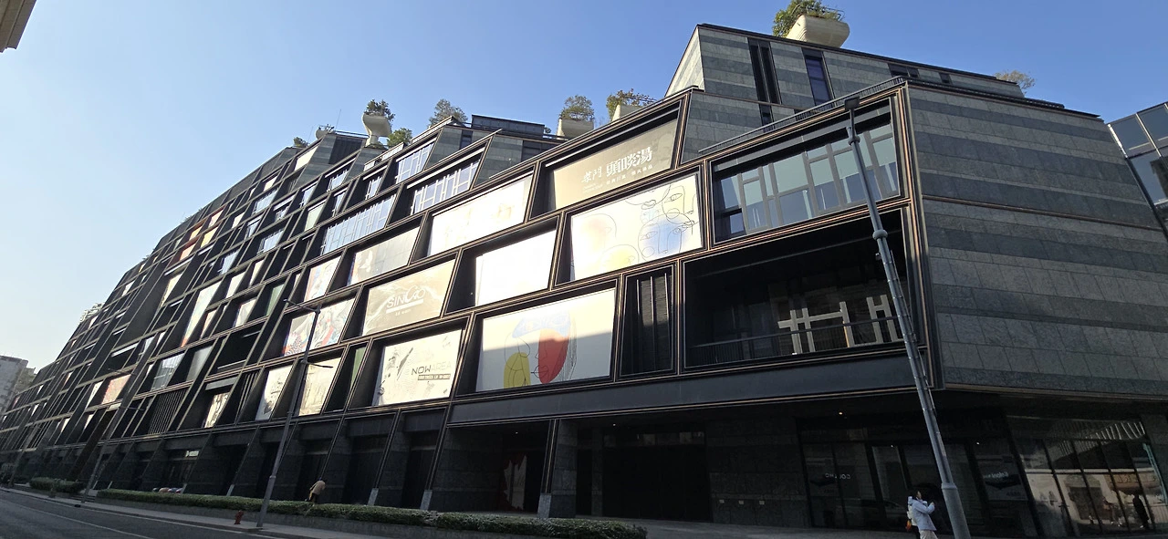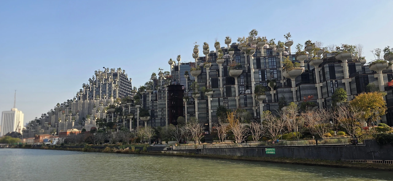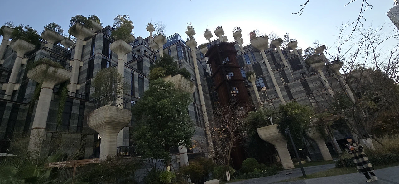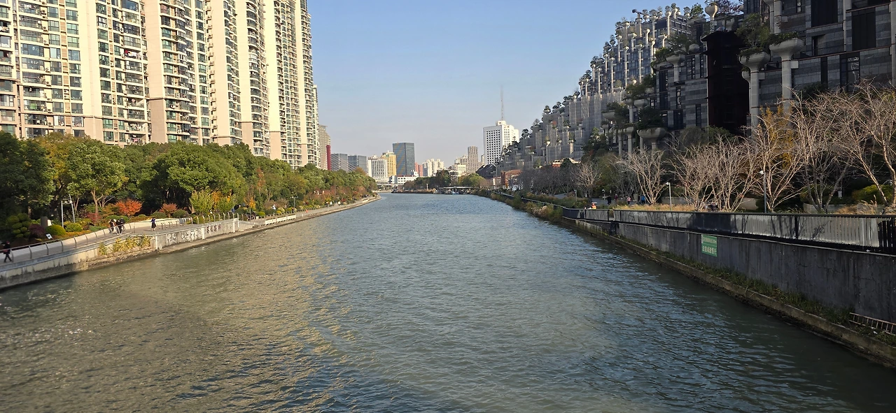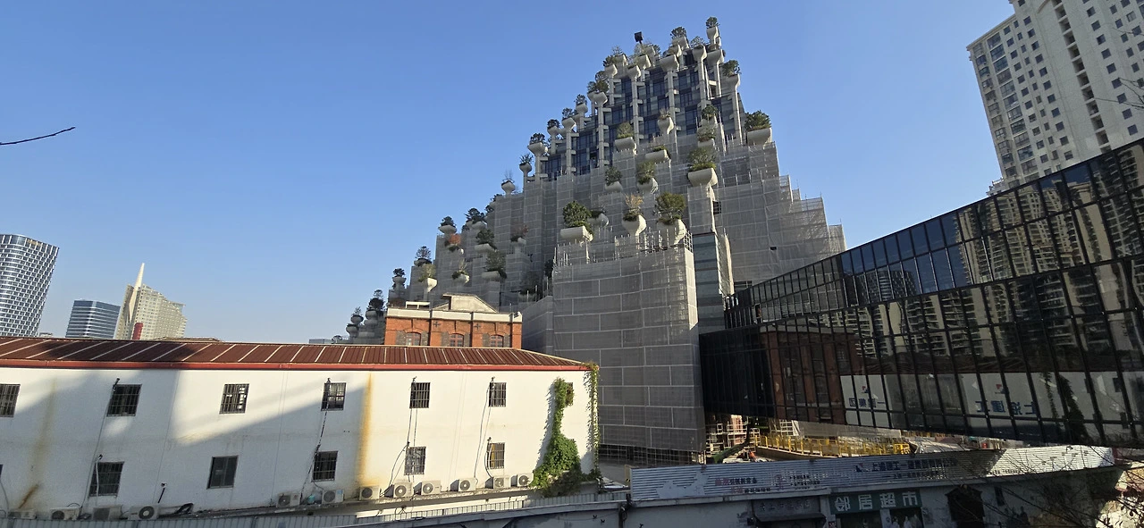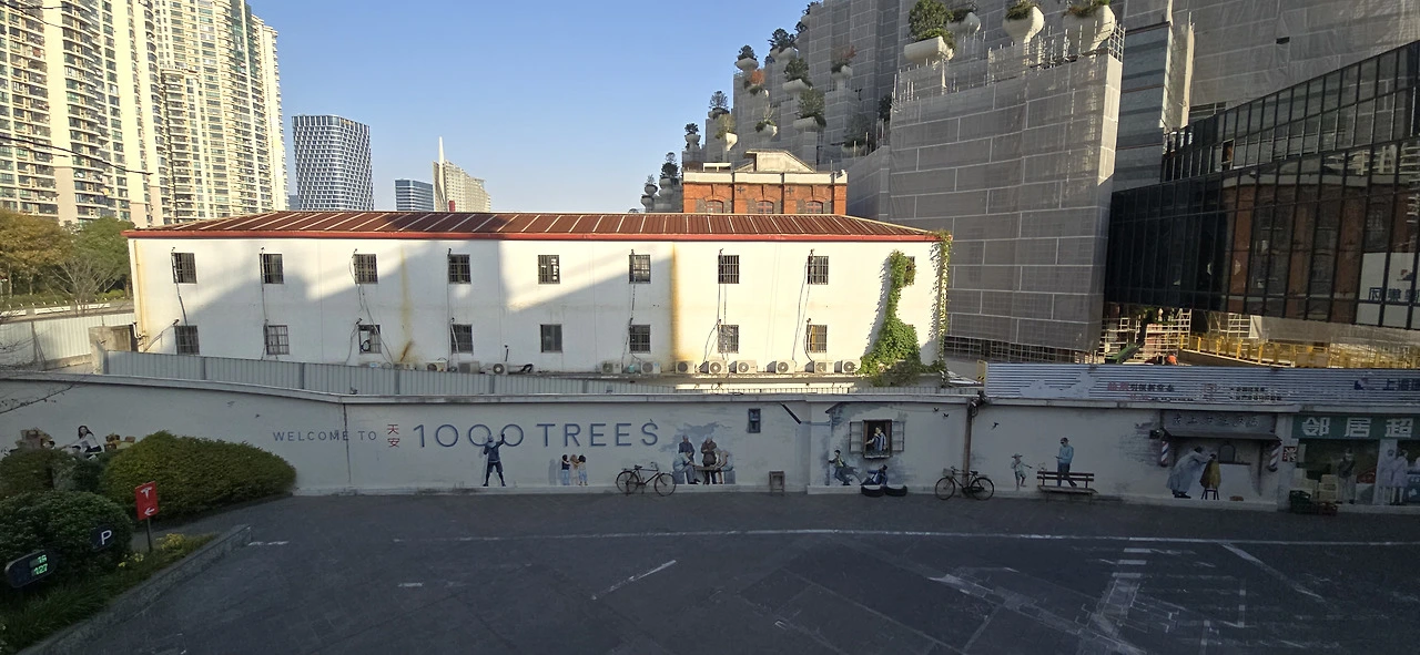 大洋晶典 안은 별로 특징적인 것이 없었다. 여느 쇼핑몰과 그리 다르지 않았다. 大洋晶典을 나왔다. 大洋晶典·天安千树는 밖에서 보아야 진가가 드러난다. 건물 외양의 디자인이 가히 환상적이다. 千树는 천 그루의 나무란 뜻 아닌가. 건물 외벽에 나무를 심을 수 있는 툭 튀어나온 시설물을 둔 뒤 나무를 심었다. 그게 천 개인 모양이다. 아니 정확히 천 개는 아닐지 모른다. 어쨌든 그런 외부 디자인을 한 건축물을 지구상에서 좀체 찾기 어려울지 모른다. 어떤 건축가의 아이디어인지 참으로 경탄스러웠다. 大洋晶典·天安千树 밖에 난 길을 굽이굽이 돌아 주차장 입구의 외벽의 그림을 감상했다. 이 벽화 또한 유튜브에서 보았던 것이다. 상하이의 옛 모습을 단편적으로 그려 놓았다. 大洋晶典·天安千树는 두 덩어리였다. 大洋晶典이 있는 쪽은 완성되어 있었고 다른 한 덩어리는 한창 공사 중이었다. 신축인지 보수 공사인지는 알 수 없었다. 길을 건넜다. 건너편은 큰 가구 상가였다. 침대며 주방용품 등이 상점마다 전시되어 있었다. 거기서 梦百合이라는 브랜드를 보았다. 아! 세계바둑대회를 개최한 회사가 바로 여기였구나! 가구 상가를 나와 苏州河에 놓인 다리를 건넜다. 苏州河 북쪽 강변에 있는 산책로를 걷기 위해서였다. 그러나 산책로로 가는 입구를 찾지 못했다. 막혀 있었다. 결국 다시 다리를 건너서 제자리로 돌아온 뒤 苏州河 남쪽 강변 산책로를 걸었다. 방향은 둘이다. 동쪽으로 가면 上海M50创意园이 나오고 서쪽으로 가면 큰 공원이 있다. 苏州河梦清园环保主题公园이었다. 梦清园环保主题公园으로 방향을 잡았다. 애초 계획에 없었던 곳이지만 그냥 가보기로 했다. 꽤나 넓은 공원이었고 수목이 우거지고 여러 가지 시설이 많았다. 강변에 있는 그 공원 산책로를 걷다 보면 苏州河를 건널 수 있지 않을까 했는데 끝내 다리는 없었다. 결국은 공원을 다 돌아보고 원래 자리인 大洋晶典·天安千树로 돌아왔다. 그리고 애초 계획했던 上海M50创意园을 향했다. 여기까지 와서 上海M50创意园을 보지 않고 그냥 갈 수는 없다고 생각했다. 과연 별세계가 펼쳐져 있었다.