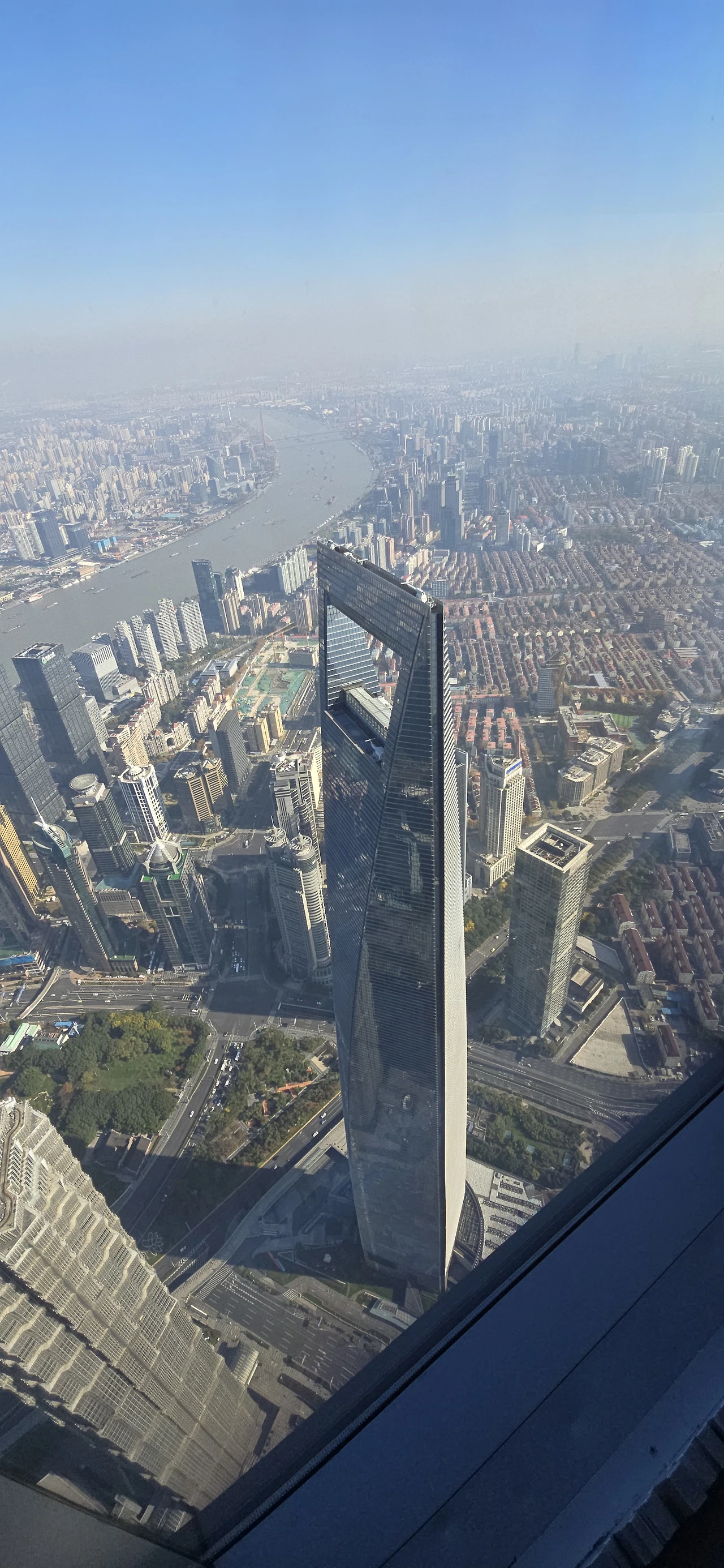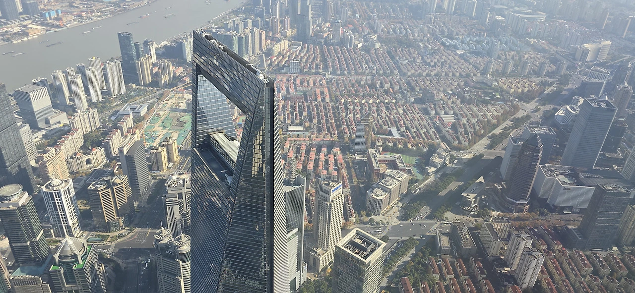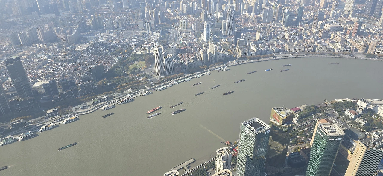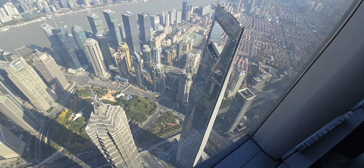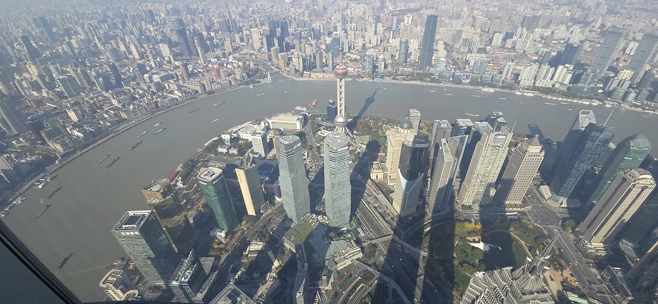 날씨가 청명하지 않아서 썩 잘 보이진 않았지만 그래도 비가 왔다면 더 안 보였을 거 아닌가. 그런대로 만족했다. 며칠 동안 다닌 곳이 웬만큼 다 보였다. 루쉰공원, 예원 등이 눈에 들어왔고 인민공원은 워낙 부근에 높은 빌딩이 많아 알아볼 수 없었다. 1933老场坊이나 大洋晶典·天安千树도 눈에 띄지 않았다. 그러나 황푸강 주변은 확연히 눈에 들어왔고 무엇보다 루자쭈이의 고층 빌딩들이 다 한참 아래에 있는 것이 신기하게 느껴졌다. 특히 일명 병따개 빌딩인 上海环球金融中心이 자그맣게 보이는 것은 놀라웠다. 상하이타워가 얼마나 높은지를 여실히 보여주었다. 전망대를 한 바퀴 돌고 아쉬워서 빠른 속도로 동영상을 켠 채로 한 바퀴를 더 돌았다. 입장료 180위안(36,000원)이 아깝지 않았다. 기계의 힘으로 순식간에 해발 536m를 올라왔으니 문명의 이기 위력이 참 대단하다. 이걸로 서울 살면서도 롯데타워 한번 가보지 않은 아쉬움을 상하이에서 대신 풀었다. 느낌이 비슷하지 않겠는가.