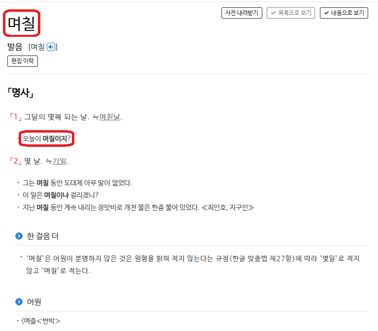 국어사전을 따른다면 정답은 (2)지 (1)이 아니다. (1)은 틀렸다. 왜냐하면 국어사전에 '며칠'이라는 단어가 올라 있기 때문이다. 이렇다.