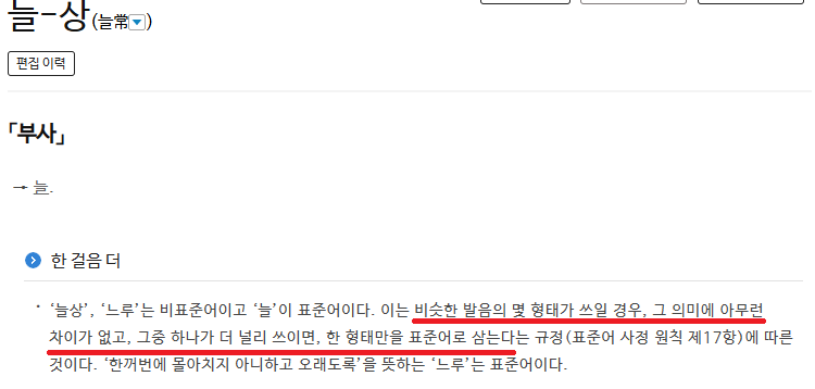 브런치에서 글을 쓰다가 '맞춤법 검사'를 했다. 그런데 '늘상'은 '늘'로 고칠 것을 권하지 않는가. 무척 놀랐다. 국어사전을 찾아보았다. 과연 '늘상'을 찾으니 '늘'로 가라고 돼 있었다. '늘'이 표준어이고 '늘상'은 비표준어라는 것이다. 왜 그럴까.