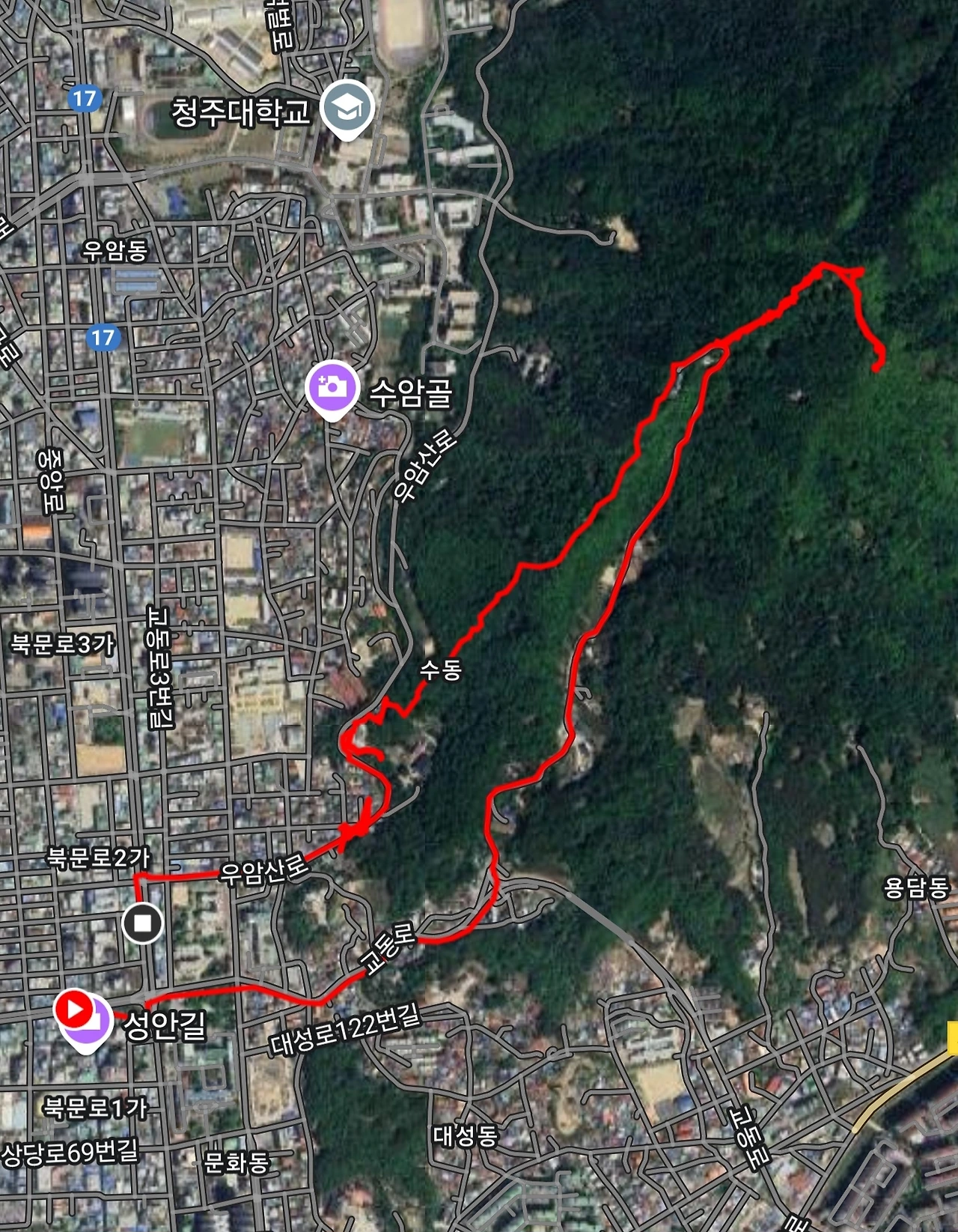 선물로 주려고 가지고 온 책을 다 주고 나니 가방은 텅 비었다. 이제 나 홀로 청주 시내에서 가장 가까운 산인 우암산으로 향한다. 511번 버스를 타고 도청 앞에서 내렸다. 성안로는 청주의 로데오거리인데 그 앞을 지났다. 상당공원을 지나 점차 오르막을 오르기 시작했다. 기나긴 골에는 문수암, 대현사 같은 사찰이 있었다. 포장도로가 끝나니 방송 송신소가 보였다. 우암산 정상은 거기서 그리 멀지 않았다. 정상 못 미쳐 전망대에 올라서니 청주 시내 전망이 탁 트였다. 전망대를 내려와 좀 더 걸으니 이번엔 청주 동쪽의 산악 지대가 펼쳐져 있었다. 국립청주박물관 부근에 드넓은 주차장이 내려다 보였다. 청주향교쪽으로 내려갈까 삼일공원쪽으로 내려갈까 하다가 삼일공원쪽을 택했다. 해발 353m. 그리 높은 산은 아니지만 그렇다고 낮지도 않다. 등산도로 곳곳으로 나 있다. 겨우 두 방향만 경험했는데 다른 방향으로 가볼 날도 있으리라. 청주향교쪽이나 청주박물관쪽이나 청주대학교쪽이나.