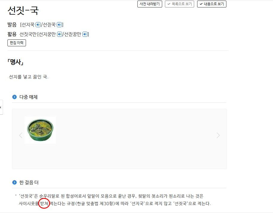 개탄스러운 것은 실은 '받치어'가 아니다. '선짓국'이 문제다. '받치어'야 '받치어'면 어떻고 '받쳐'면 어떤가. 같은 뜻이 아닌가. 규정이란 엄숙해 보여야 하니 '규정'이라는 문체적 특성상 준말이 아니고 본말로 썼다고 치자. 그러나 '선짓국'은 아니다.