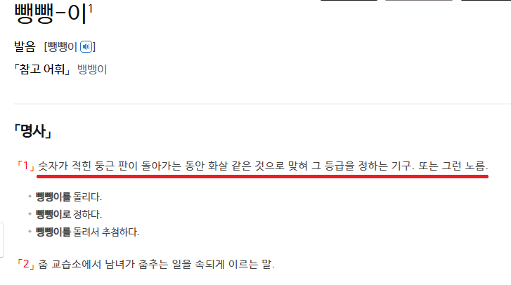 뺑뺑이는 앞의 미묘, 덩치남과 달리 국어사전에 올라 있었다. 문제는 뜻풀이였다. 국어사전은 이렇게 뺑뺑이를 풀이하고 있었다.