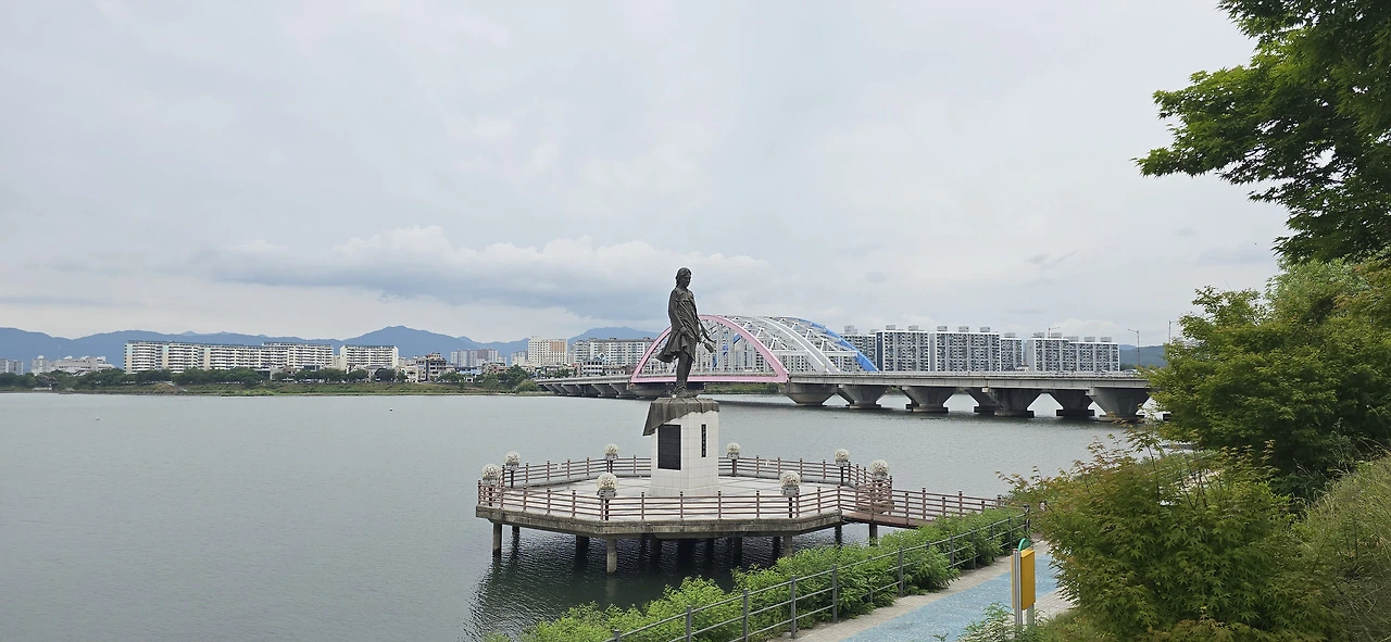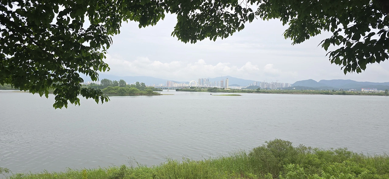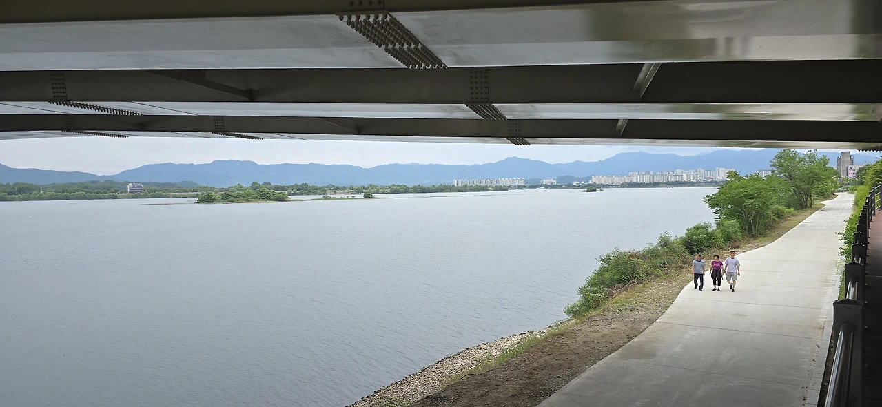 북쪽으로 걸음을 계속하는데 역시 길은 두 겹이다. 아래쪽은 강가의 시멘트길이고 위쪽은 자전거길인데 자전거길로 걸었다. 이따금 자전거 탄 사람들이 지나갔다. 계속 신매대교 방향으로 걷는데 멀리 신매대교가 보이기 시작하고 가까이에 작은 다리가 하나 나타났다. 고구마섬으로 이어지는 오미교다. 고구마섬은 중도에 비하면 아주 작은 섬이다. 곧이어 오른쪽으로 위락시설이 나타났다. 육림랜드였다. 이곳엔 놀이기구도 많지만 동물원이 있다. 아닌게아니라 거대한 몸집의 새가 몇 마리 웅크리고 앉아 있었다. 독수리로 보였다. 갑자기 날개를 펴니 몸집이 얼마나 큰지 여실히 드러났다. 하지만 그 모습을 보며 어찌나 안쓰럽던지! 야생에 있다면 얼마나 신나게 하늘을 휘젓고 다닐까. 그런데 동물원에 갇힌 신세가 되어 허구헌 날 저렇게 가만 웅크리고 있으니 어찌 마음이 아리지 않을까. 육림랜드를 지나니 신매대교가 나타났다. 다리를 건너기 시작했다. 꽤나 긴 다리였다. 신매대교는 위도 위에 놓여 있다. 대교 북쪽에는 과연 위로로 내려가는 길이 나 있었다. 위도의 다른 이름은 고슴도치섬이다. 신매대교 위에서 춘천 시내를 바라보며 의암호를 담은 사진을 몇 장 찍었다.