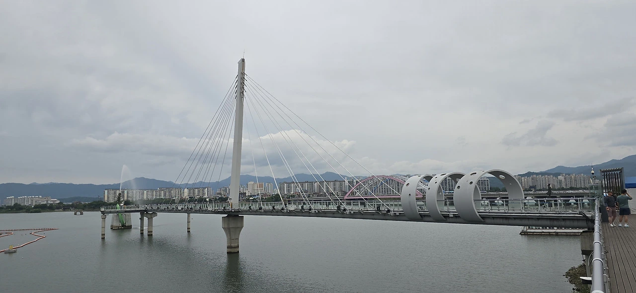 전철을 타고 춘천역에 내리니 벌써 12시가 좀 지나 있었다. 서서히 의암호 강변으로 접근했다. 호수가 펼쳐져 있었고 서울에선 보지 못하던 광경에 탄성이 절로 나왔다. 하중도로 향해 나 있는 춘천대교는 가운데 둥근 원이 아름다웠고 남쪽으론 삼악산이 아닌가 싶은 산이 저 멀리 우뚝 서 있었다. 바로 앞에는 넓은 잔디밭을 앞에 둔 대형카페가 건축미를 자랑하고 있었다. 몇 시간은 걸어야 하니 벤치에 앉아 가져온 먹거리를 점심으로 삼아 먹었다.