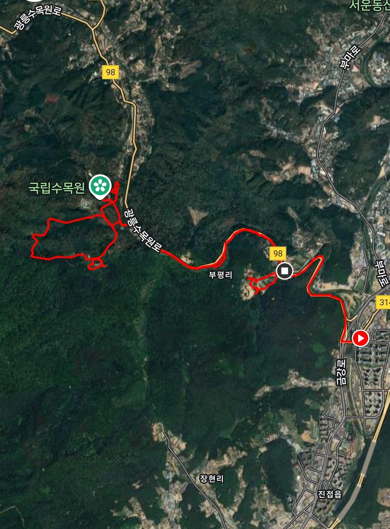 4호선을 타고 오남역에서 내렸다. 버스를 탔는데 그만 잘못 탔다. 반대 방향으로 가는 버스를 탔다. 그걸 깨닫고 급히 내려 길을 건너가 버스를 탔다. 그러느라 시간을 좀 지체했다. 부평교 다리를 건너 버스에서 내렸고 그때부터 걷기 시작했다. 봉선사까지 간 다음 거기서 다시 국립수목원까지 가는 거다.