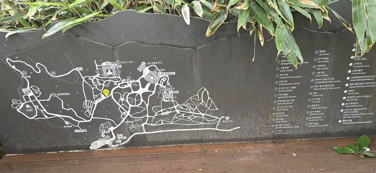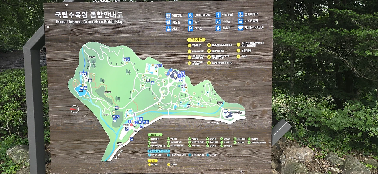 예전엔 미리 예약한 사람만 입장할 수 있었으나 지금은 그렇지 않아서일까. 꽤 사람들로 붐볐다. 다리를 건너니 넓은 길이 시작됐다. 너무 오랜만에 오는 거다 보니 국립수목원의 전체 윤곽이 그려지지 않았다. 지도가 붙어 있었으나 금세 파악될 리 없다. 길이 워낙 얼기설기 나 있어 어디부터 가야 할지 막막했다. 산림박물관으로 일단 목표를 정했다. 거기까지 가는 동안 별로 사람을 보지 못했다. 박물관 안에는 관람객이 많았지만... 가족 나들이 온 이들이 많았다. 부부가 어린 아들 셋을 데리고 왔는데 다섯 식구가 유니폼을 입은 모습이 눈길을 사로잡았다.