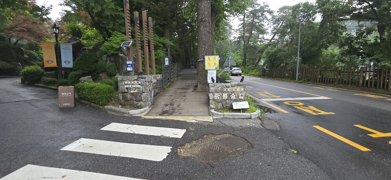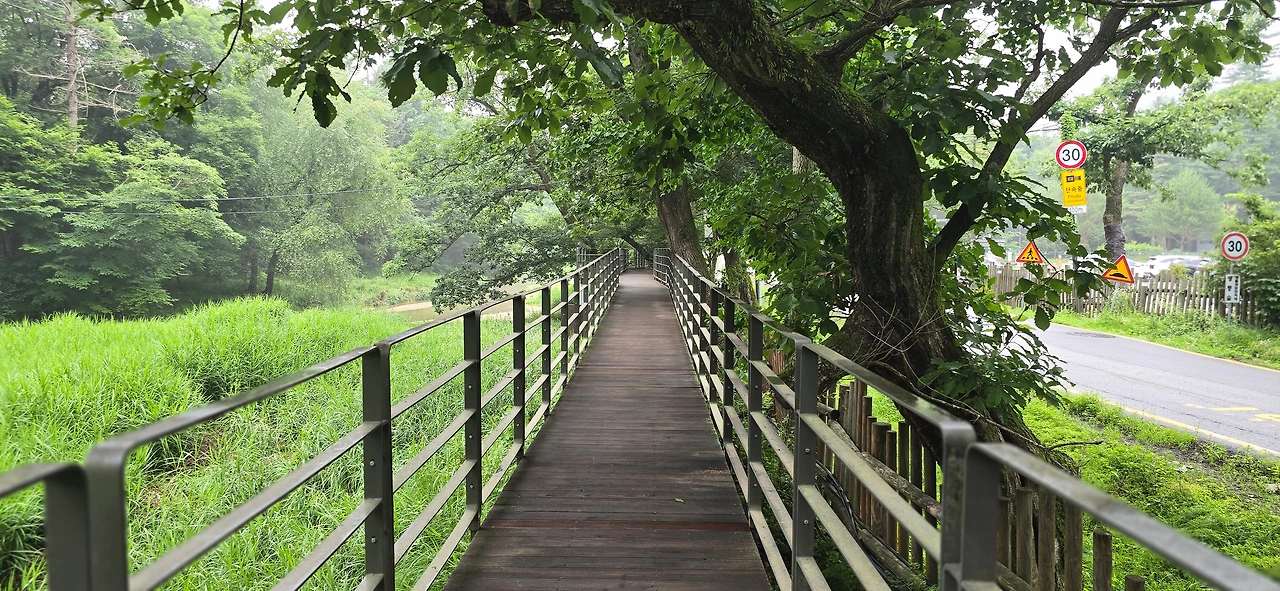 대로변에 국립수목원 가는 데크길이 있었다. 그걸 모르고 절 안으로 깊숙이 들어가 산길을 찾았으니 단단히 헛짚었다. 뒤늦게 찾은 데크길은 걷기가 아주 편안했다. 발로 나무를 딛는 느낌이 좋았고 무엇보다 경사가 없이 평평했다. 꾸준히 걷다 보니 봉선사천 너머에 광릉 입구가 보였고 거기서 좀 더 가니 드디어 국립수목원 정문이었다.